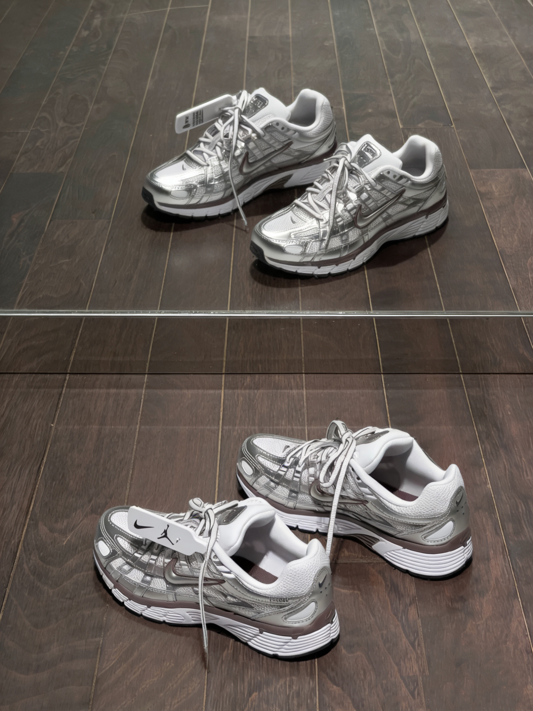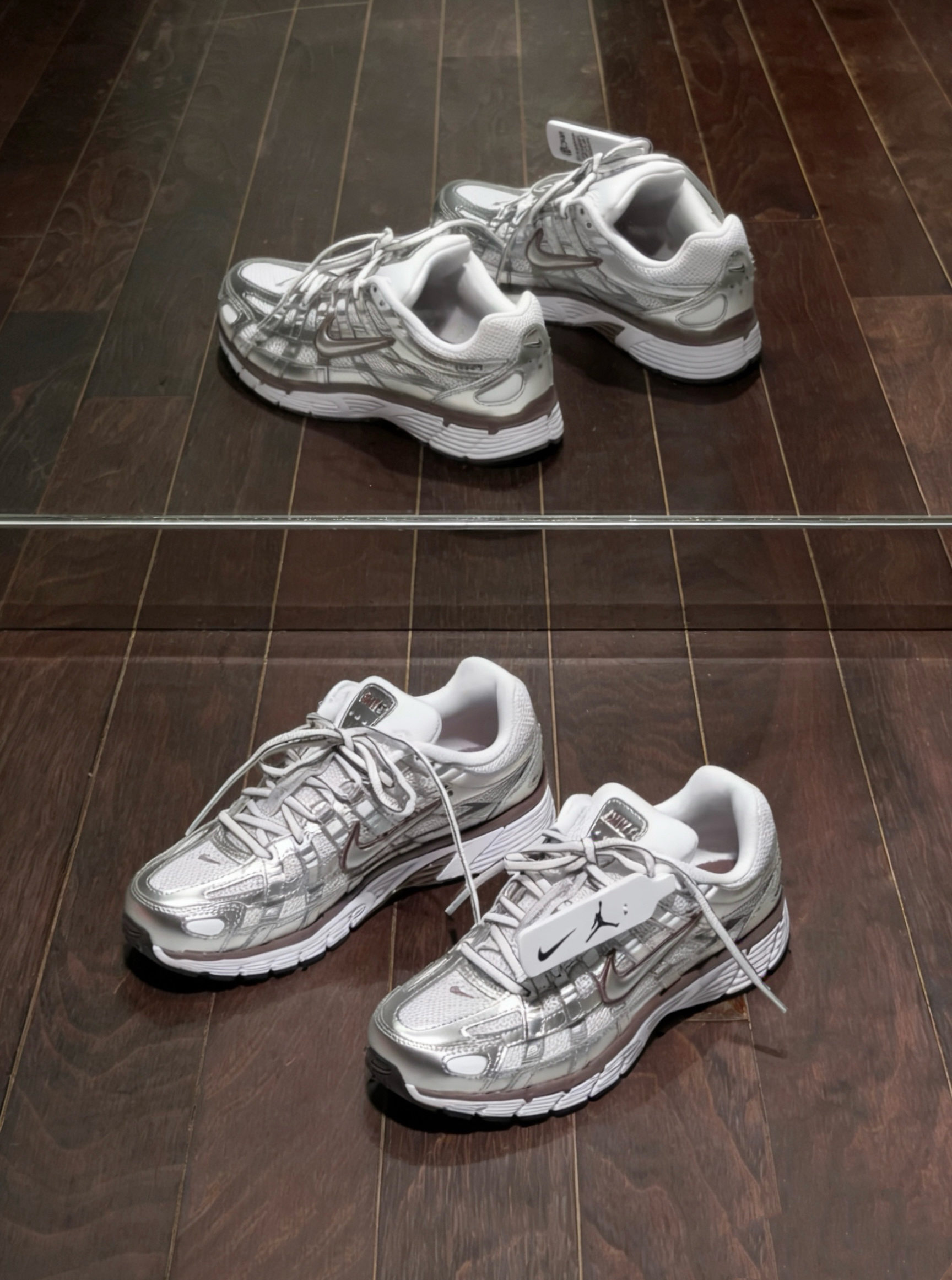 整双鞋以大面积的银色金属质感材质为主,搭配白色网眼布和酒红色细节点缀,瞬间梦回2000年的运动潮流。标志性的多层结构和线条感,让鞋身充满了未来科技感,同时又不失复古韵味。鞋侧的Swoosh Logo采用了金属质感的材质,在光线下折射出细腻的光泽,鞋跟处的“P-6000”字样则点明了它的身份。