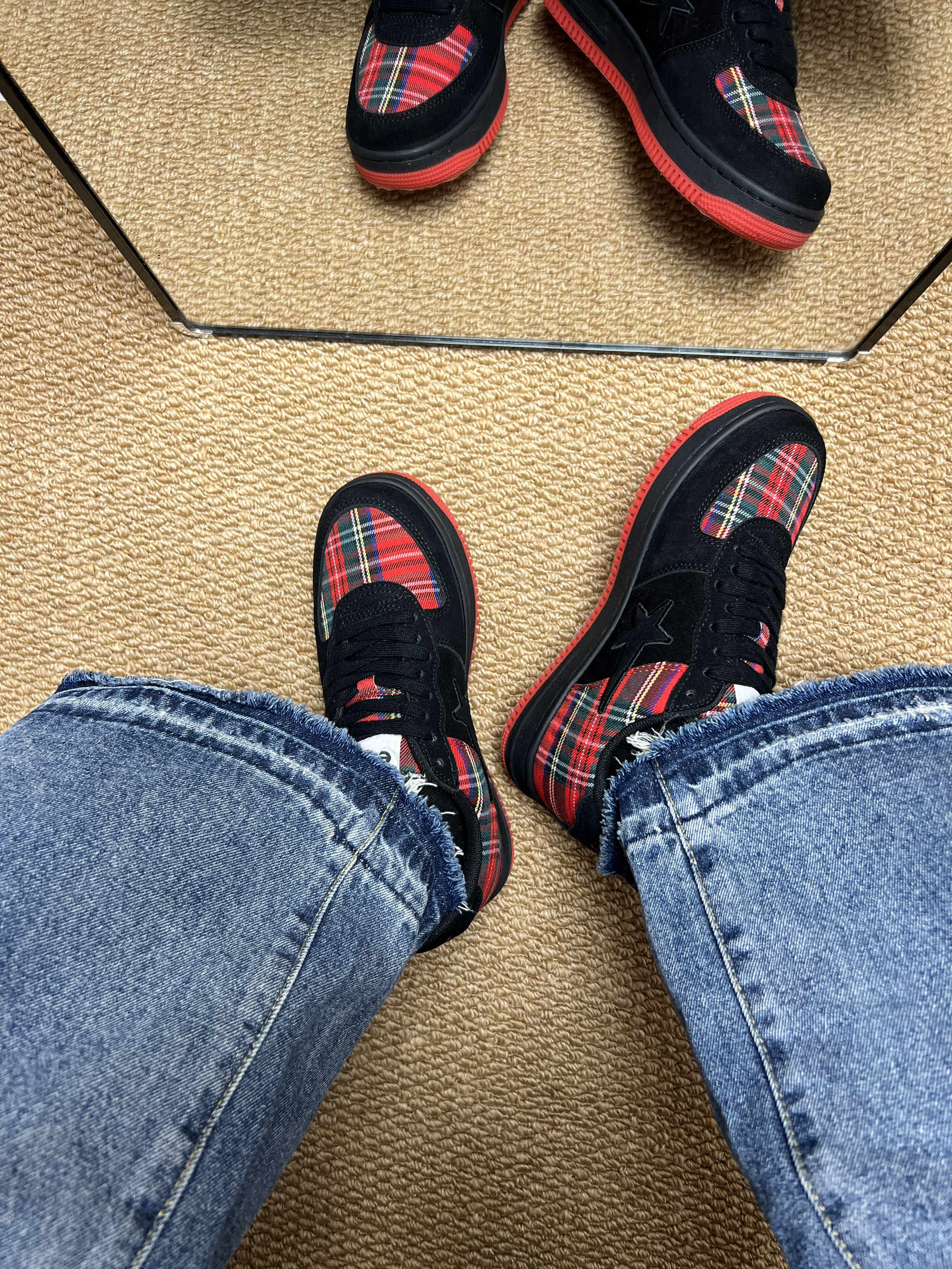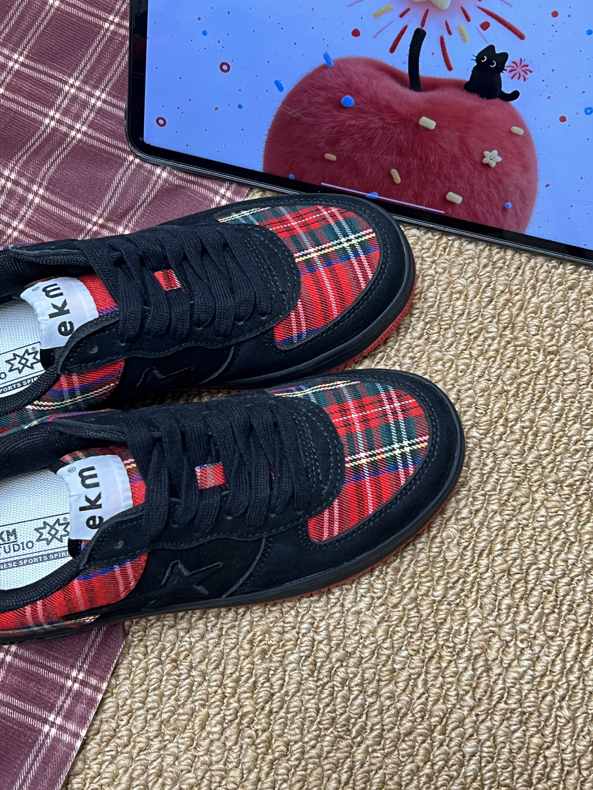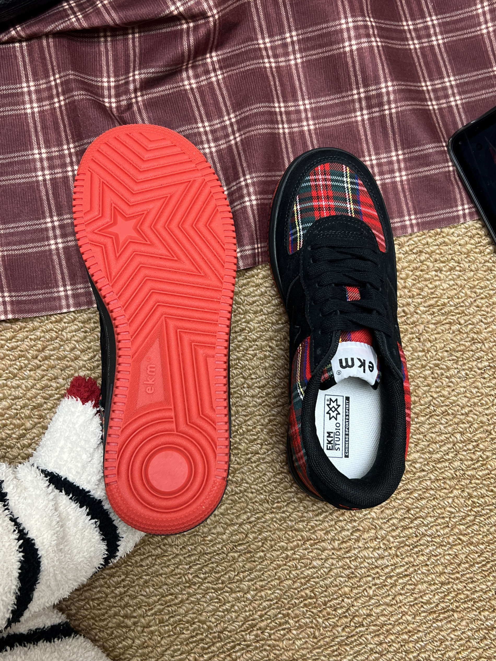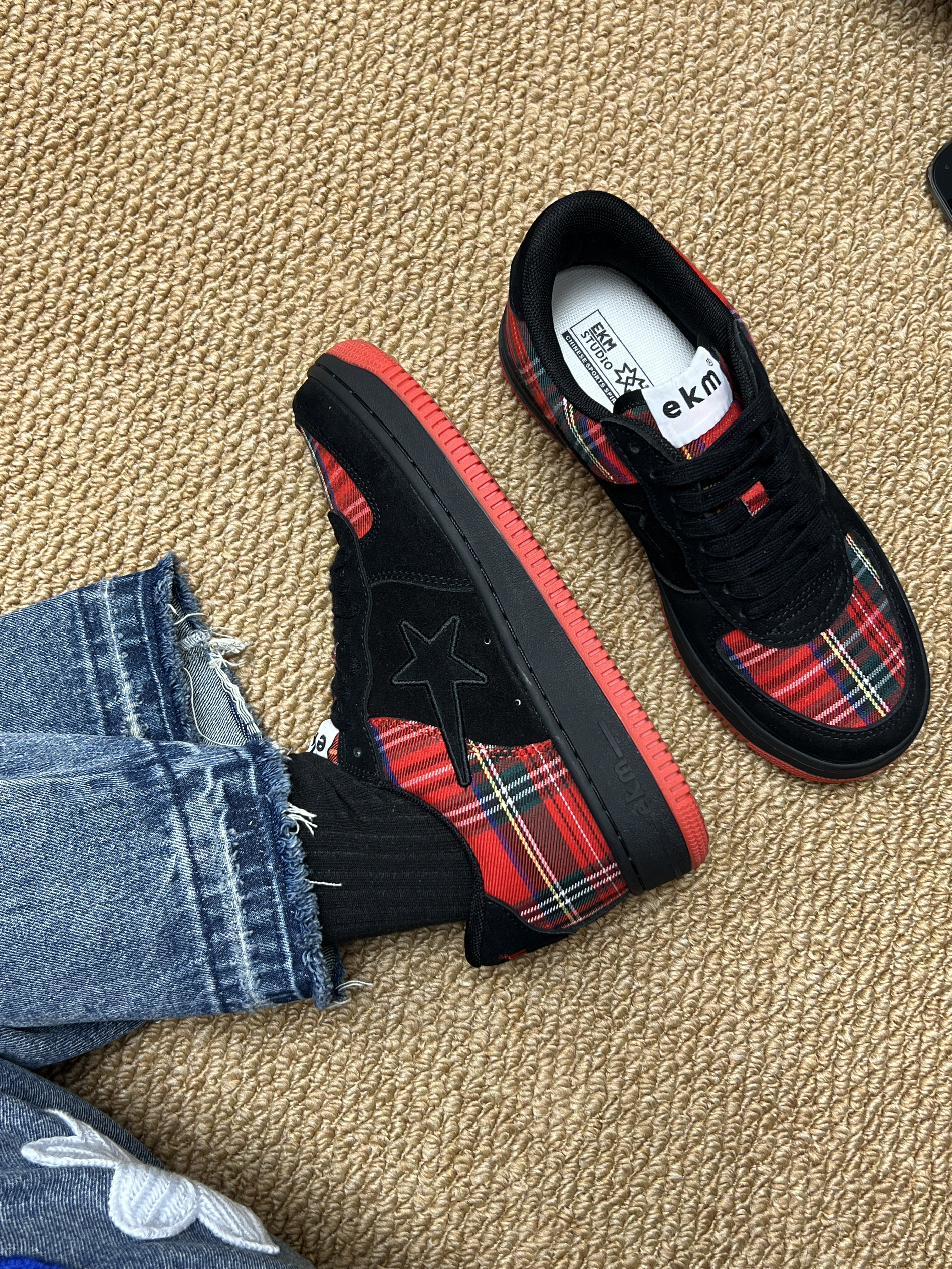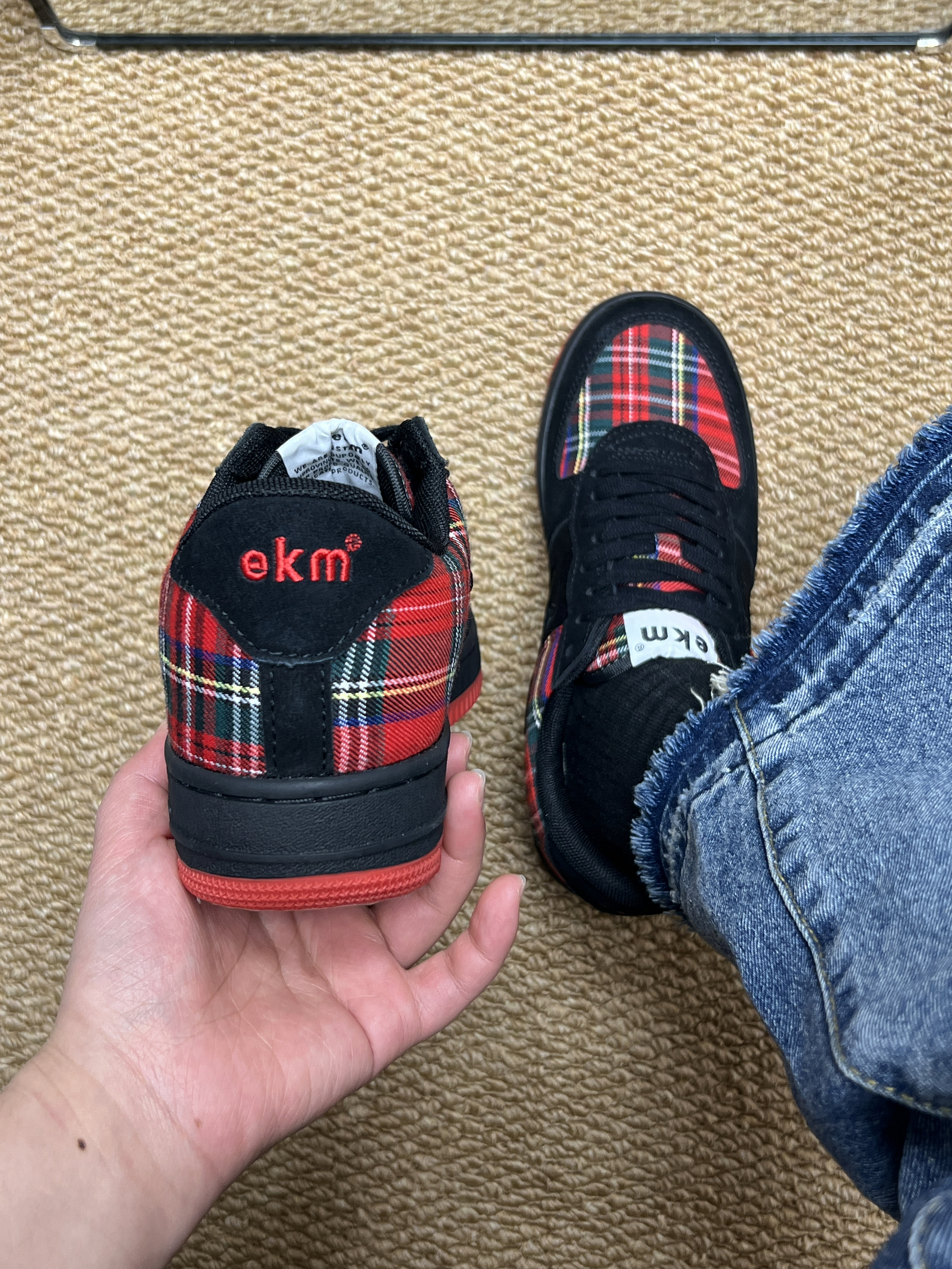 最近入手了 EKM 这双小众设计的复古板鞋👟 翻毛皮搭配“苏格兰情调”的牛仔布 复古感拉满⭐️ 鞋子整体黑红配色为主 协调 不会显得突兀 红色橡胶大底防滑耐磨 我个人喜欢鞋后跟的刺绣logo 有辨识度☁️ 鞋子舒适度👌鞋码标准(我脚微胖 正常尺码 亲测百搭 我搭配的牛仔裤就🆗 想要一款小众不容易撞款的鞋子 介双✅ 作为情侣👫鞋子也不戳哦