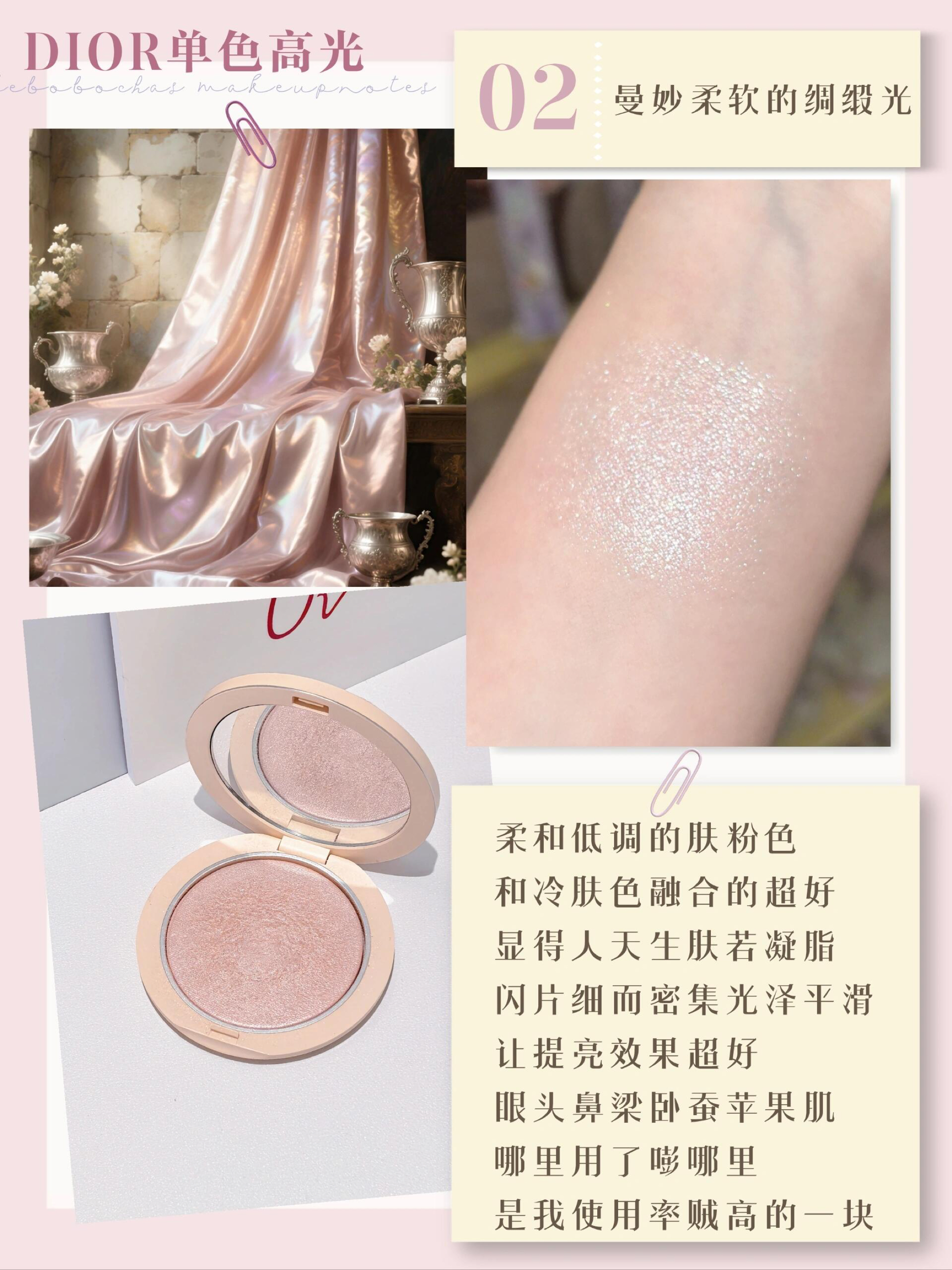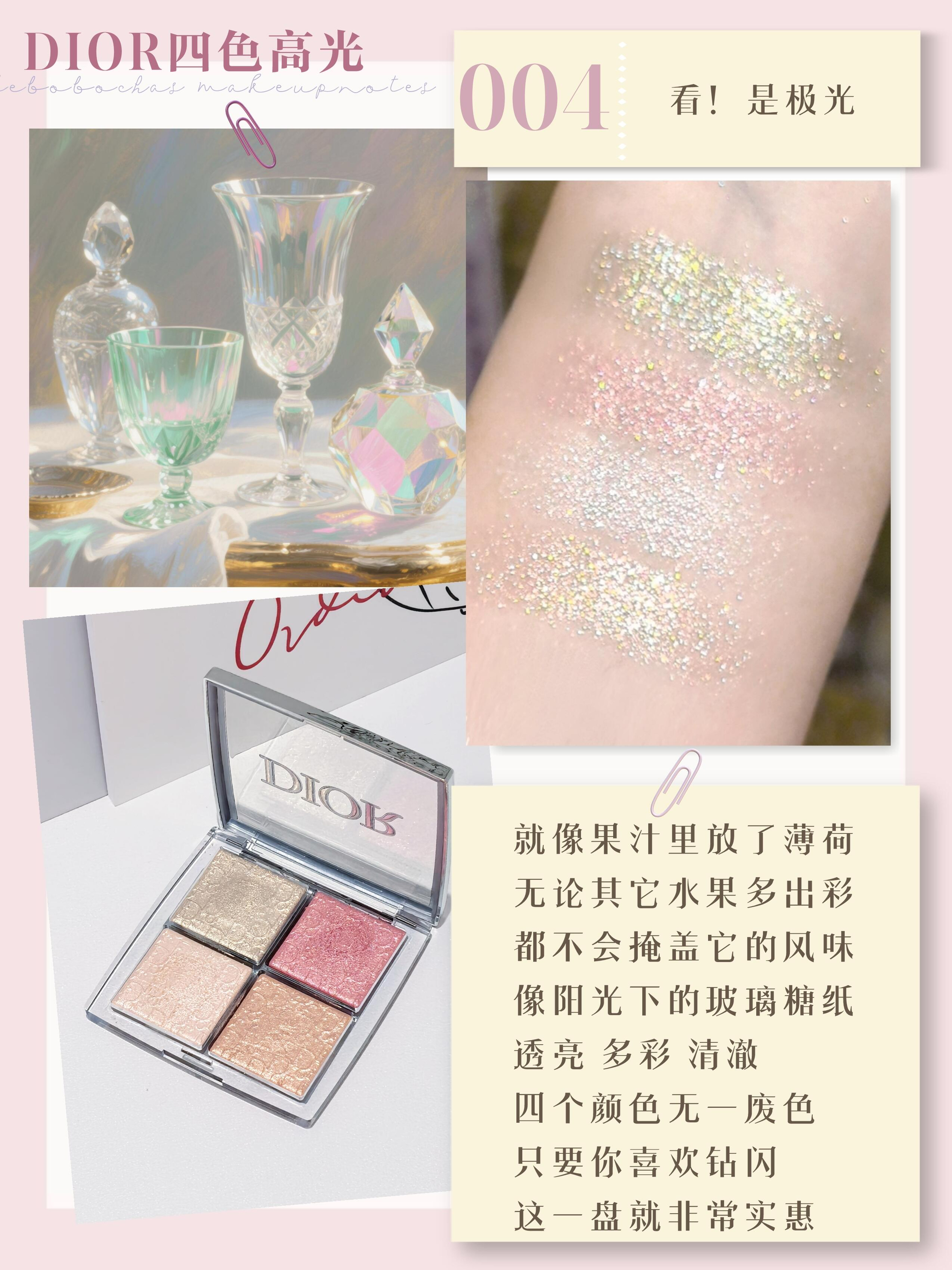 本篇笔记关联了Stila 天堂幻彩魔术高光膏 10g 香槟白、Dior/迪奥 后台系列四色高光盘 自然细闪提亮肤色 10g 004ROSE GOLD、Dior/迪奥 2022年夏季限定皮革高光 细闪提亮肤色 02 钻闪粉 PINK GLOW等商品,为用户提供真实的使用体验和购买参考。