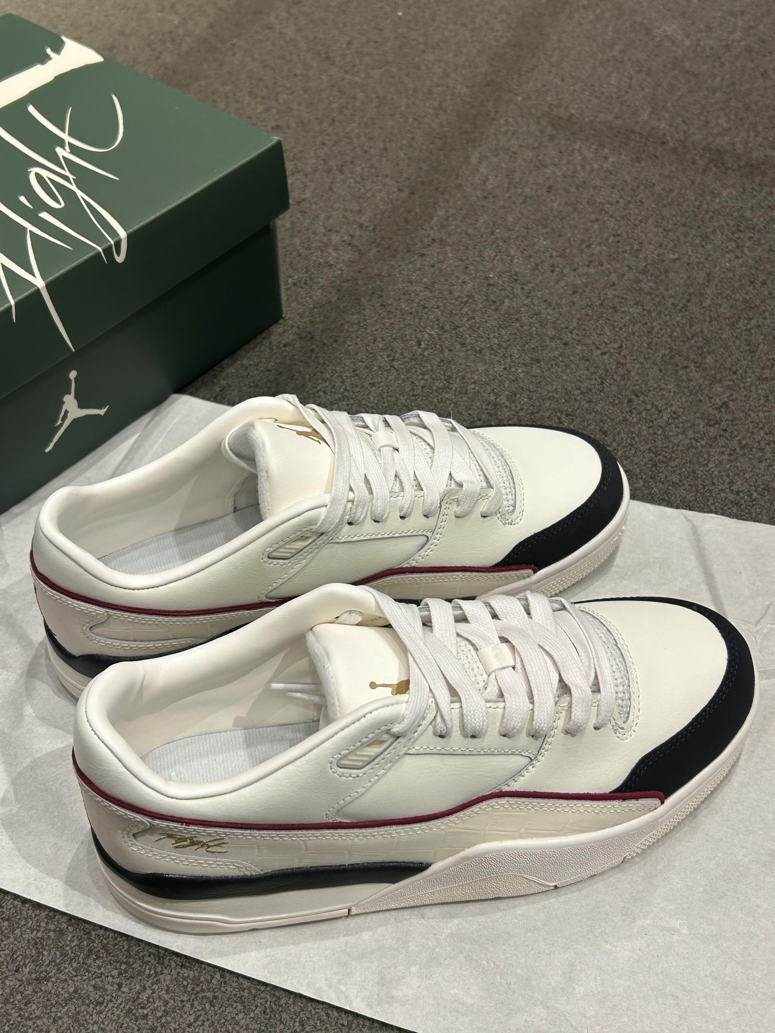 Nike 新配色~复古白黑配色好高级呀! 新品 FLIGHT COURT 低帮复古鞋型 鞋面以米白皮革材质为主 侧沿酒红线条勾勒轮廓鳄鱼皮纹路 后跟点缀Flight金标刺绣 很干净的配色 脚感质感通通在线