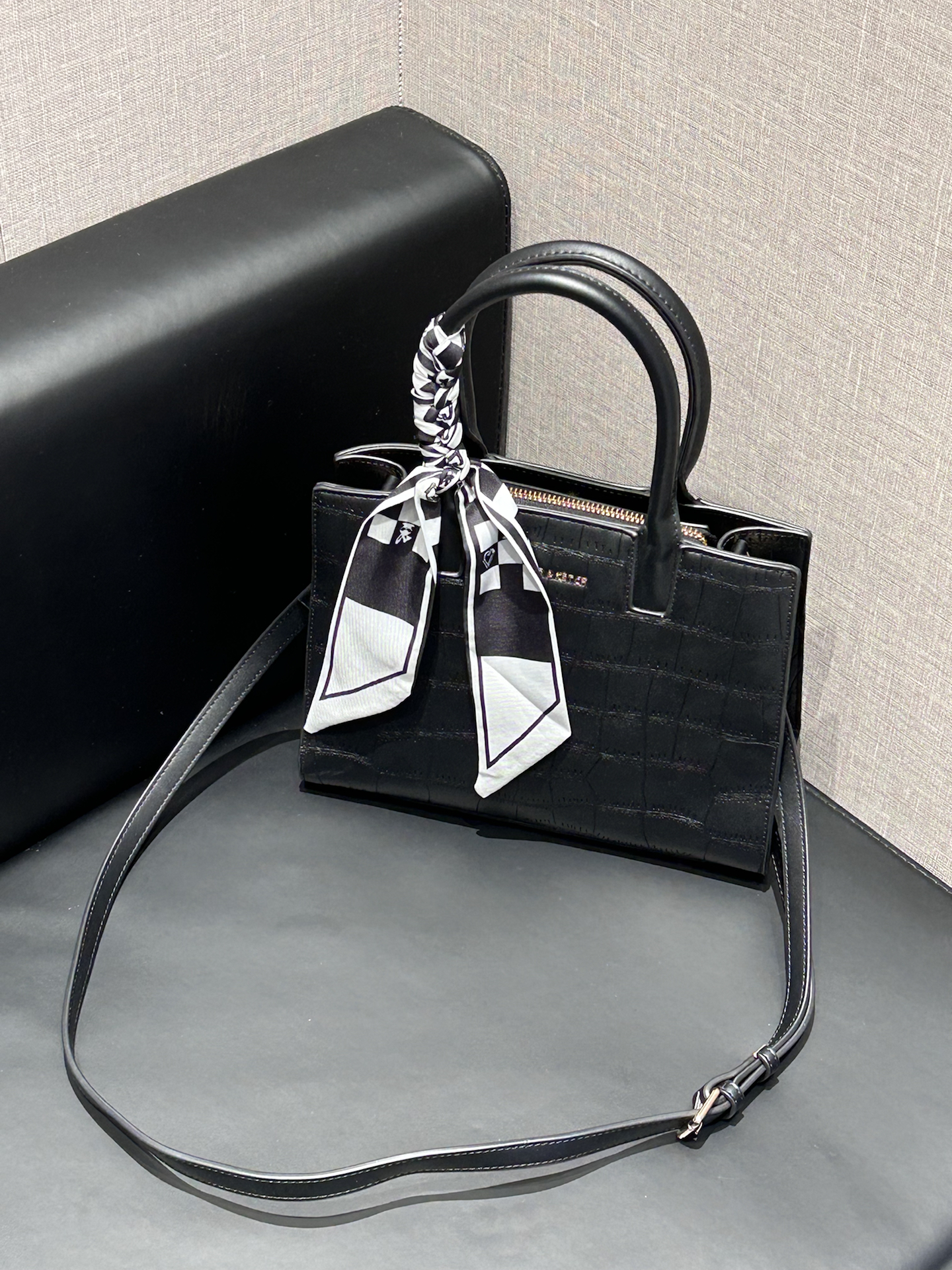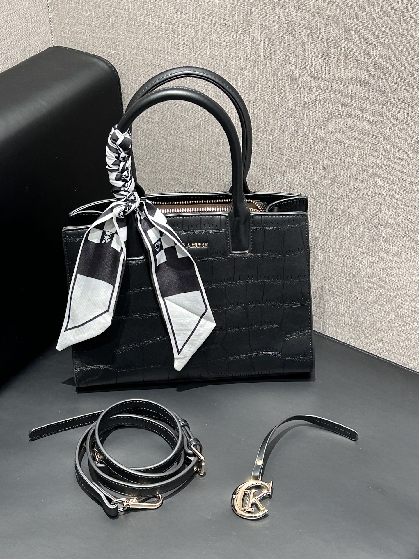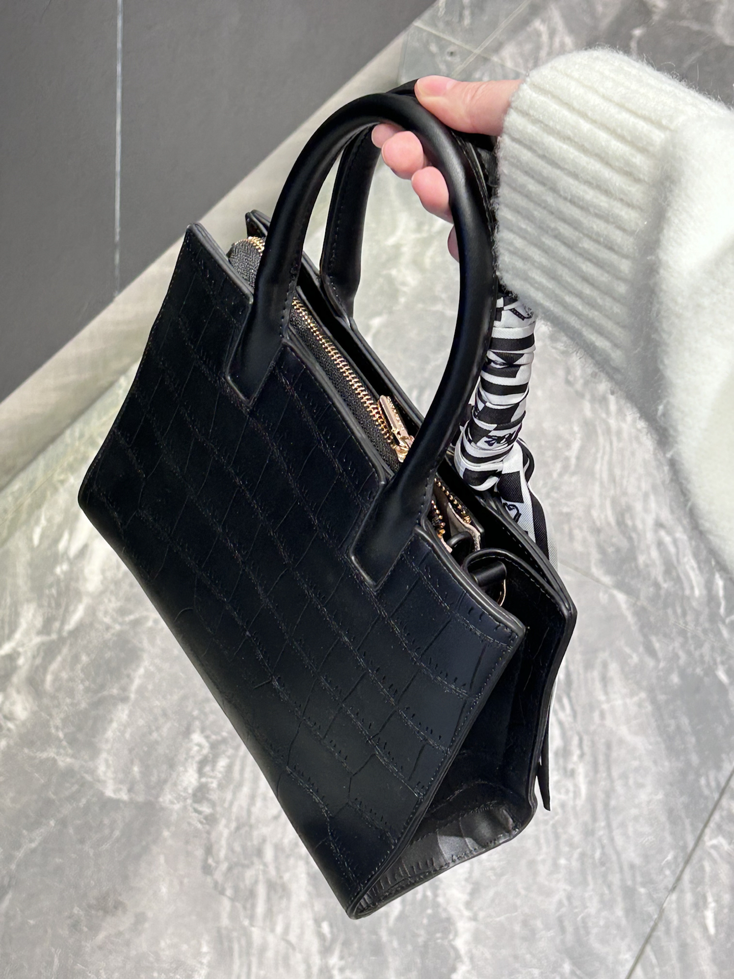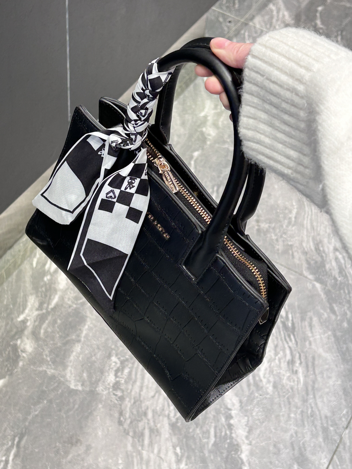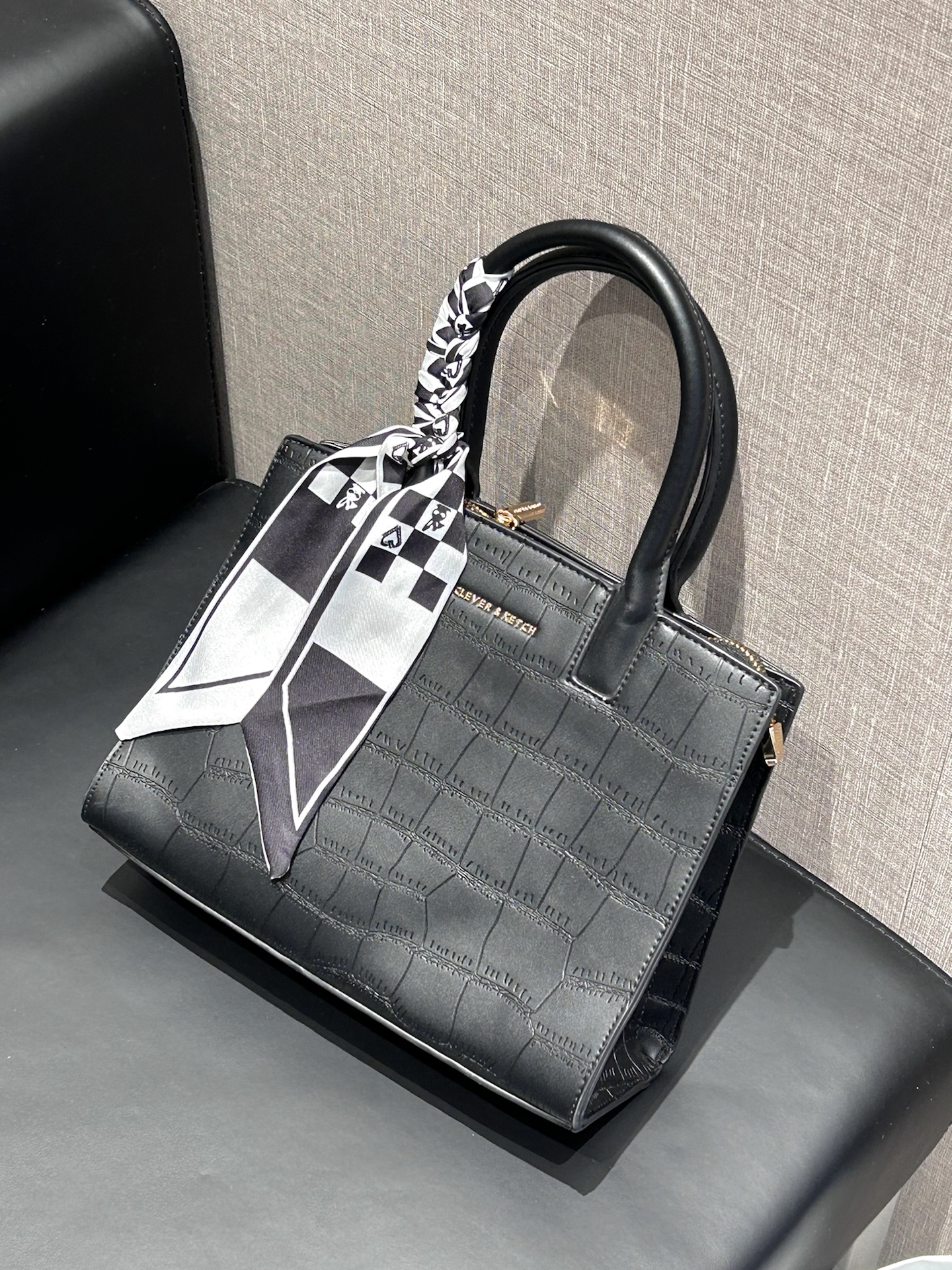 康康我又挖到了什么宝藏包包捏 介个黑色鳄鱼纹托特包真嘟很戳我 是那种酷酷的哑光质感 搭配了黑白棋盘格丝巾 系在手柄上还蛮有氛围感耶 容量日常我觉得也是够用的 装个手机、补妆包啥的阔以 手提蛮显气质的 还能斜挎 通勤或者约会都合适耶 #CLEVER&KETCH #年度爱用包 #马年开运包 #带新包回家过年 #秋冬本命托特包