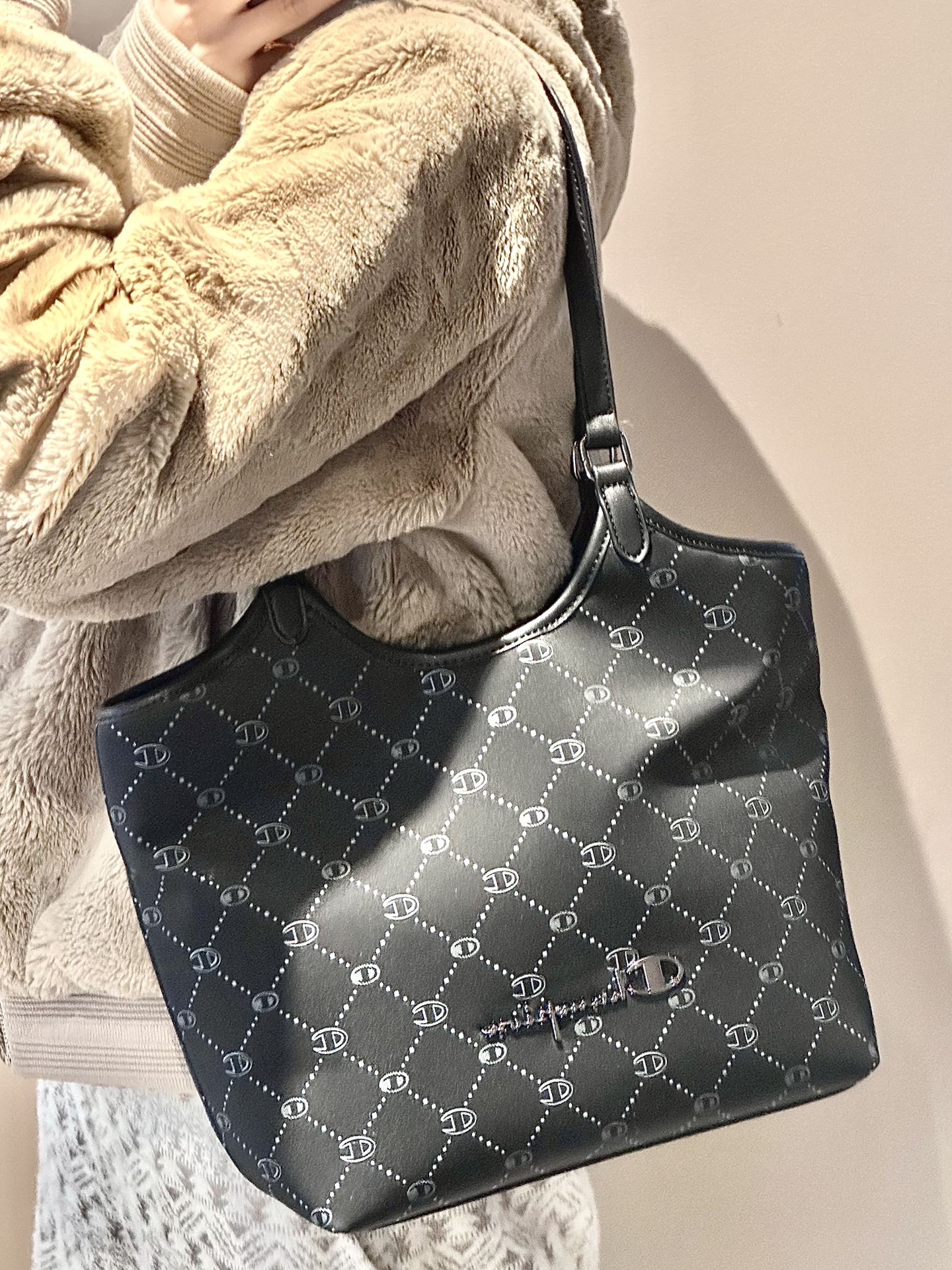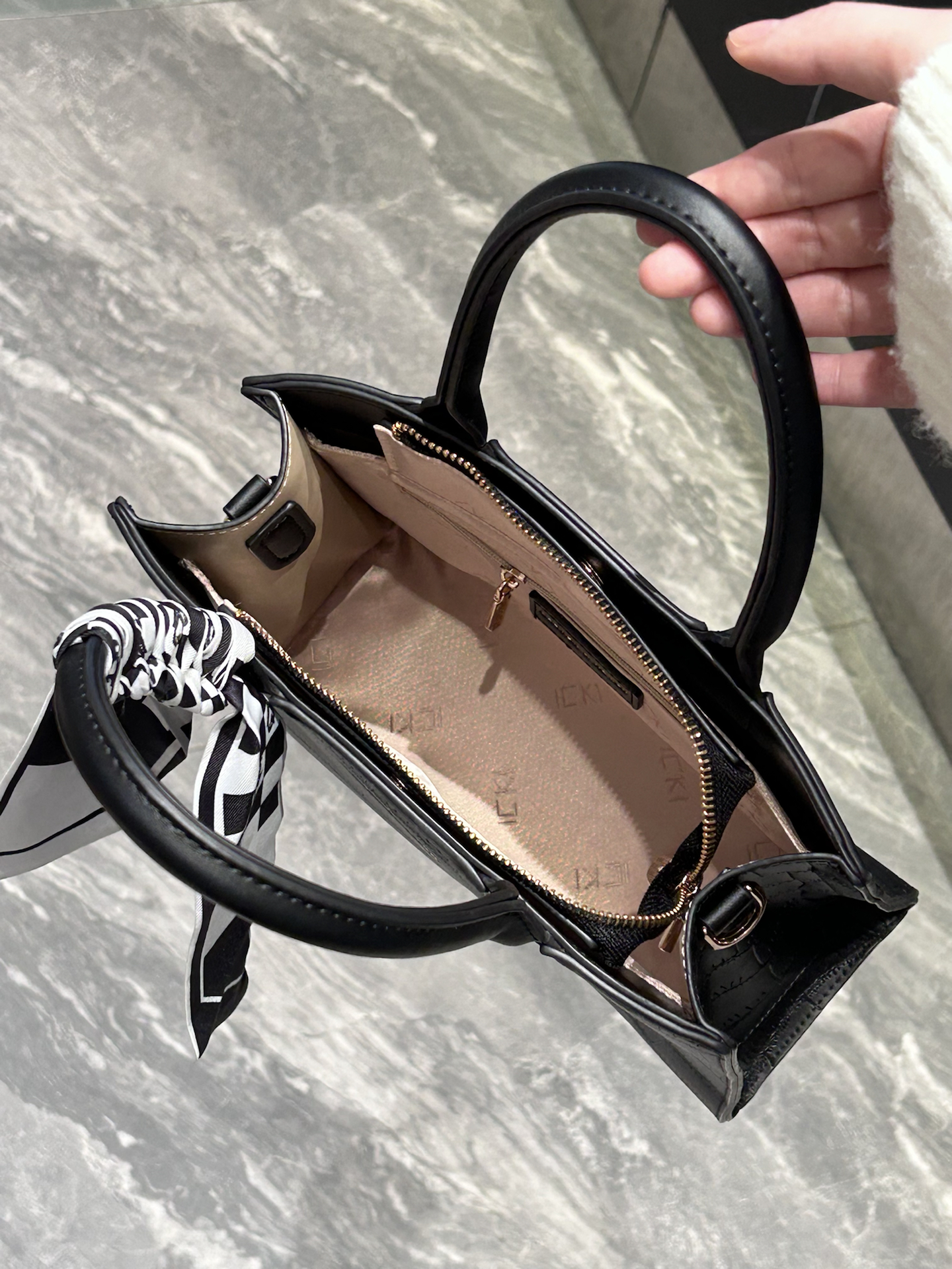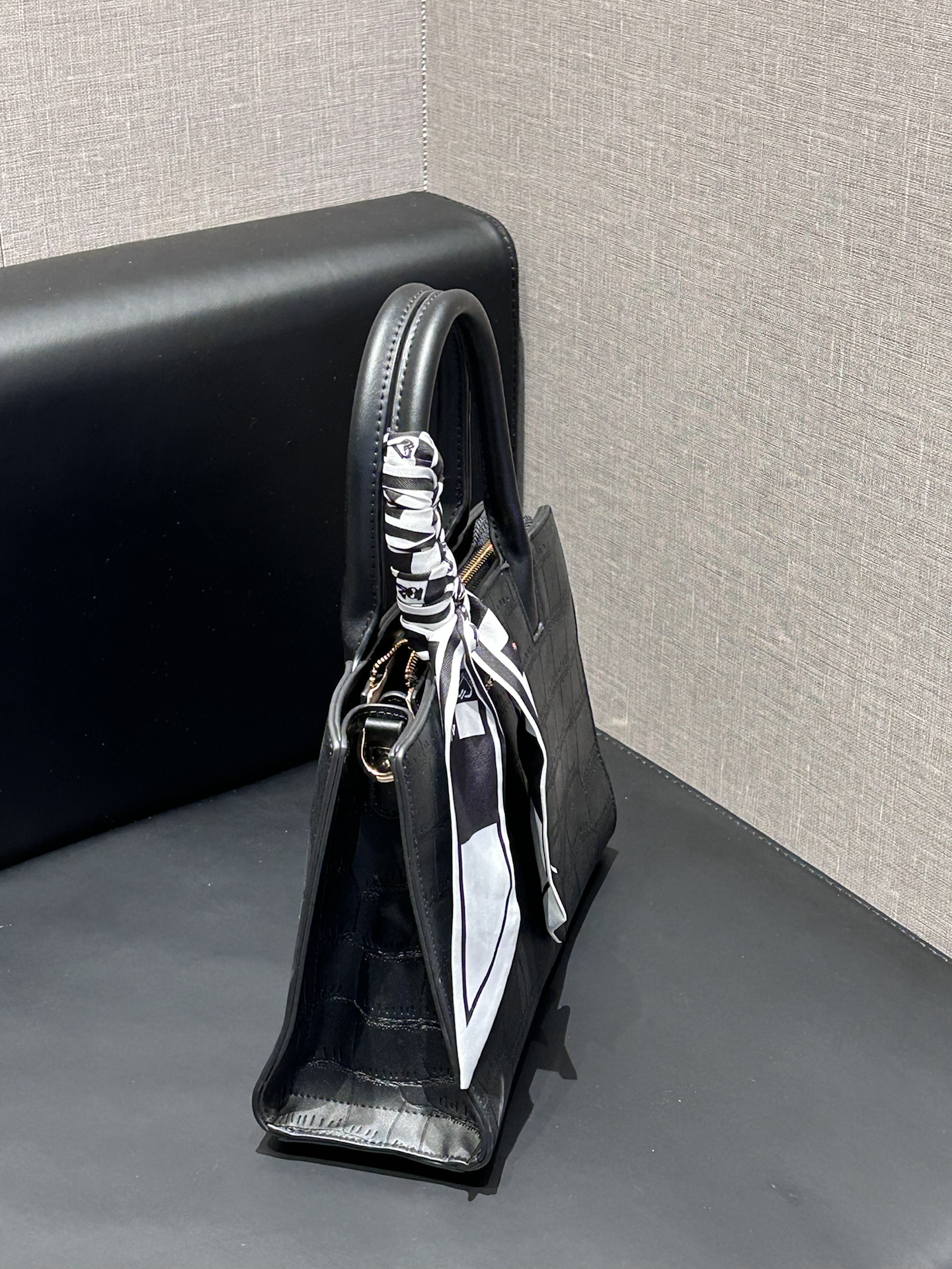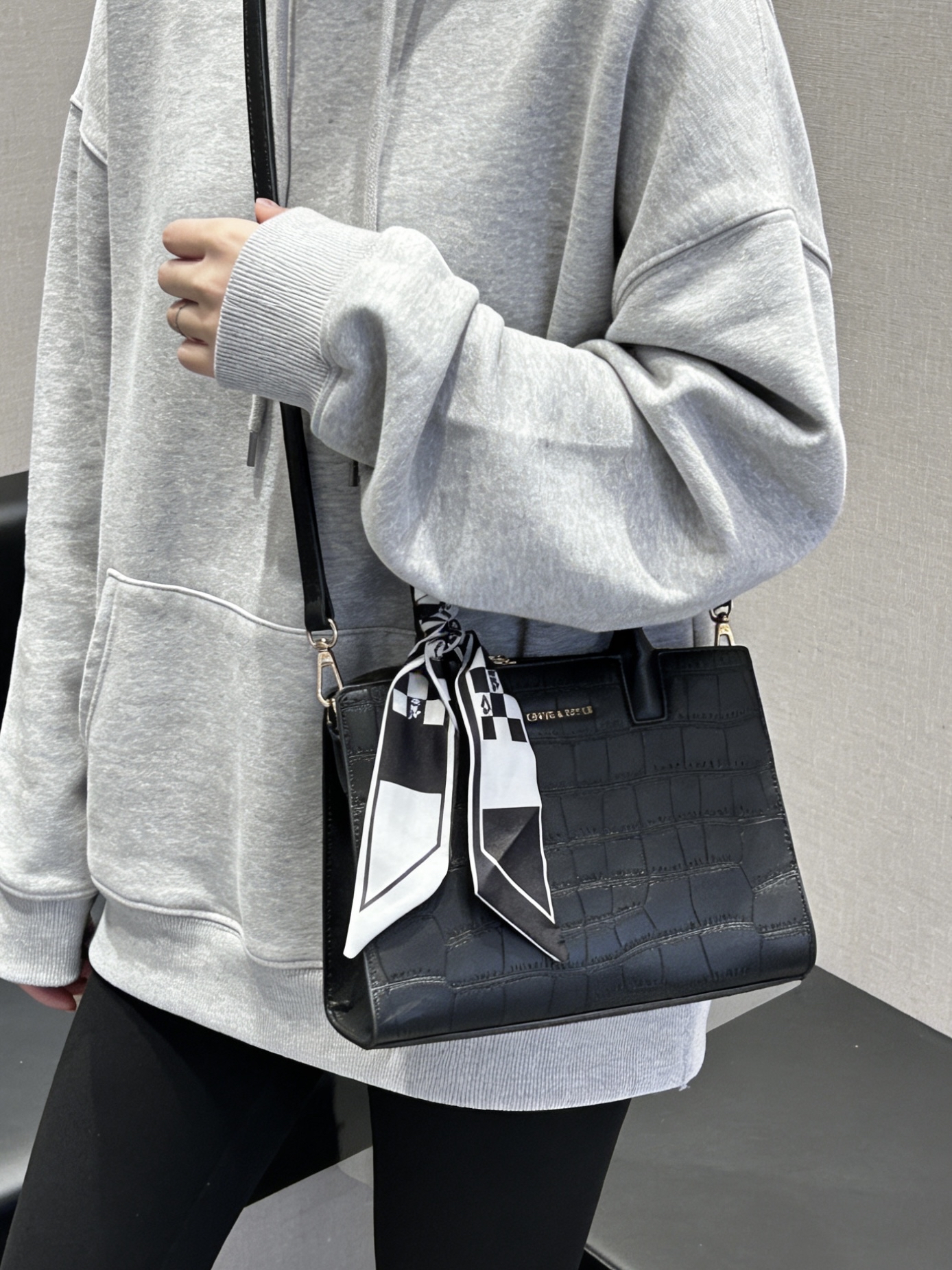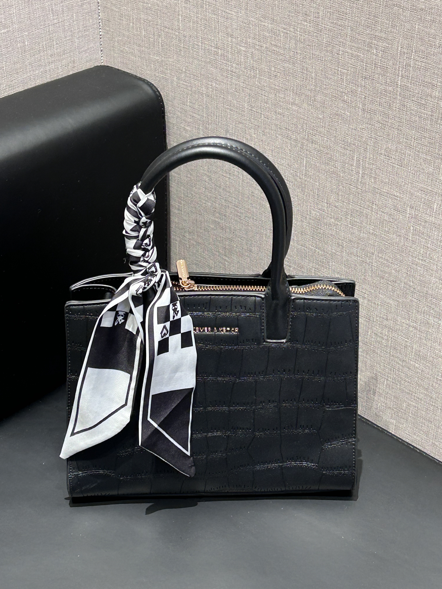康康我又挖到了什么宝藏包包捏 介个黑色鳄鱼纹托特包真嘟很戳我 是那种酷酷的哑光质感 搭配了黑白棋盘格丝巾 系在手柄上还蛮有氛围感耶 容量日常我觉得也是够用的 装个手机、补妆包啥的阔以 手提蛮显气质的 还能斜挎 通勤或者约会都合适耶 #CLEVER&KETCH #年度爱用包 #马年开运包 #带新包回家过年 #秋冬本命托特包