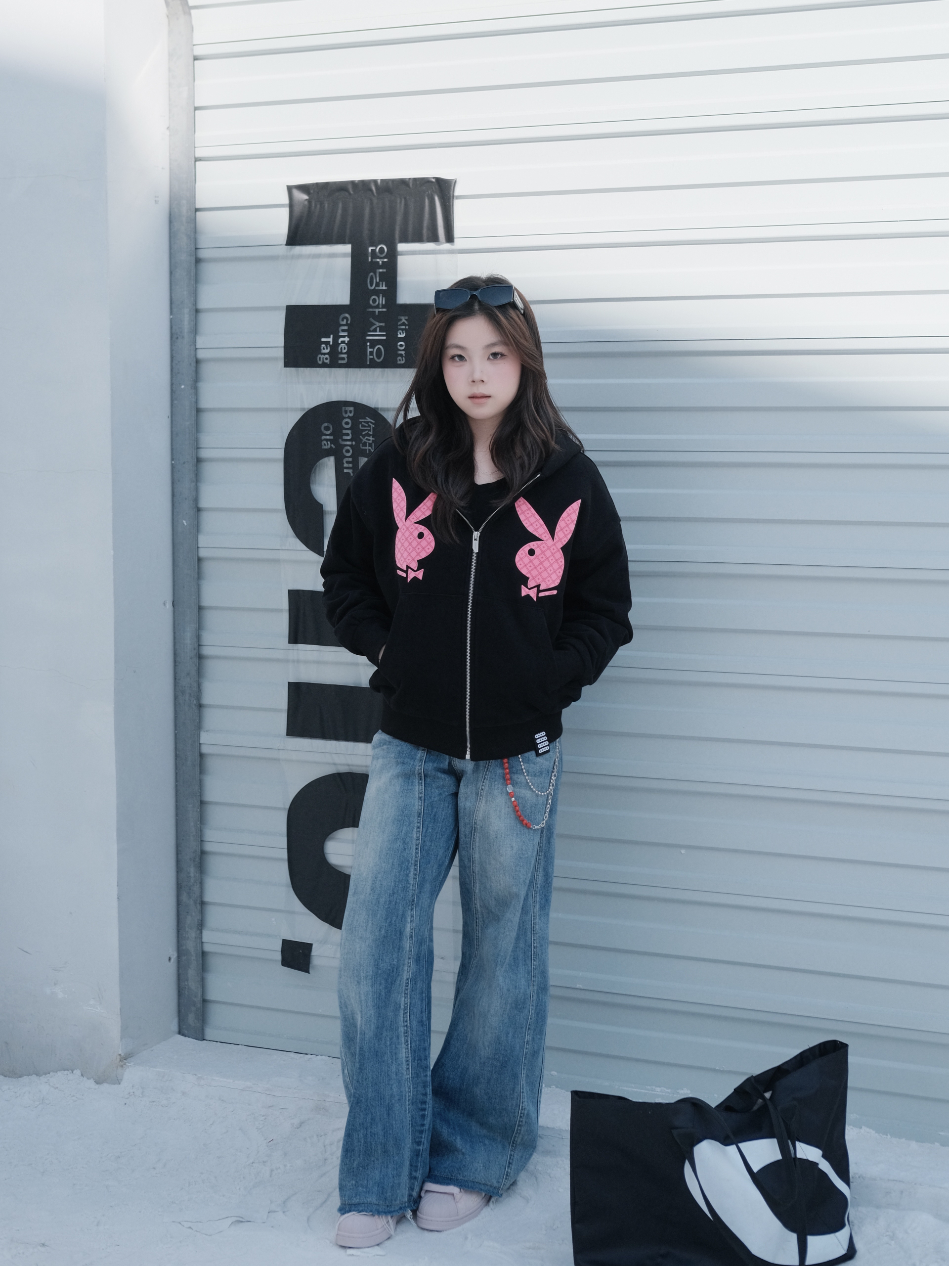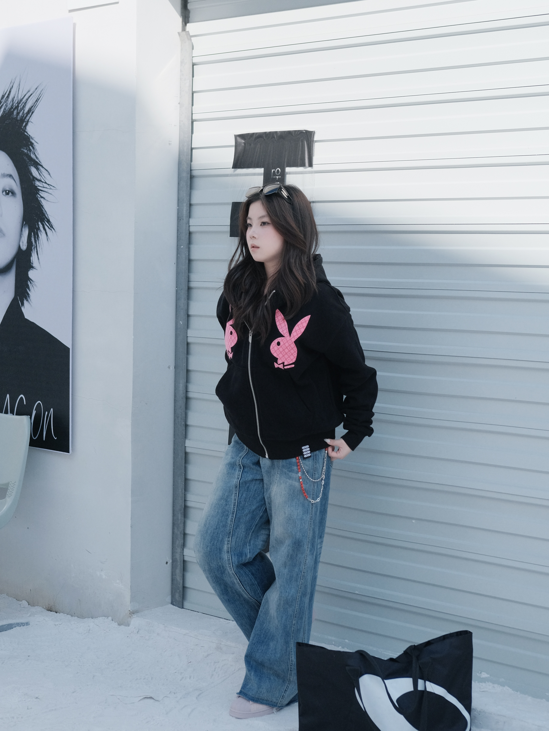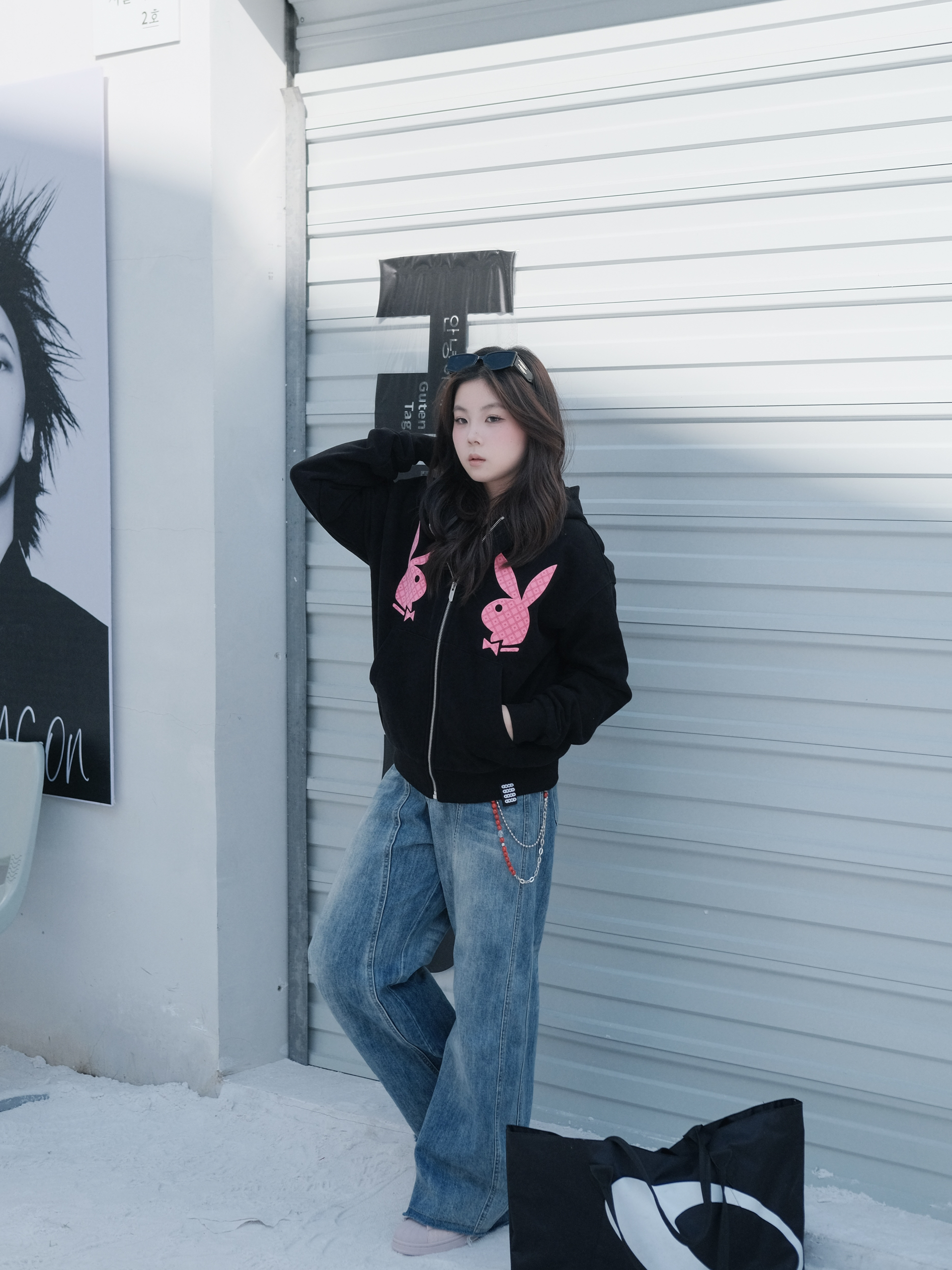 GB联名playboy的这件外套很独特 黑粉配色加上前后兔子logo 黑色外套也能穿的有个性 下身搭配牛仔裤 出门休闲又时髦