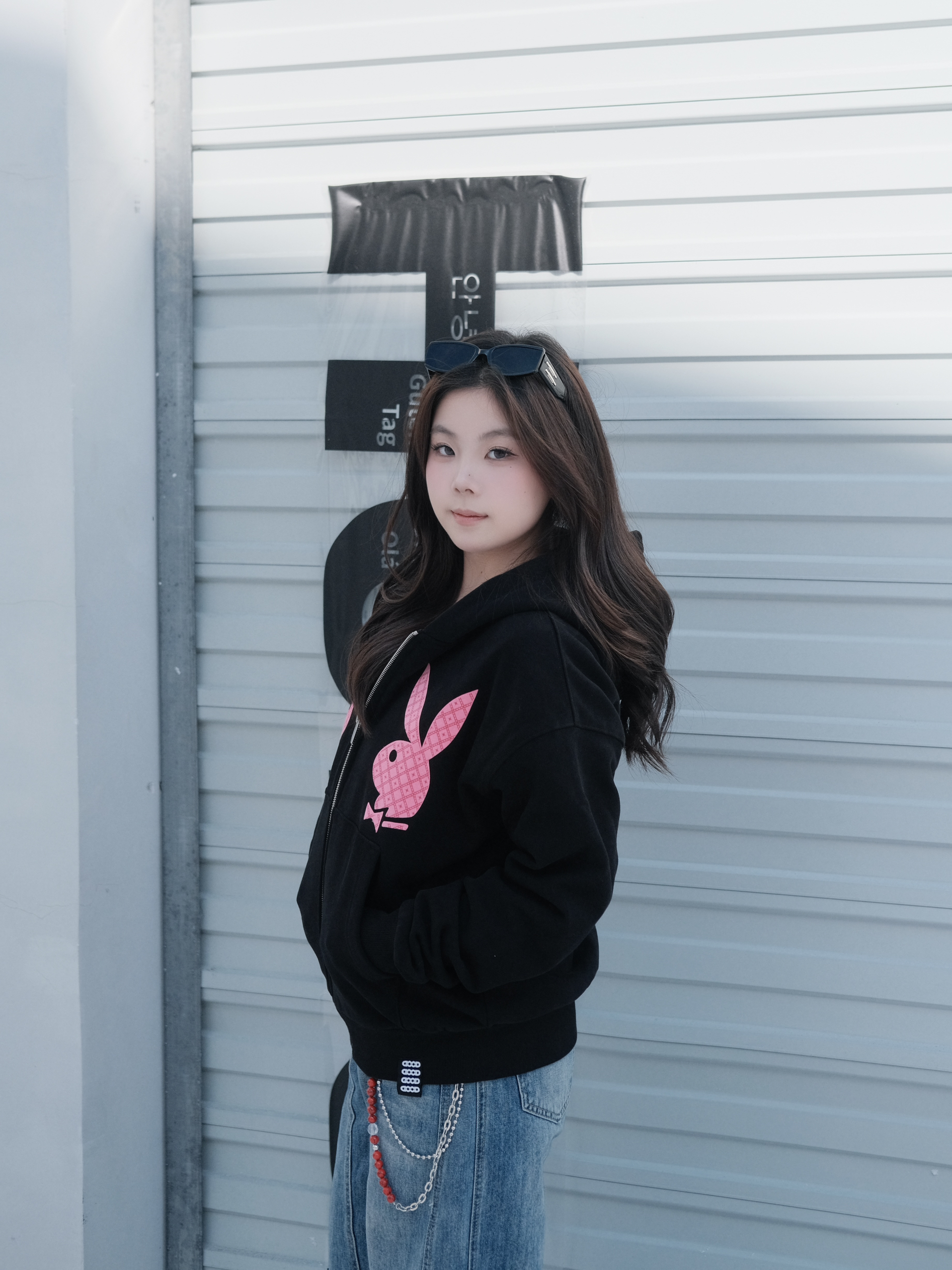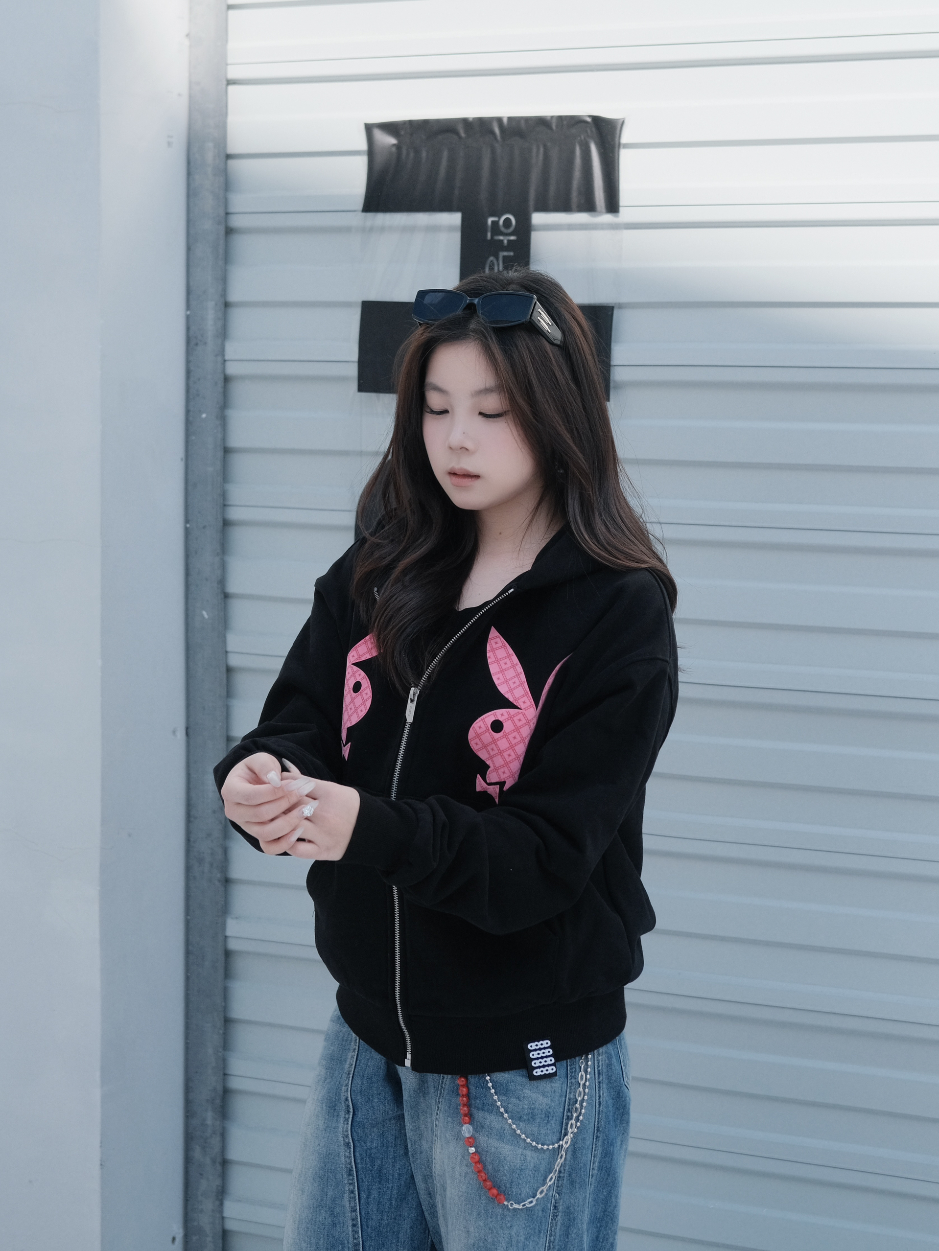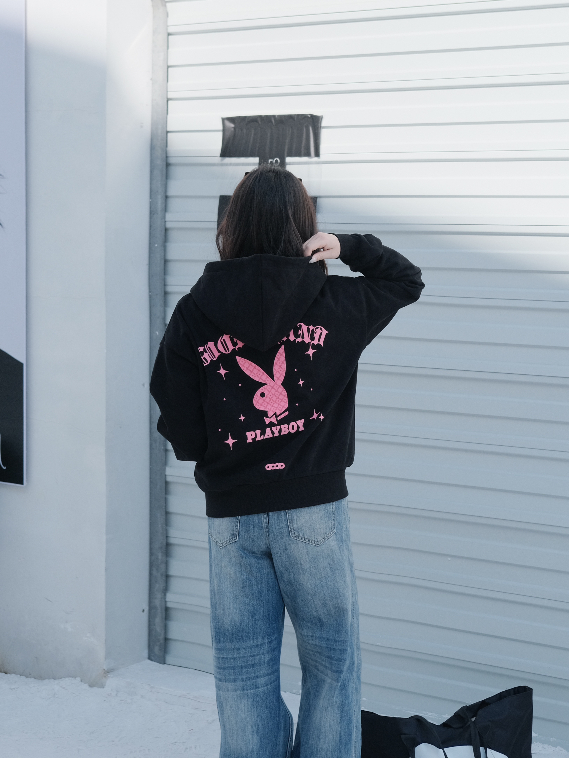 GB联名playboy的这件外套很独特 黑粉配色加上前后兔子logo 黑色外套也能穿的有个性 下身搭配牛仔裤 出门休闲又时髦