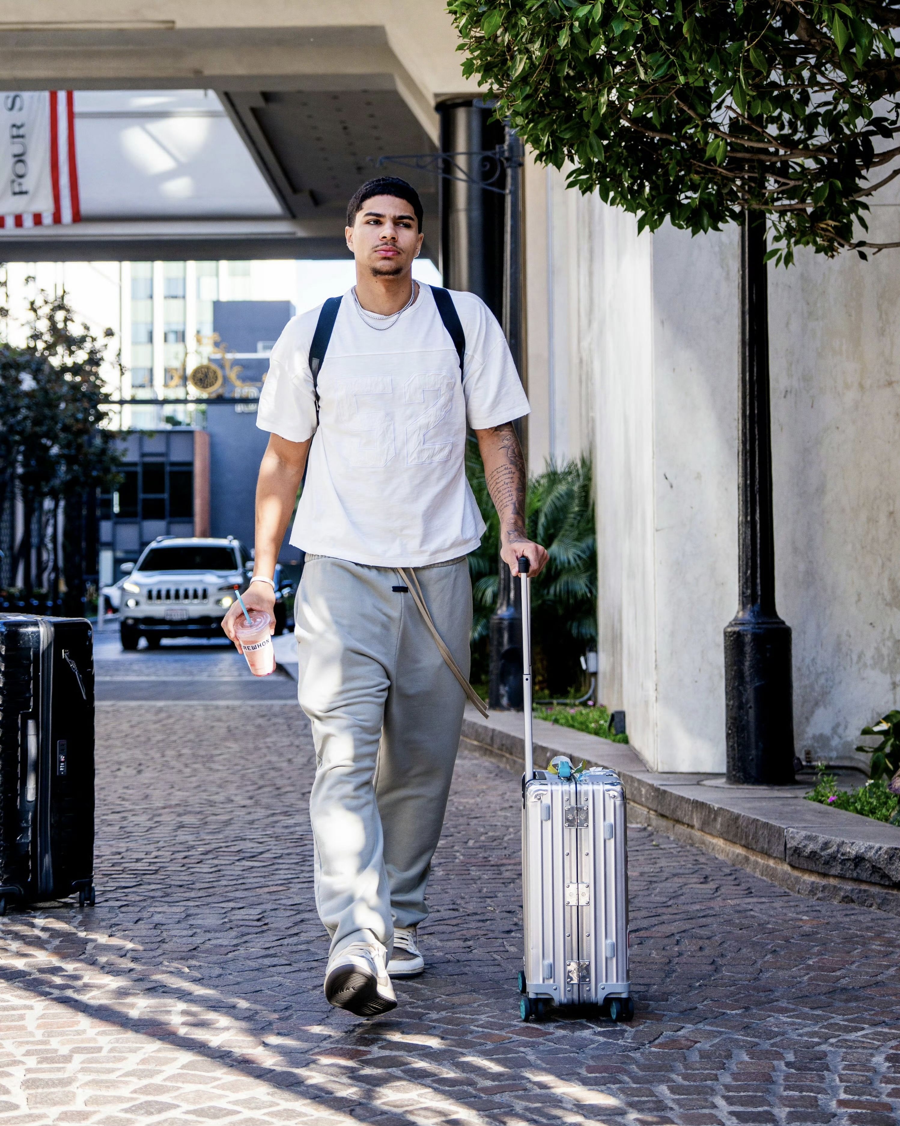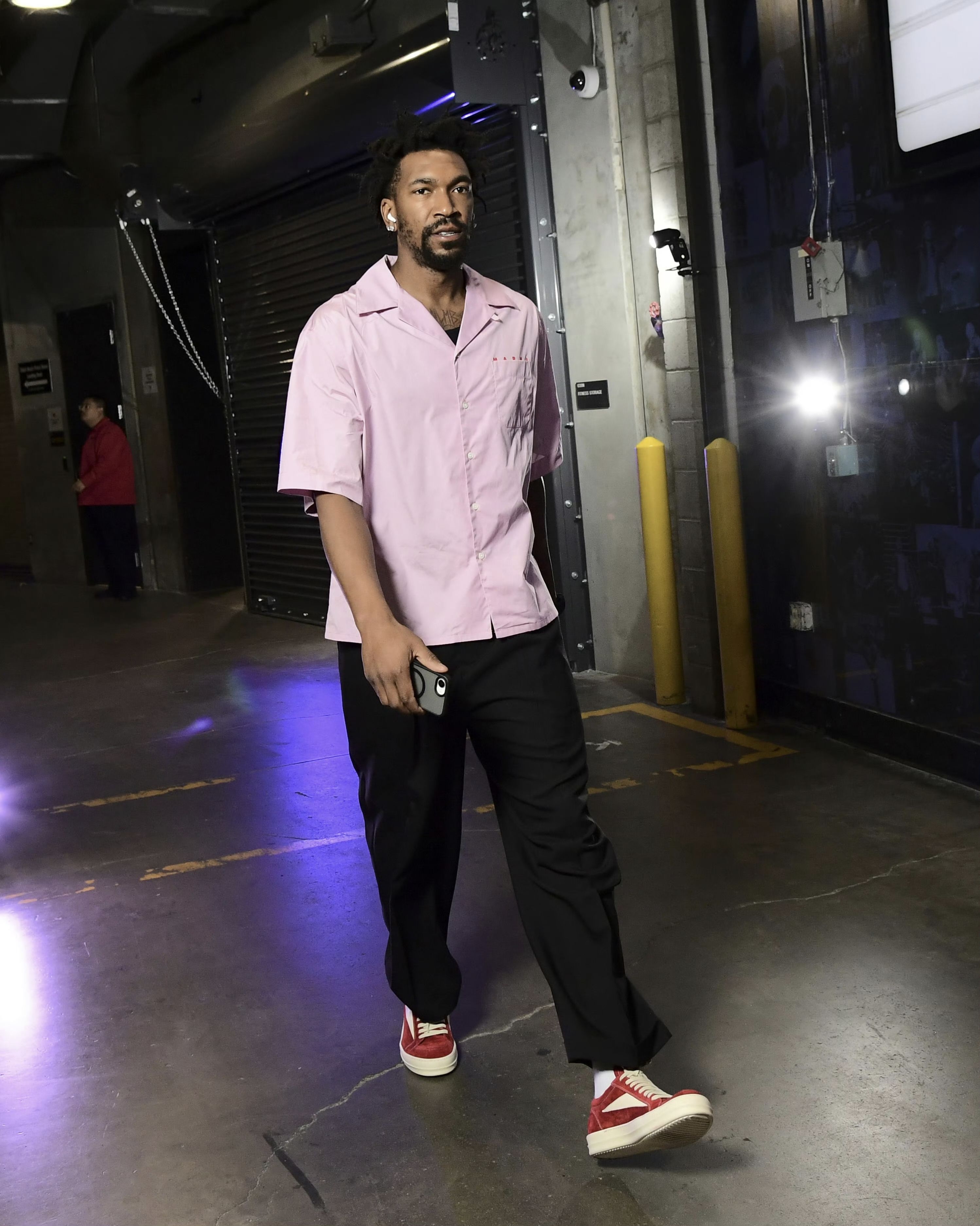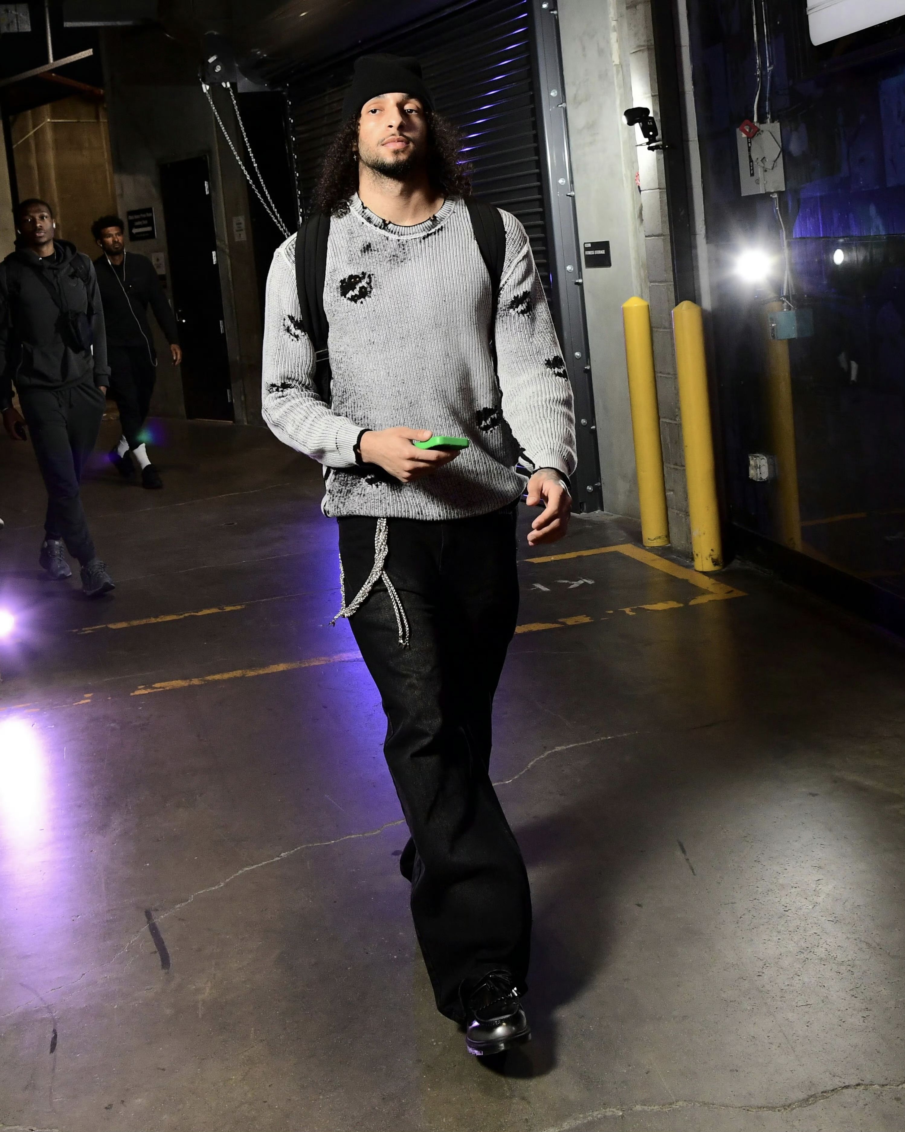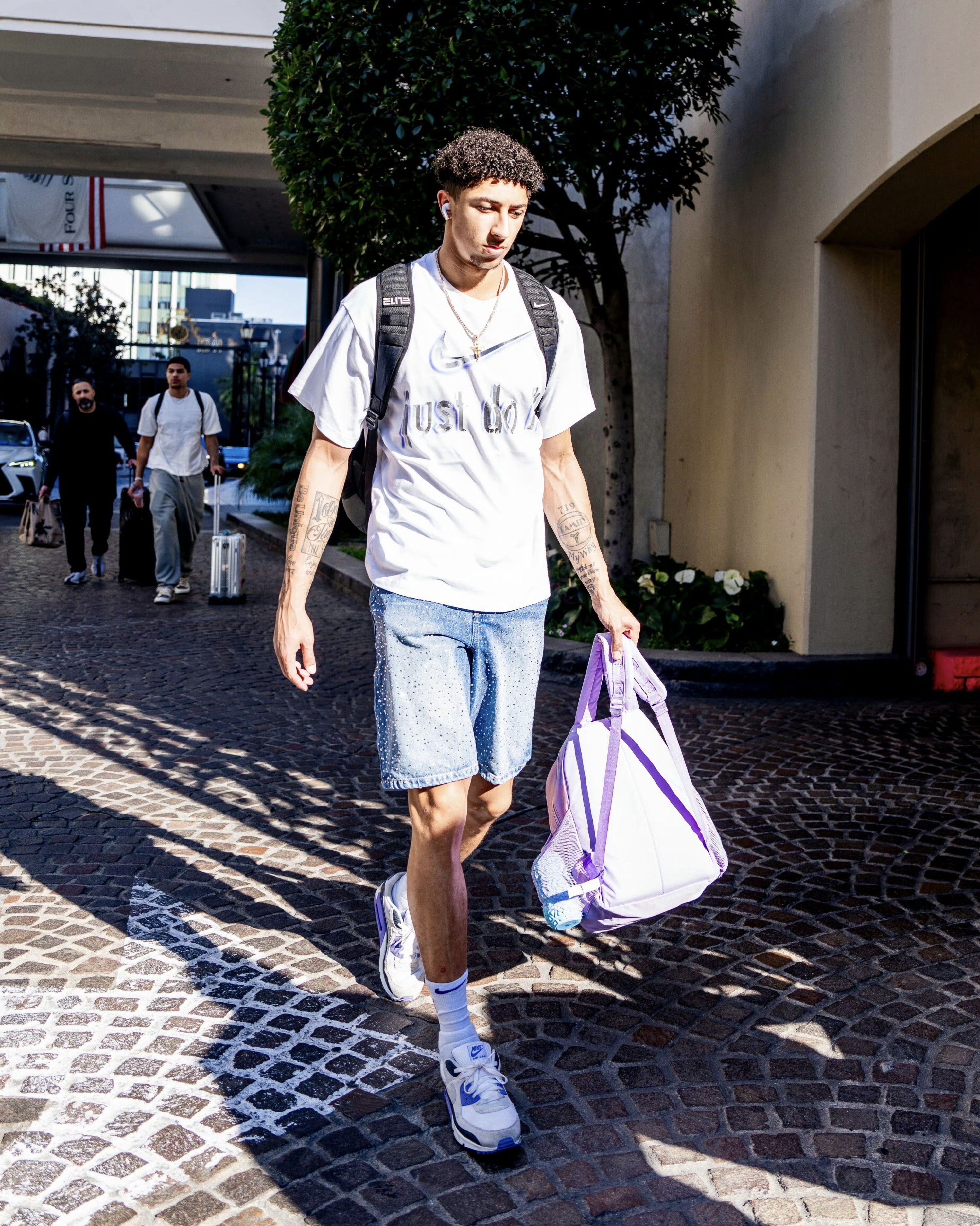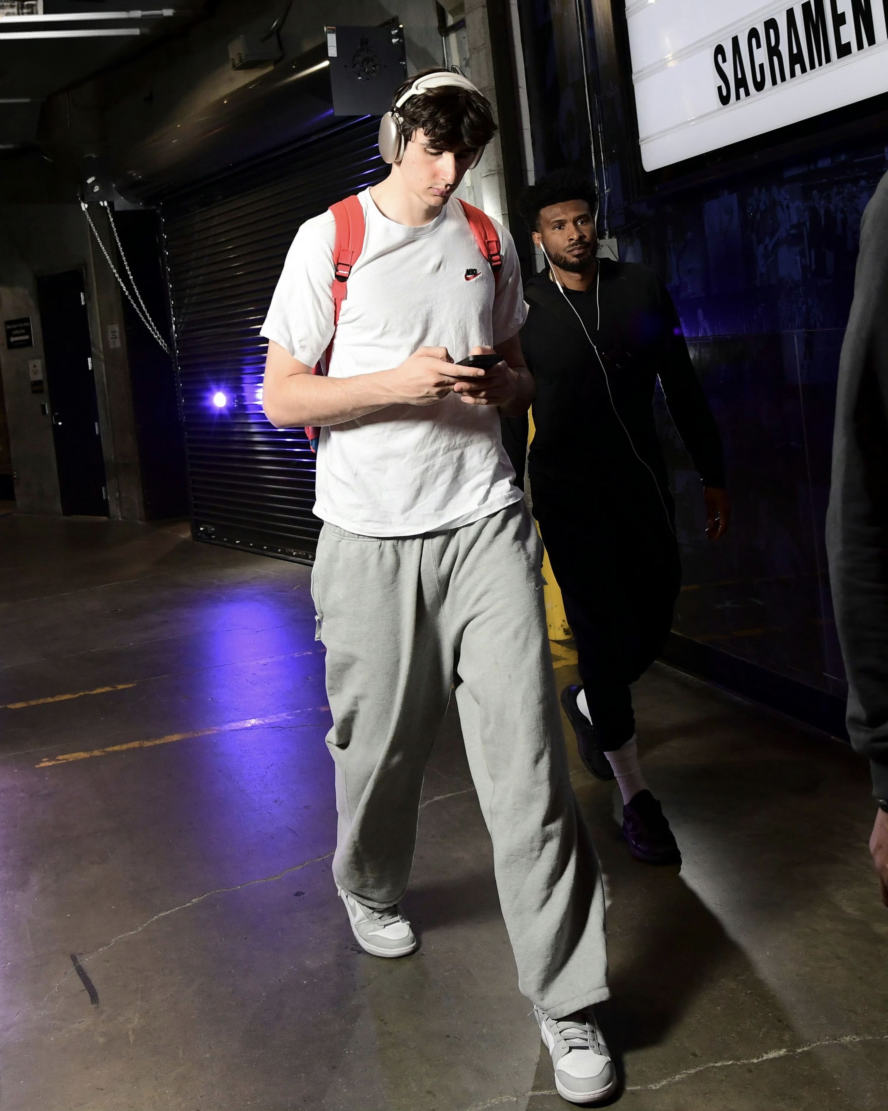 国王队的入场穿搭从来不会让人失望,这次全员解锁多元风格,硬核气场与松弛质感无缝切换,每一套都是球场外的时尚答卷。 威少一马当先,黑色背心搭配直筒牛仔裤,脚踩皮靴气场全开,肌肉线条与极简穿搭碰撞,硬汉氛围感直接拉满。 队内年轻球员主打清爽松弛,白T配牛仔短裤搭复古板鞋,浅灰运动套装简约随性,基础款穿出干净少年感。 另有球员解锁潮流进阶玩法,破洞针织毛衣配阔腿裤复古腔调十足,粉色衬衫撞色黑...