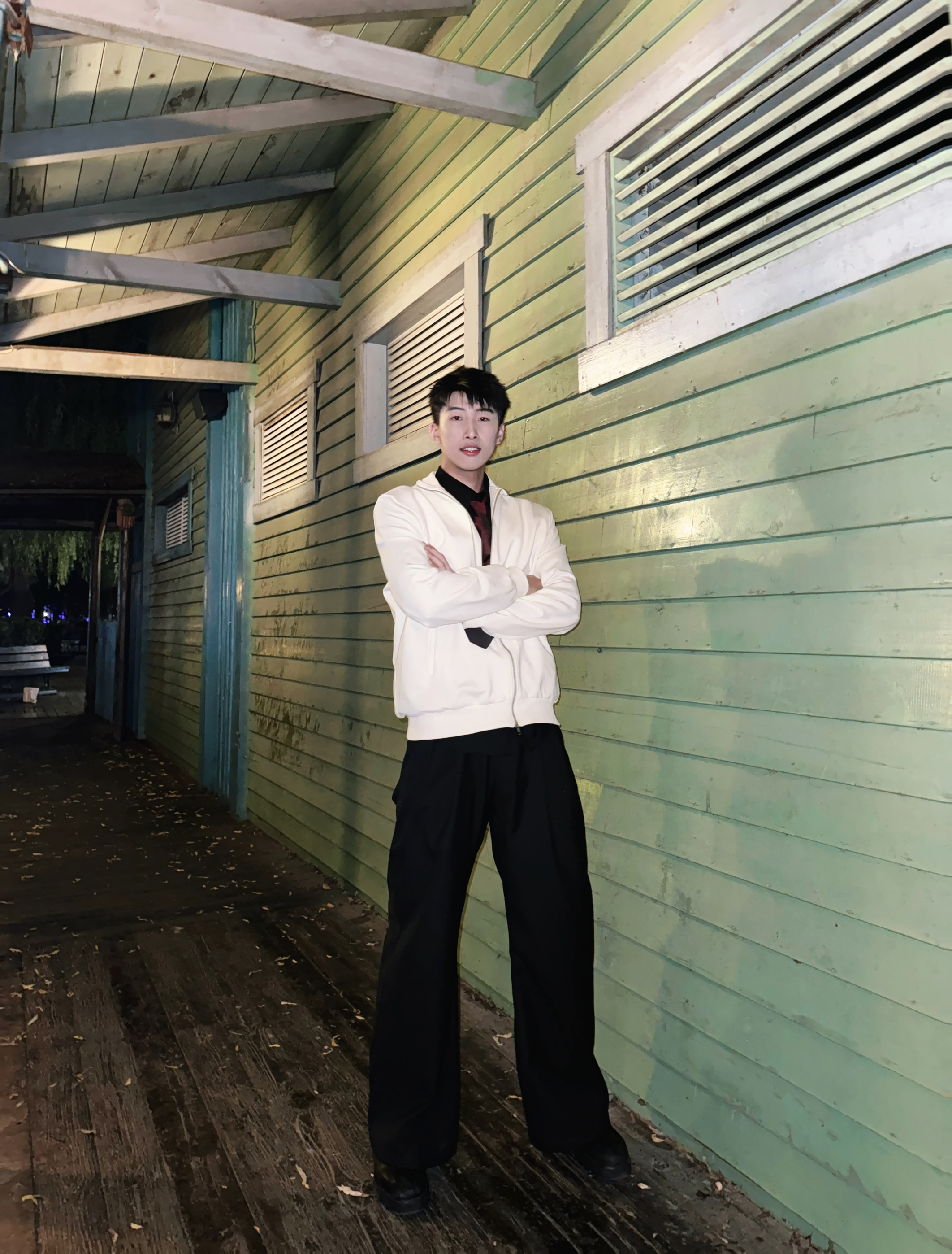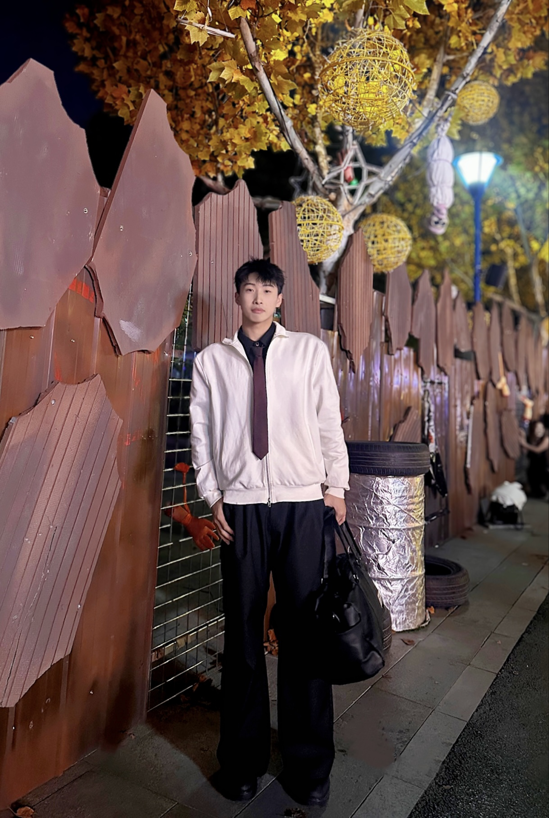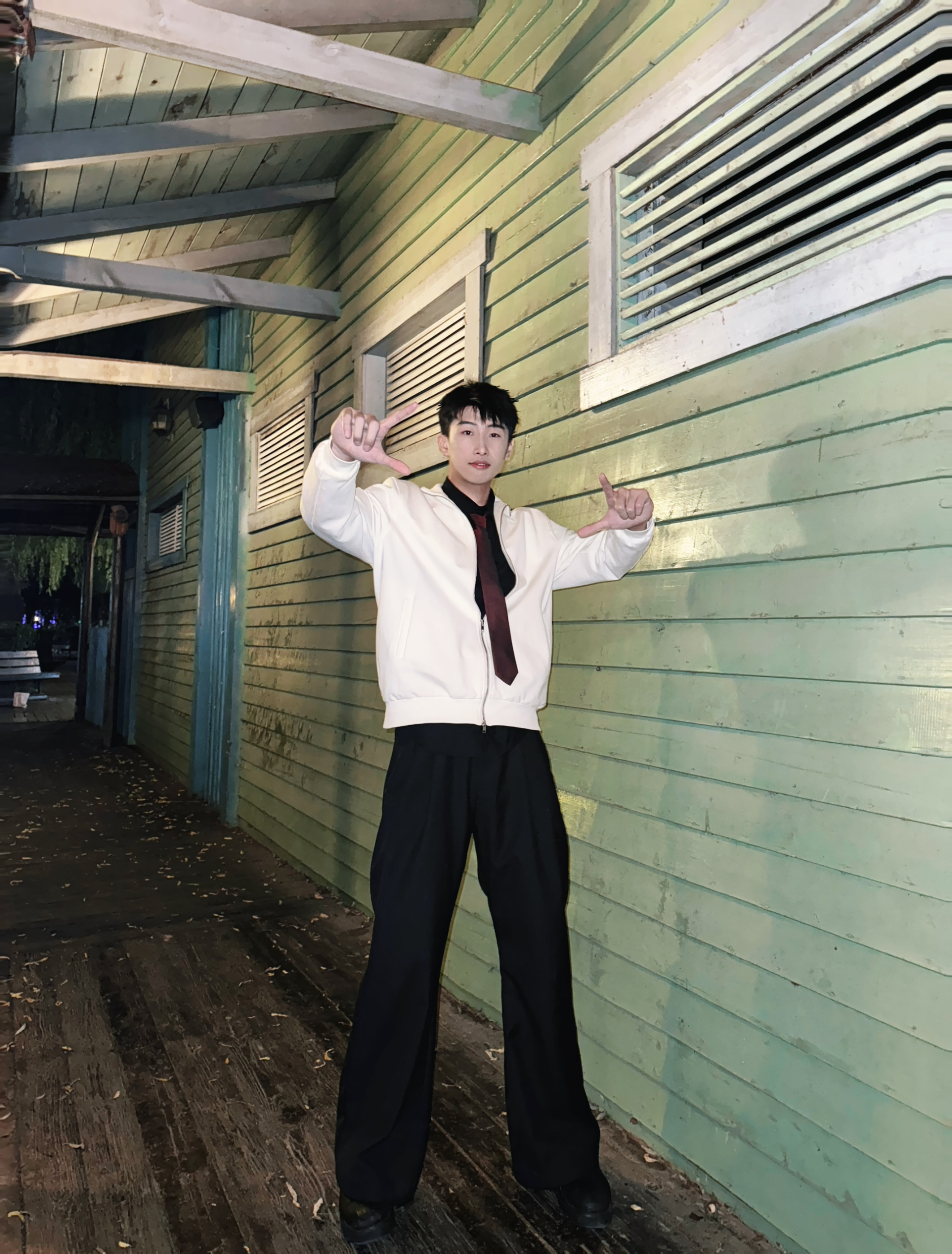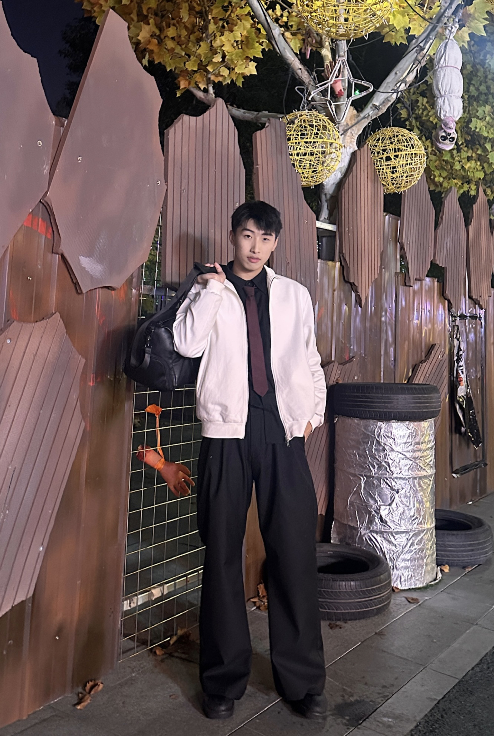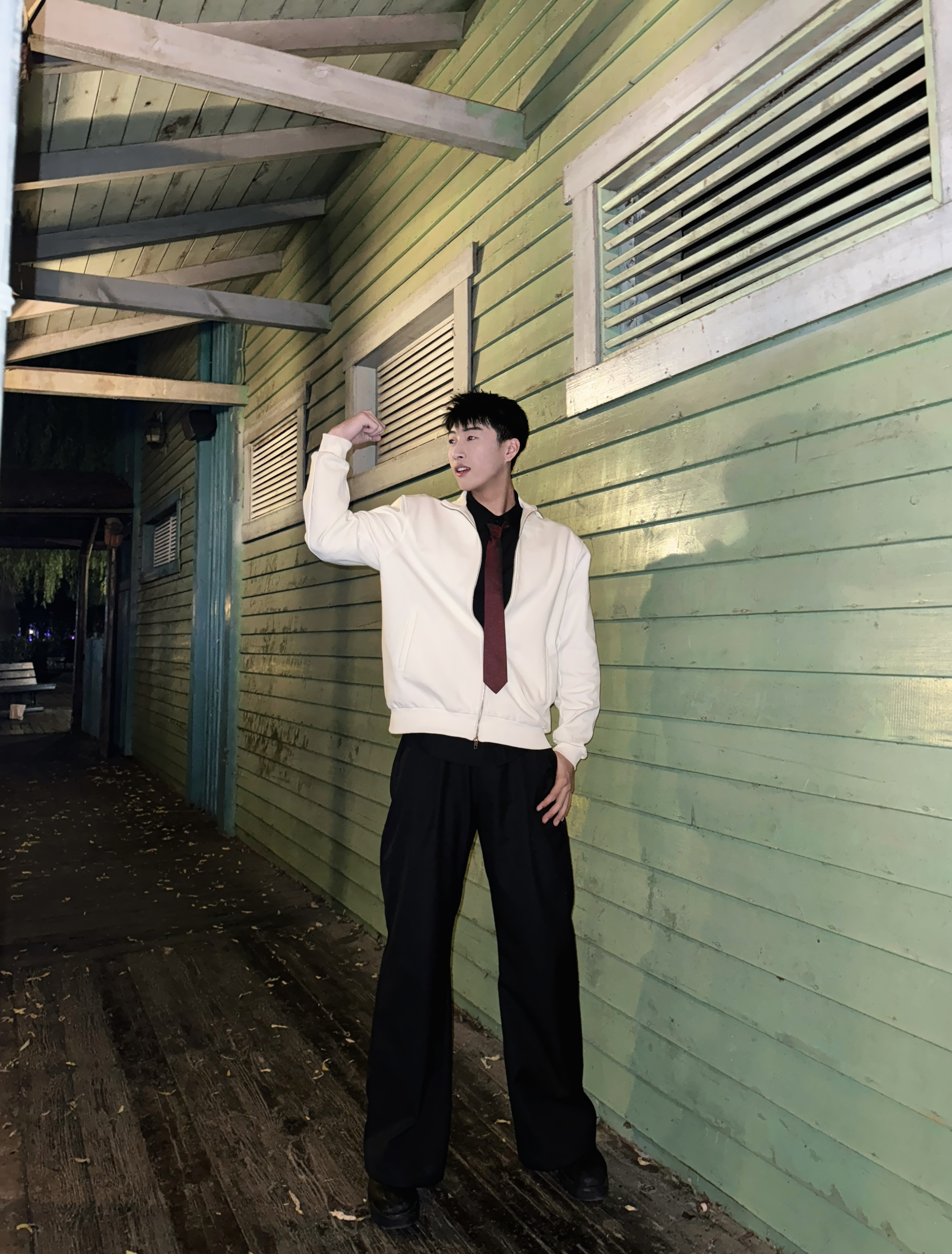 gtal家的正肩夹克帅爆了 微微垫肩 衣长正好 不会再有屁股羞耻症了 金属拉链质感满满 430g重磅立领 舒适感满满 红色领带转移视觉中心 简简单单的搭配 也能体现心思 身高:191cm 体重:88kg 尺码:2xl