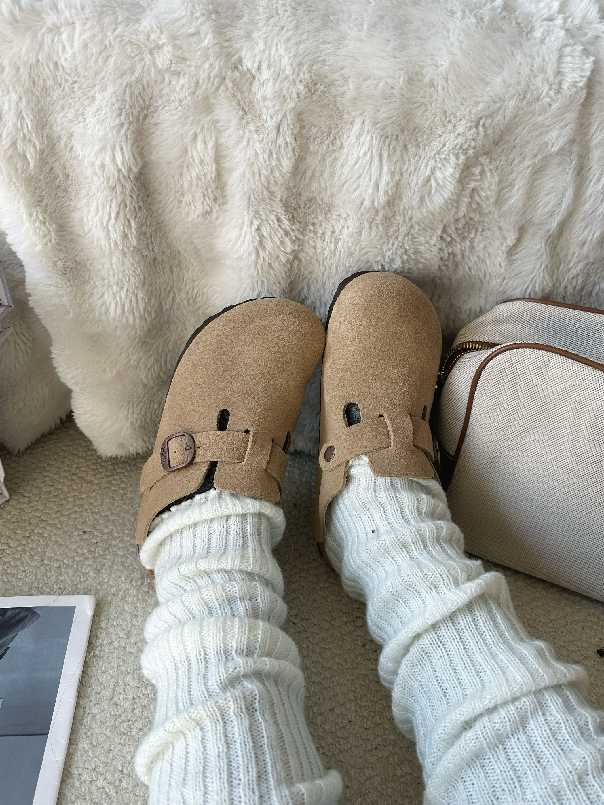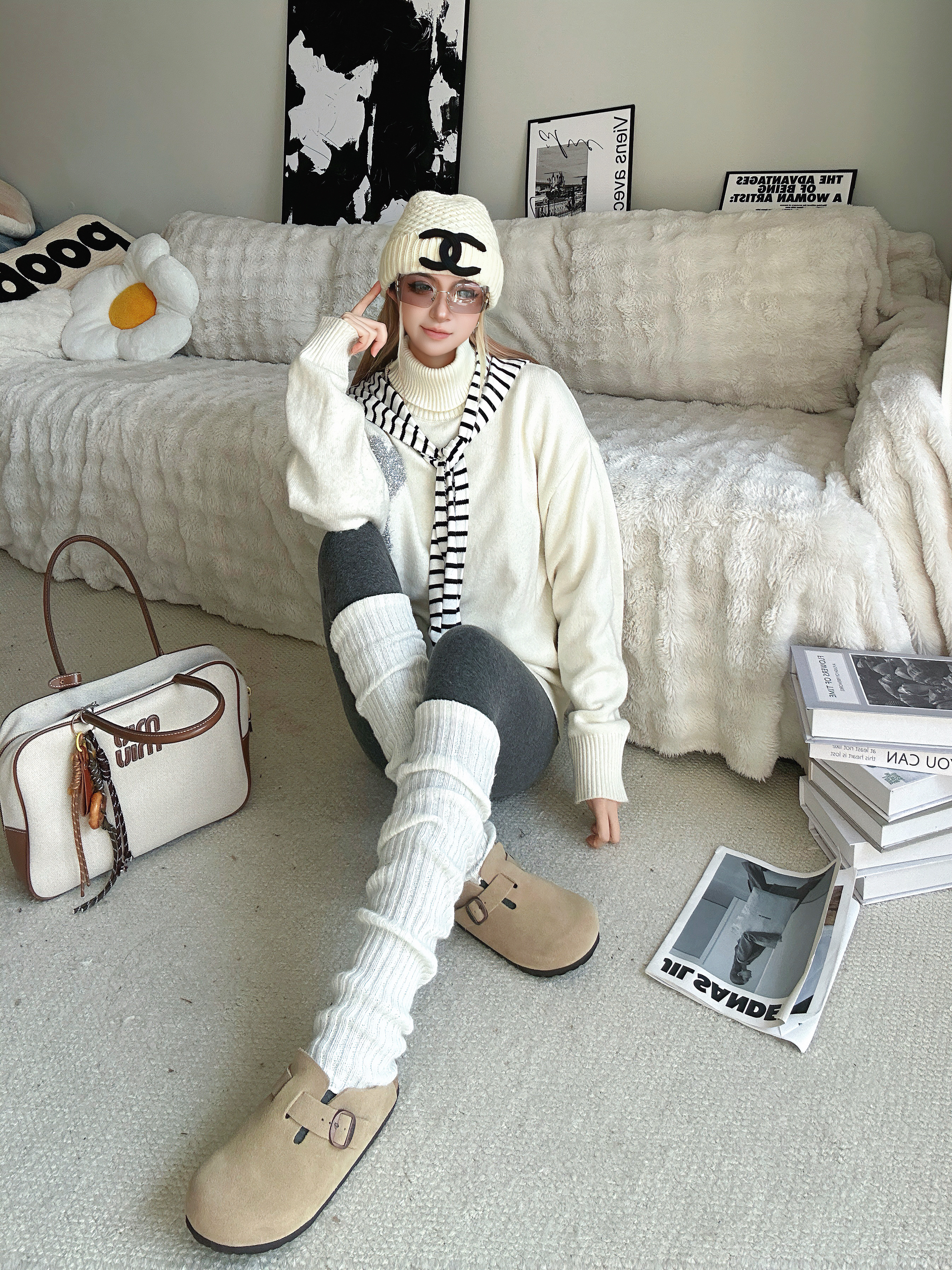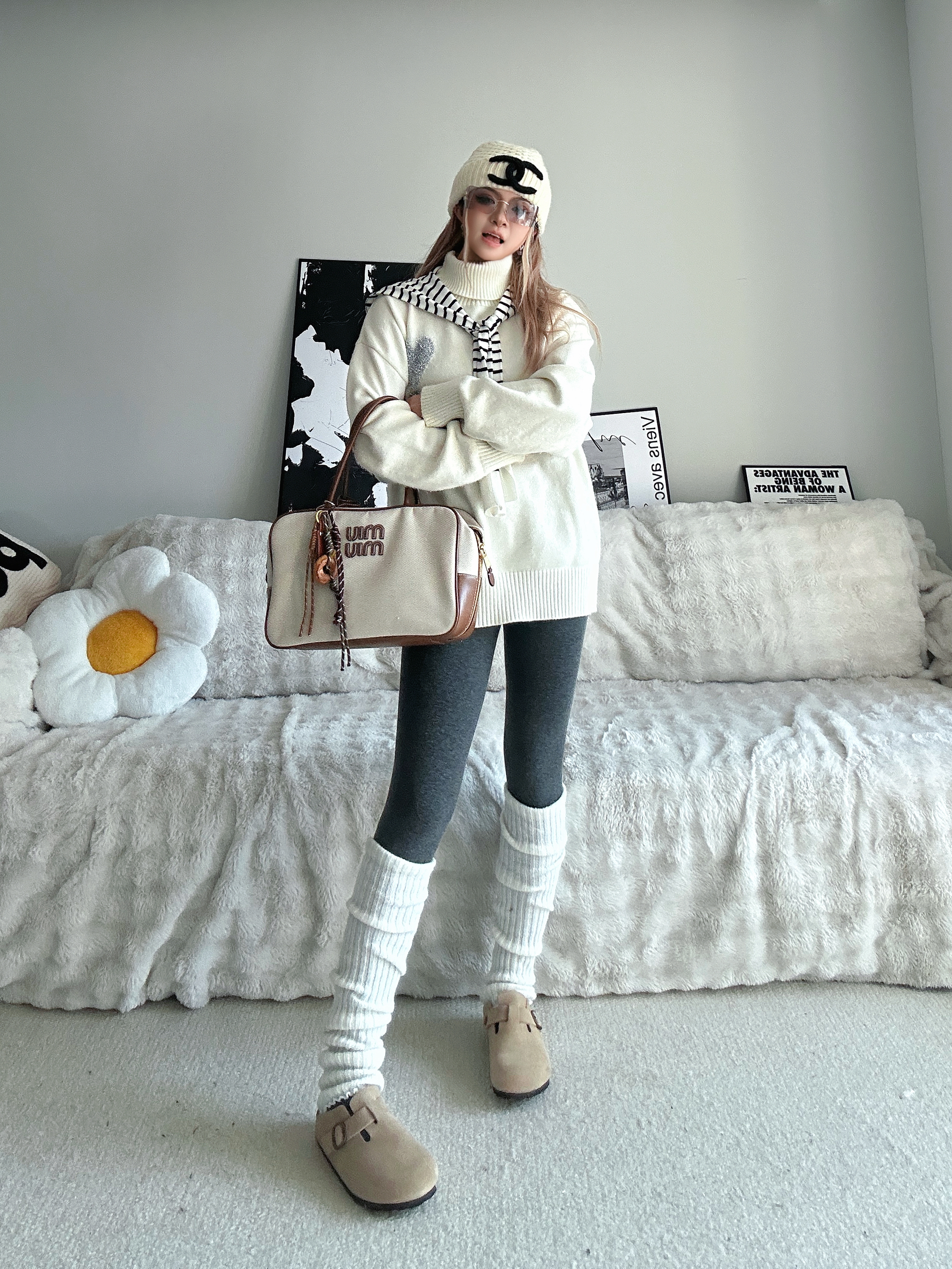 新年更新一下鞋柜啦 分享新的勃肯鞋穿搭❤️ 白色高领毛衣➕条纹小披肩 灰色打底裤➕过膝腿套 针织帽一带有点韩系氛围感了 鞋子来自 FOSA 的厚底勃肯鞋 脚感非常舒适 很适合我这种懒人哦 出门直接一脚蹬就走咯