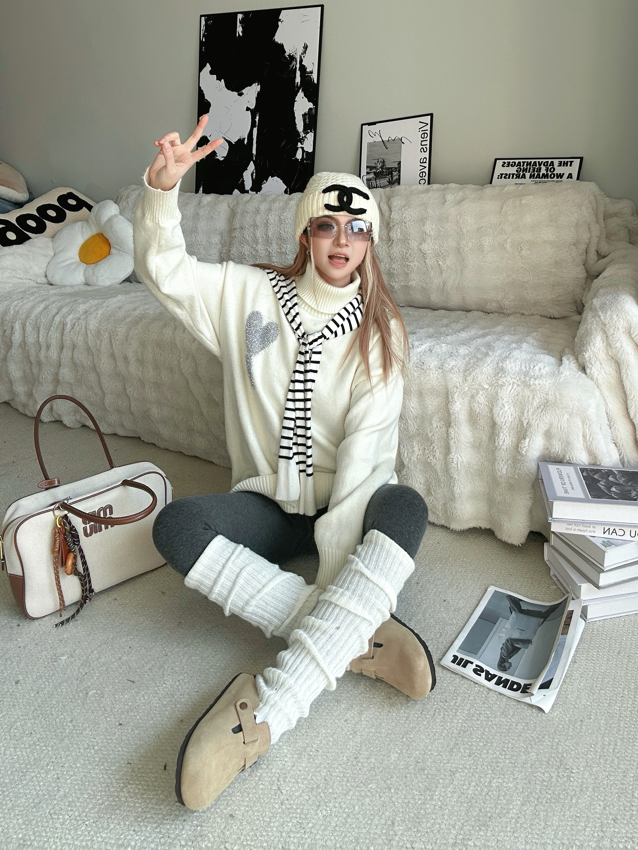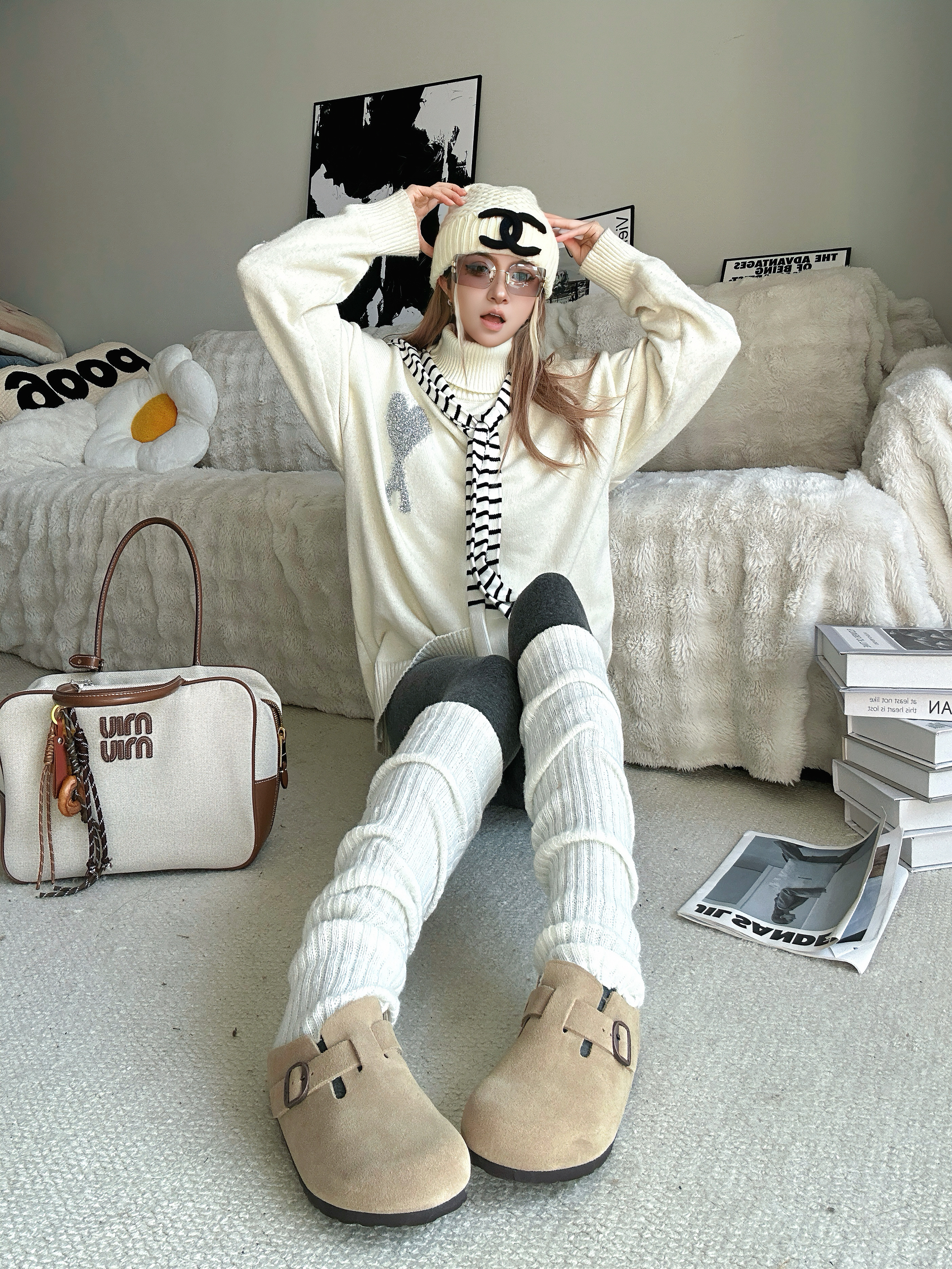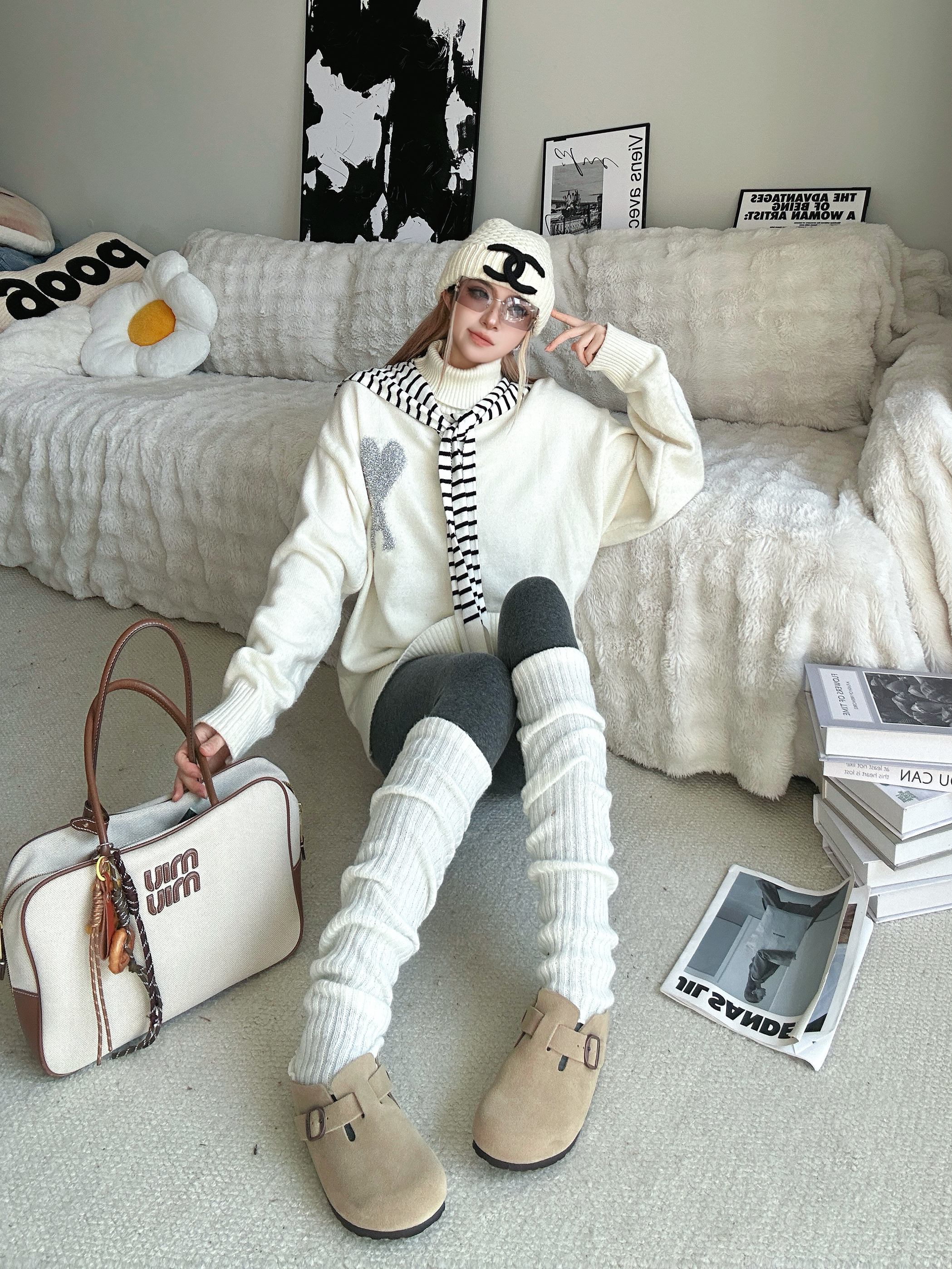 新年更新一下鞋柜啦 分享新的勃肯鞋穿搭❤️ 白色高领毛衣➕条纹小披肩 灰色打底裤➕过膝腿套 针织帽一带有点韩系氛围感了 鞋子来自 FOSA 的厚底勃肯鞋 脚感非常舒适 很适合我这种懒人哦 出门直接一脚蹬就走咯