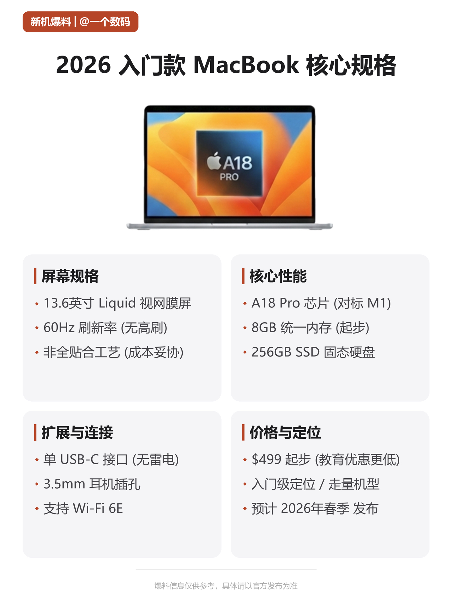 499美元起!苹果入门款MacBook莎疯了🍎 苹果要出平价MacBook了!2026春首发,预算党狂喜✨ 🔹 入门款核心亮点 马卡龙四色可选,12.9英寸LCD护眼屏,无风扇设计超安静。 A18 Pro芯片比肩M1性能,支持Apple Intelligence,轻办公/修图无压力。 🔸 短板需注意 仅8GB内存+单USB-C接口(无雷电),适合学生党/轻度办公。 💡 三类人群选购指...