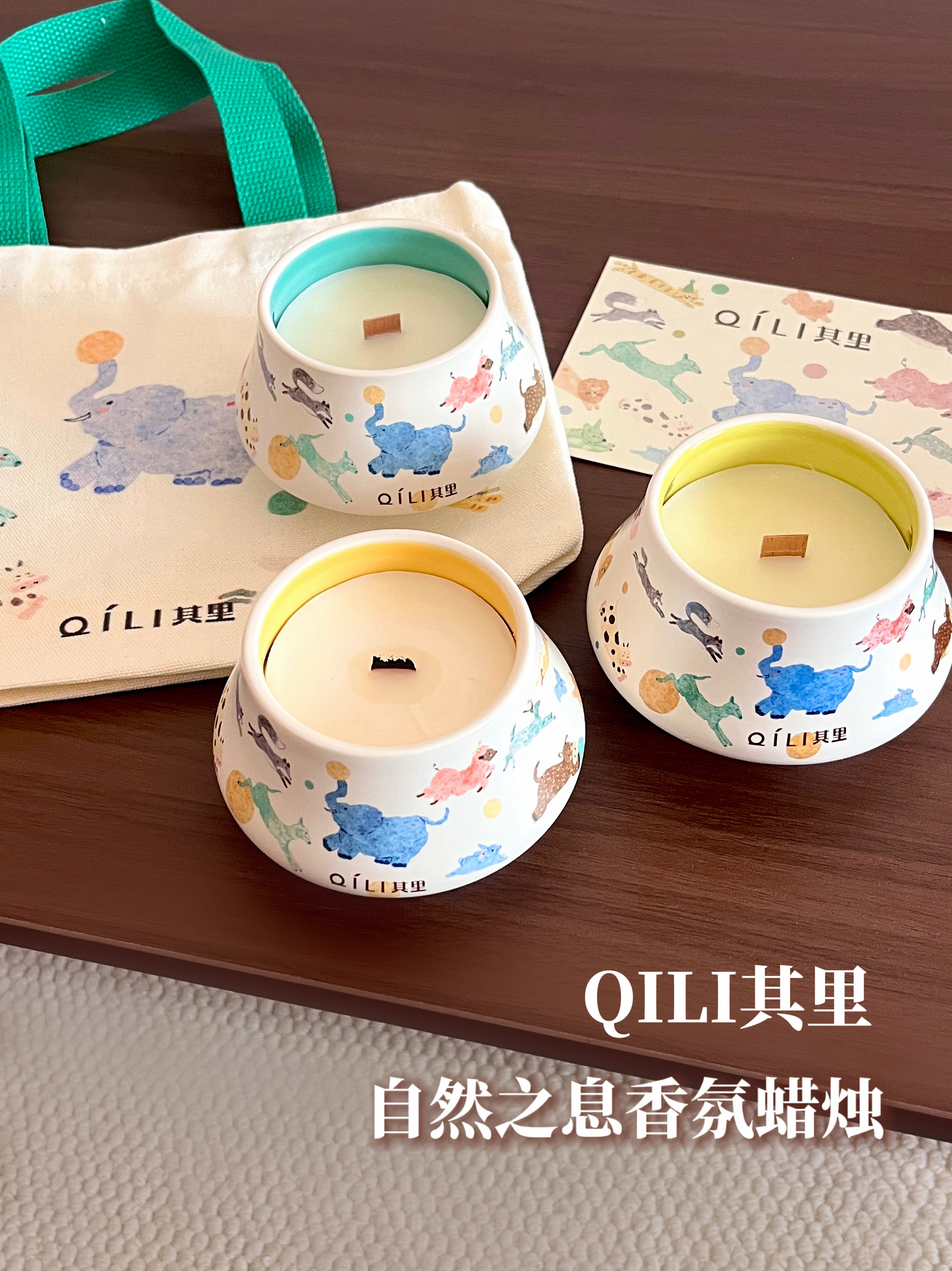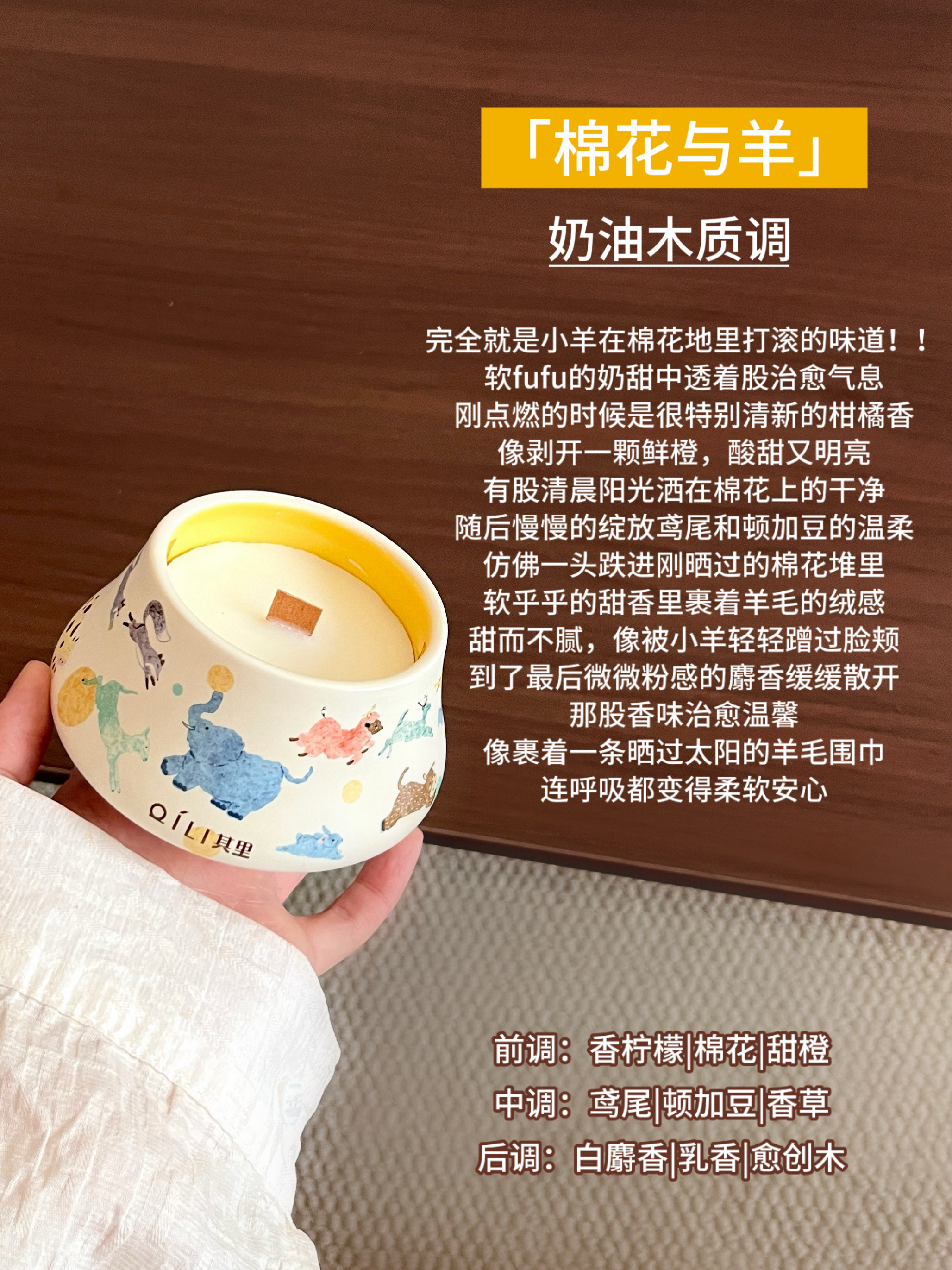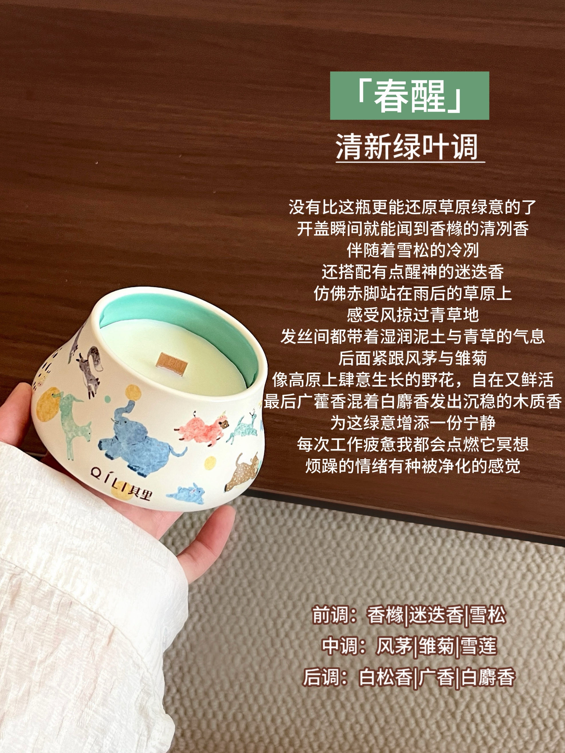 自从第一次入手它家的固体香膏我就知道其里在做香氛这块是有点本事在的!作为颜控党怎么可能放过它家的香氛蜡烛呢!!刚好过年攒了点压岁钱全祸祸到这里了,到手后只想说小东西买的真心值!值!值! 个人感觉实物要比看到的更美貌!圆顶帽陶瓷罐拿在手里具有质感,罐身像把一整幅草原奔跑的动物的水彩画揉进了蜡里,软乎乎的蓝象踮脚转圈玩球,粉鬃小羊撒欢蹦跳,更有活泼的小鹿,可爱的小兔......色彩饱满细腻,清透的...