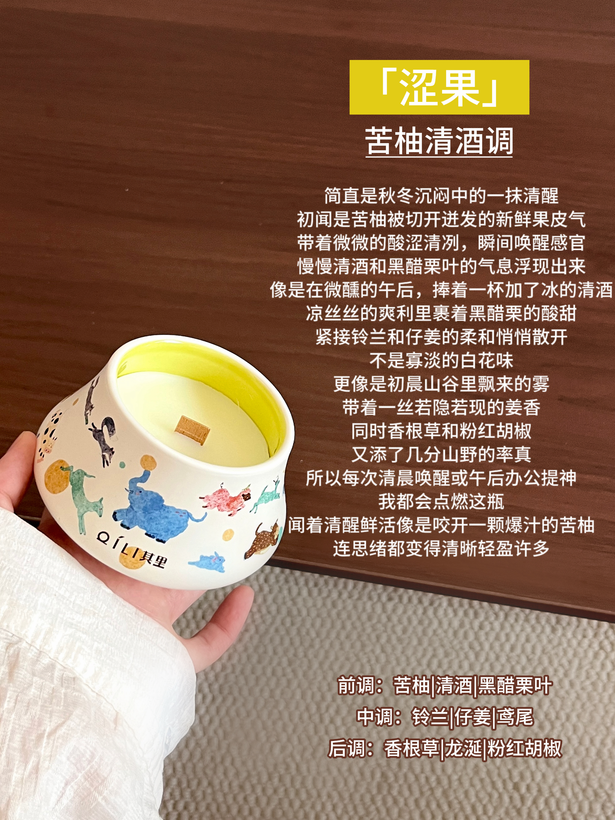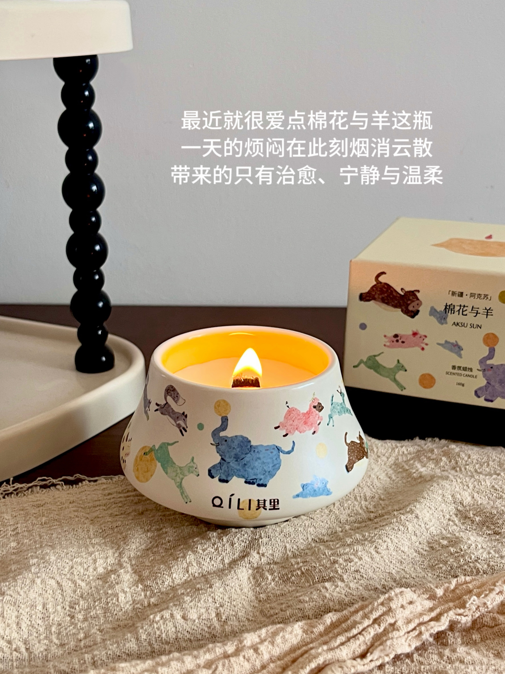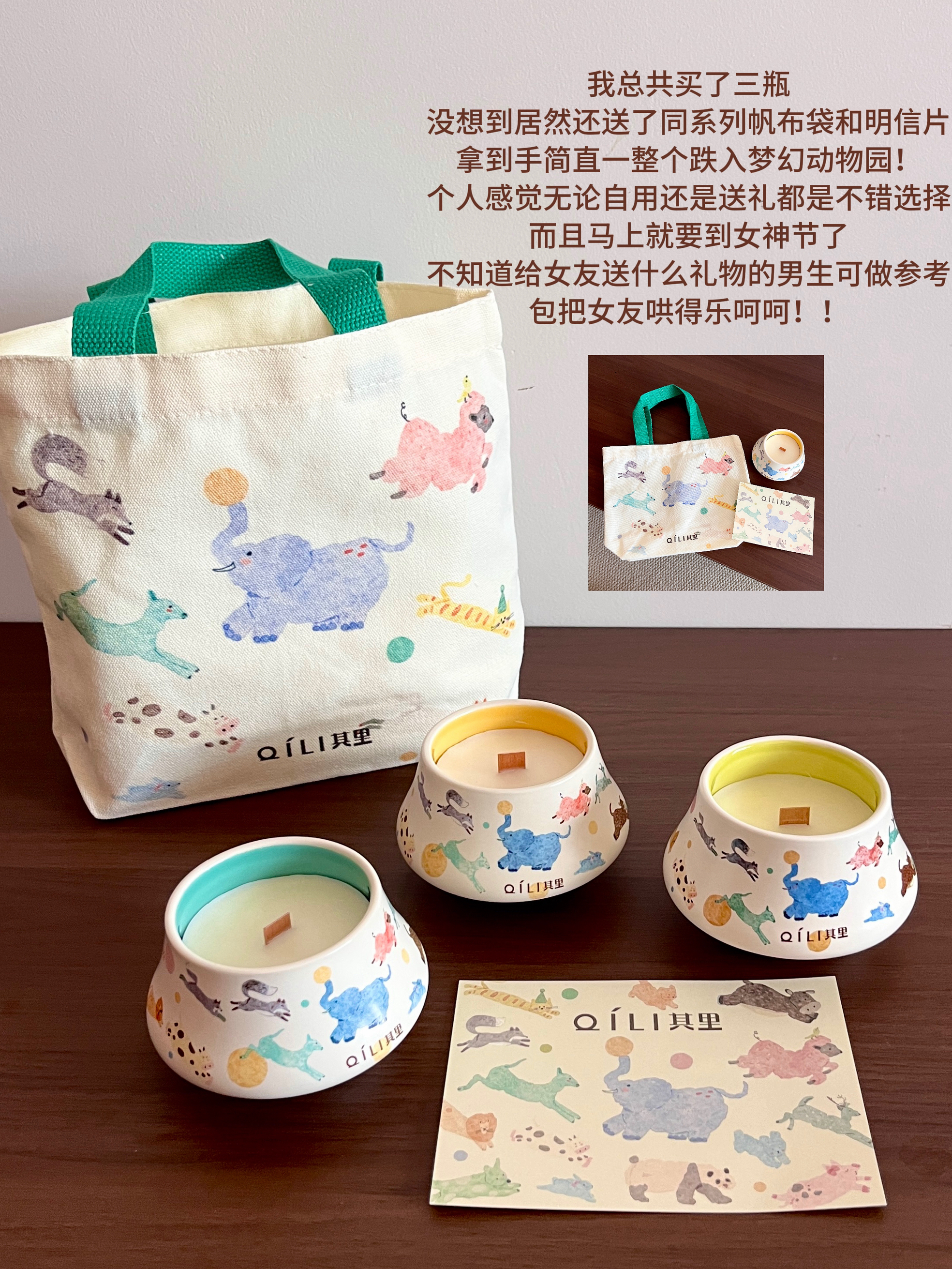 自从第一次入手它家的固体香膏我就知道其里在做香氛这块是有点本事在的!作为颜控党怎么可能放过它家的香氛蜡烛呢!!刚好过年攒了点压岁钱全祸祸到这里了,到手后只想说小东西买的真心值!值!值! 个人感觉实物要比看到的更美貌!圆顶帽陶瓷罐拿在手里具有质感,罐身像把一整幅草原奔跑的动物的水彩画揉进了蜡里,软乎乎的蓝象踮脚转圈玩球,粉鬃小羊撒欢蹦跳,更有活泼的小鹿,可爱的小兔......色彩饱满细腻,清透的...