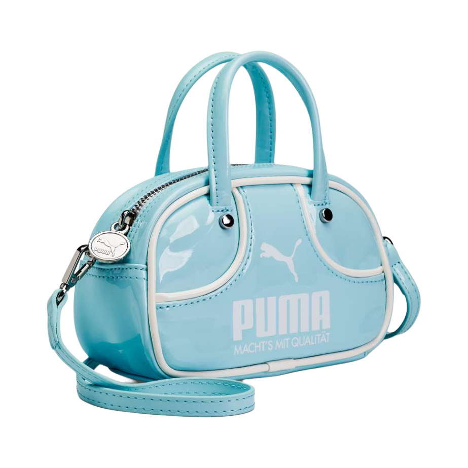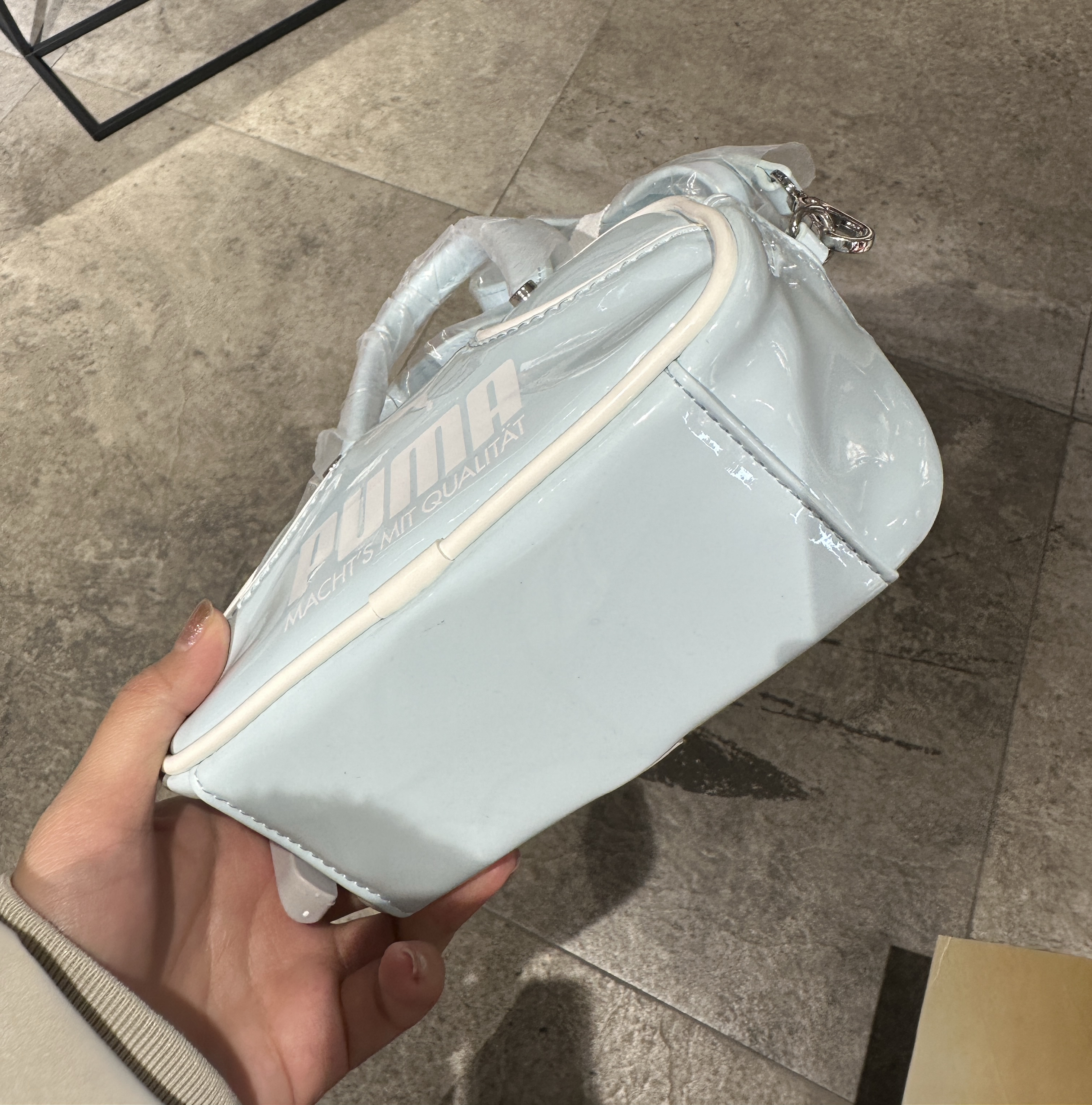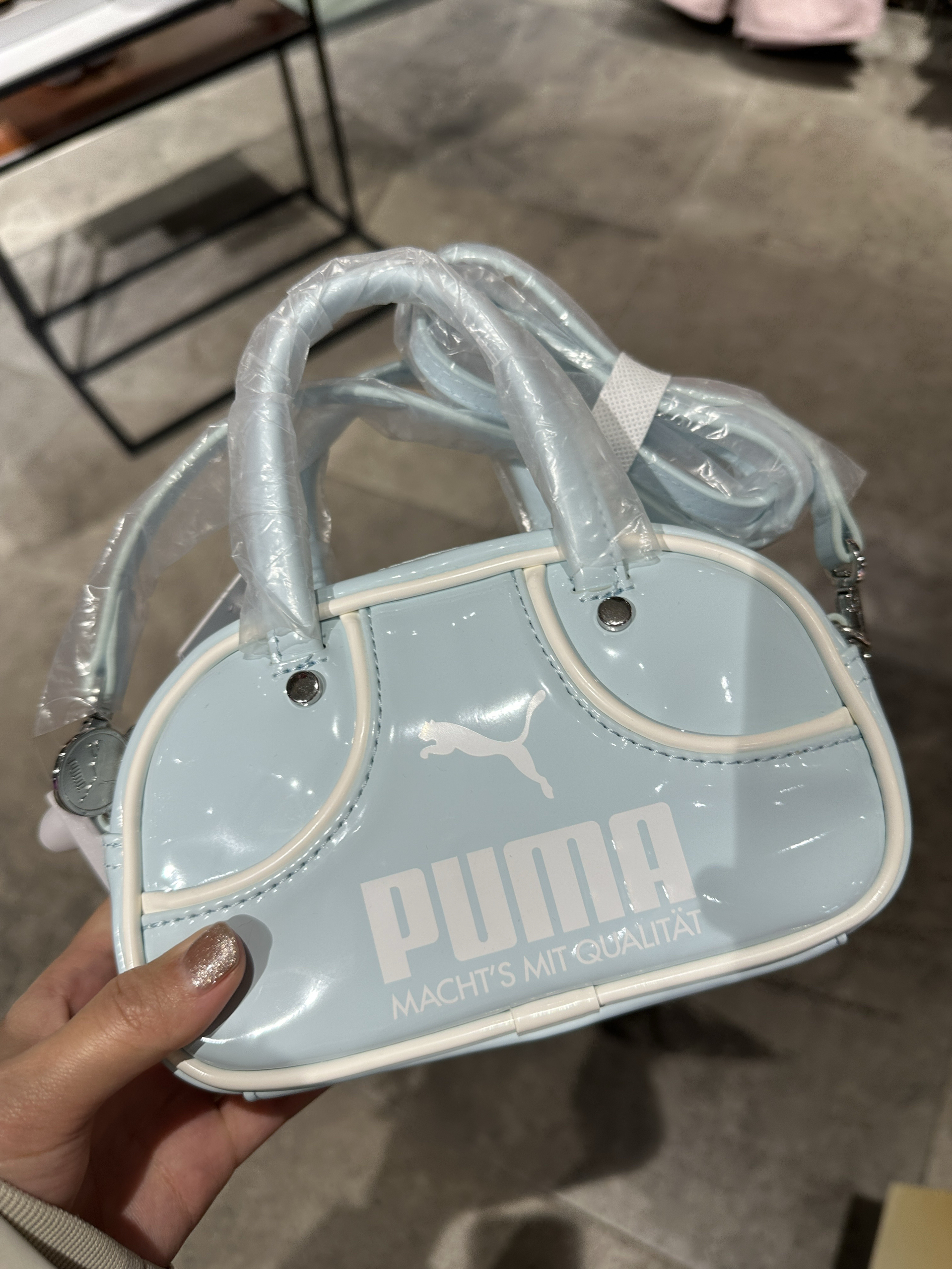 挖到Puma冷门宝藏包✨ 冰蓝色漆皮质感绝了, 小波士顿包型超显精致, 容量日常够用, 甜妹早春穿搭刚需!