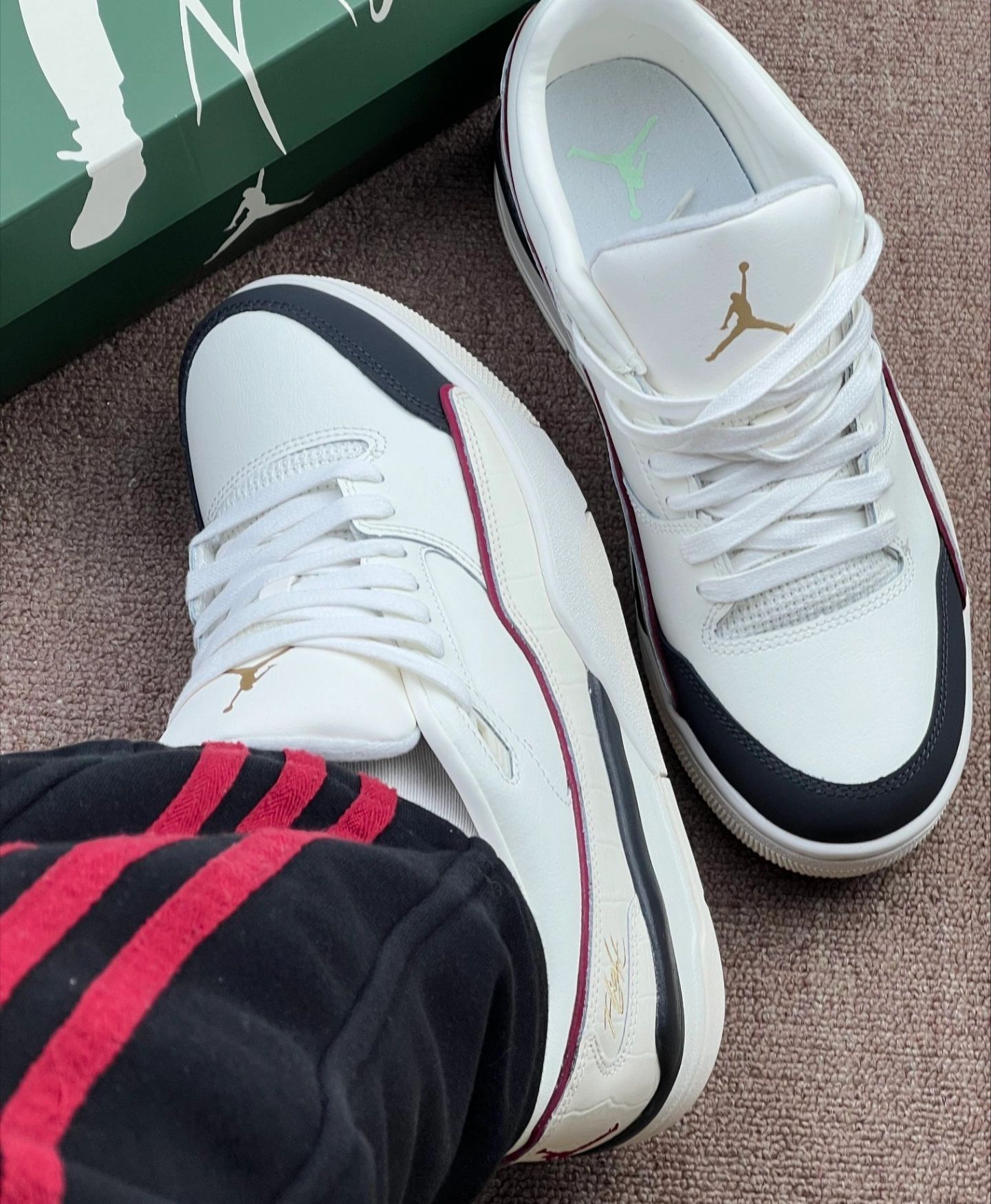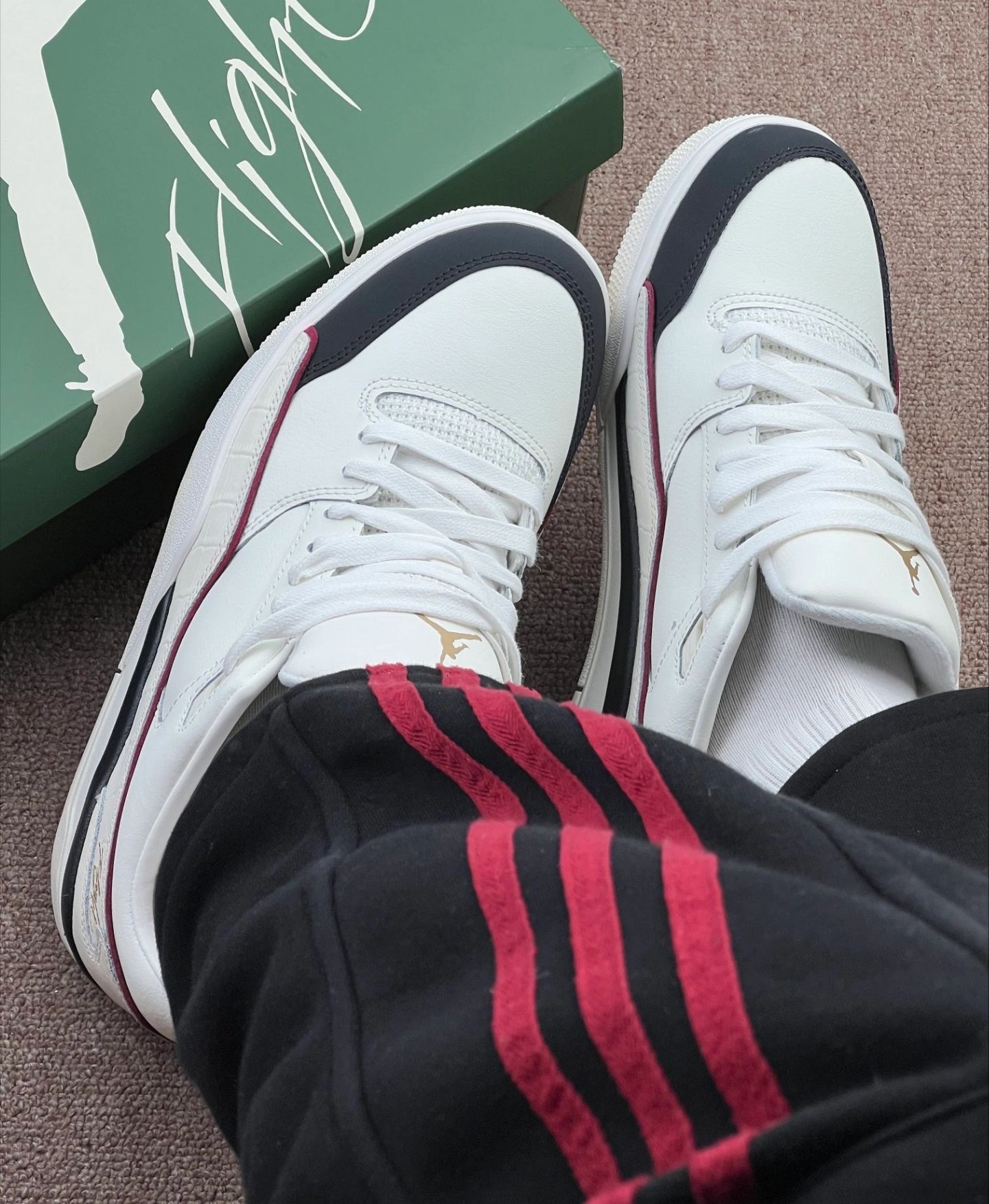 这双鞋的颜值确实戳我,白黑红撞色很复古,配运动裤、牛仔裤都不违和,细节里的飞人刺绣和侧边线条,看着挺精致。 但皮面偏硬,刚上脚时鞋帮卡脚踝,走久了才慢慢贴合,包裹感偏紧,脚宽的朋友得大半码。中底偏硬,缓震基本靠鞋垫,长时间走路脚会酸,不太适合长时间通勤。 鞋头和侧边的皮面容易留折痕,白色部分一蹭就脏,清洁起来有点麻烦😮💨。鞋底纹路浅,雨天走路得小心,抓地力一般。
