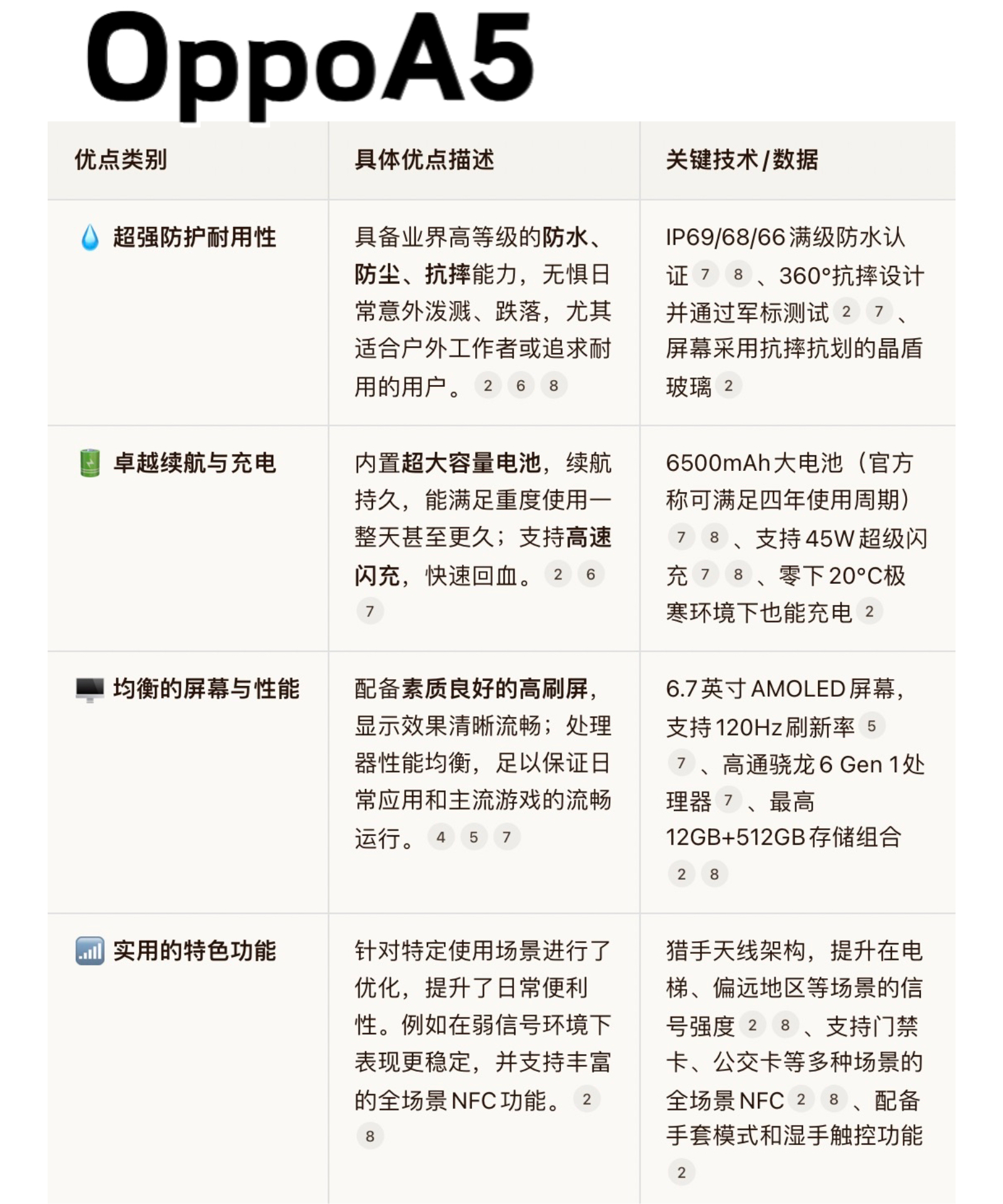 本篇笔记关联了OPPO A5 5G 手机 抗摔 超耐用 IP69满级防水 6500mAh超四年 大电池 全网通 耐摔 快充 双模 信号穿墙王 流畅芯 锆石黑、HONOR/荣耀 X70 5G手机 8300mAh电池 骁龙6Gen4处理器 防水 抗摔 防抖 全网通 超清 双卡 快充 长续航 高清影像 朱砂红、vivo Y500 5G手机 8200mAh蓝海电池 200万像素虚化 续航耐用拉满 防水 抗摔 闪充 全网通 大内存 高清影像 更强大 冰川蓝等商品,为用户提供真实的使用体验和购买参考。
