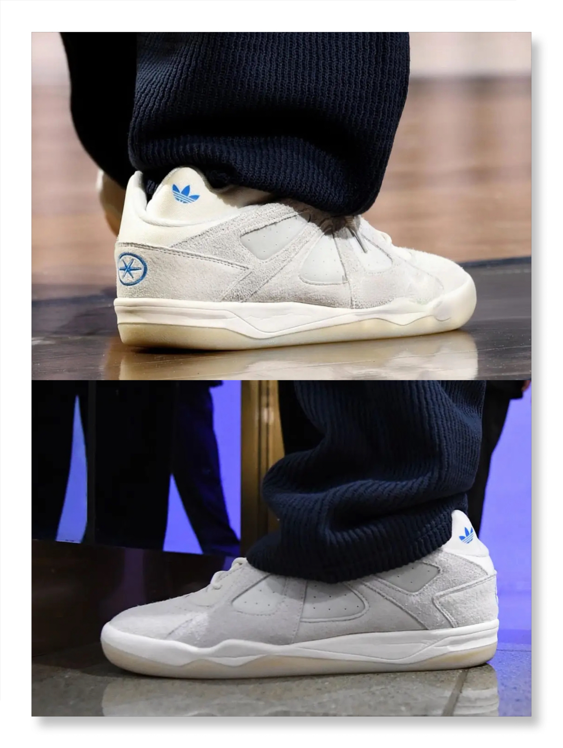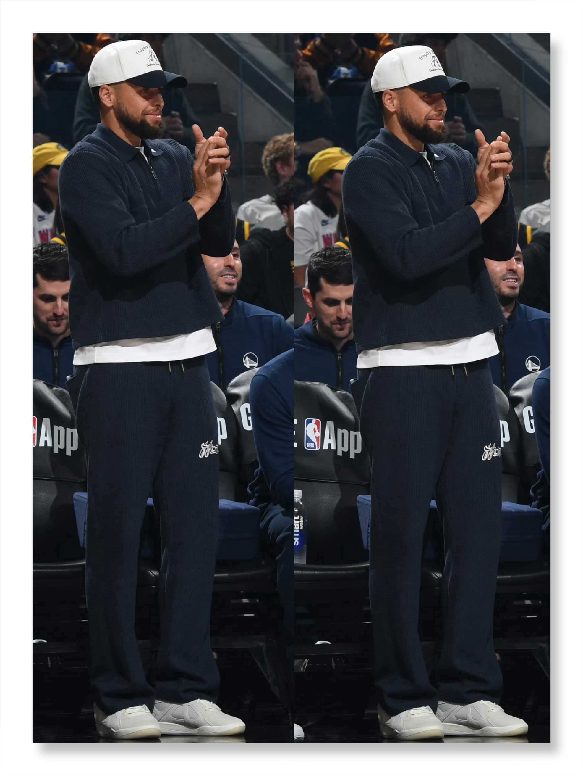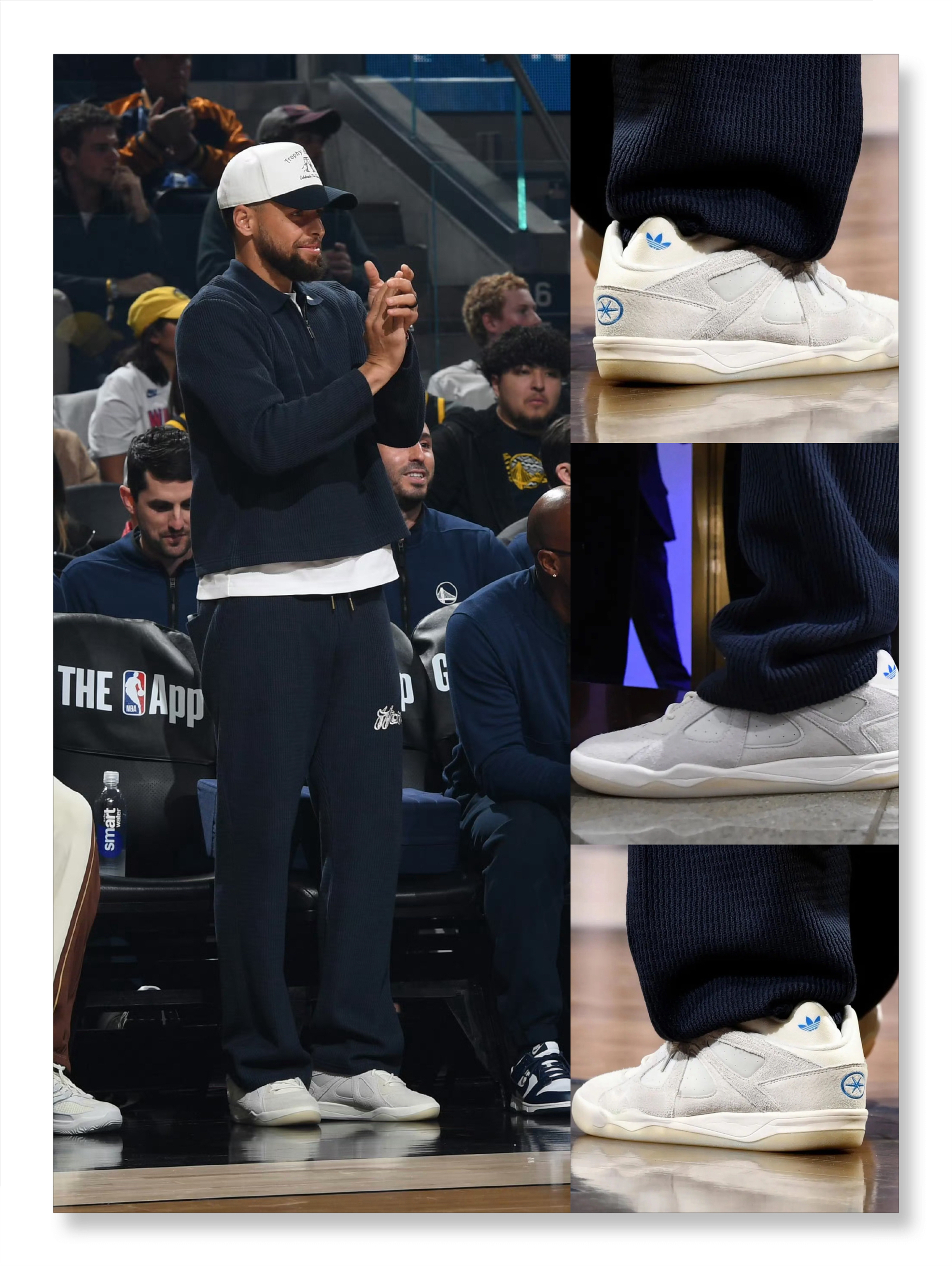 今日NBA常规赛主场迎战快船的比赛中,库里穿着歌手Bad Bunny(坏痞兔)签名鞋adidas Badbo1场边观战。