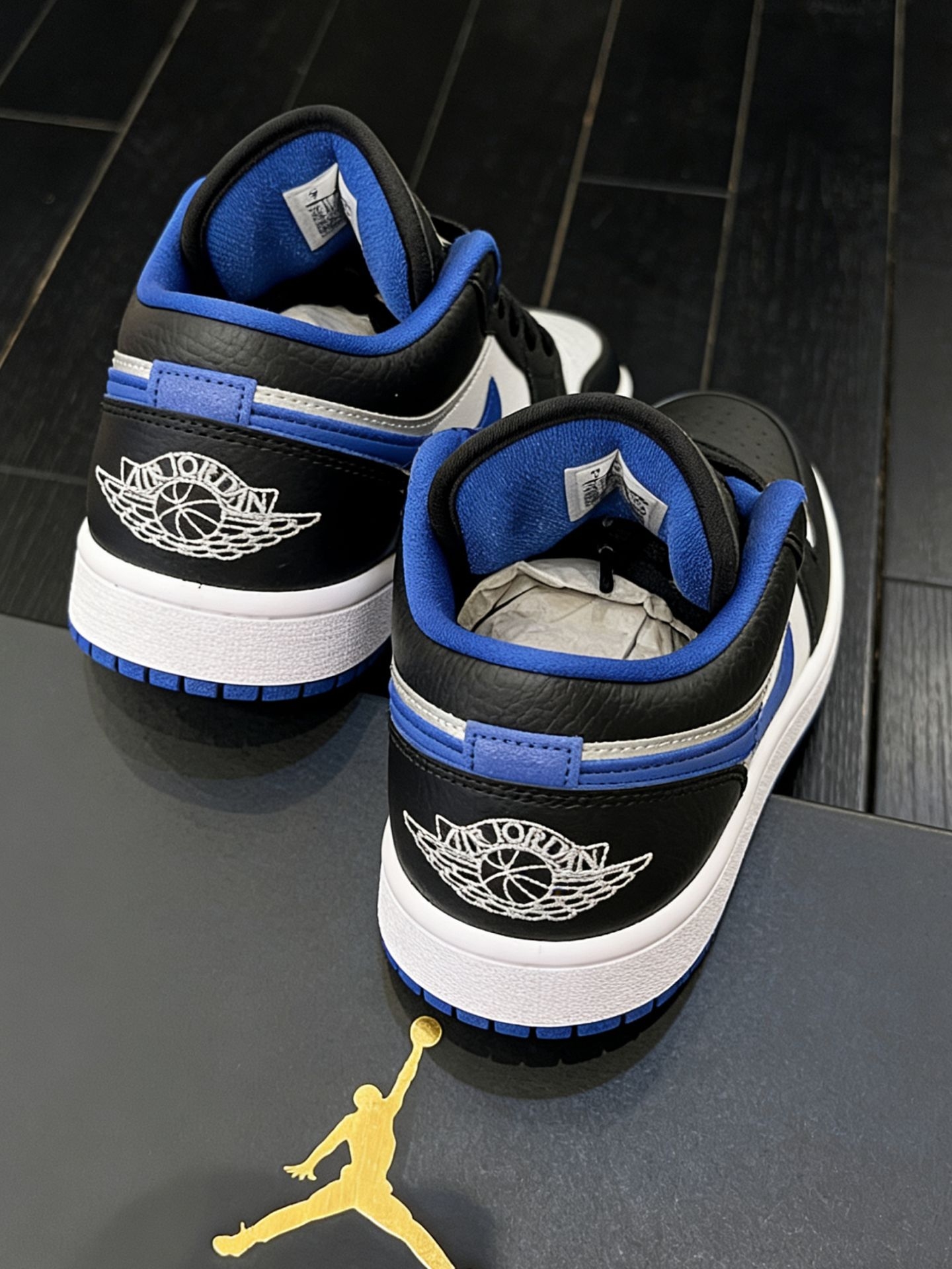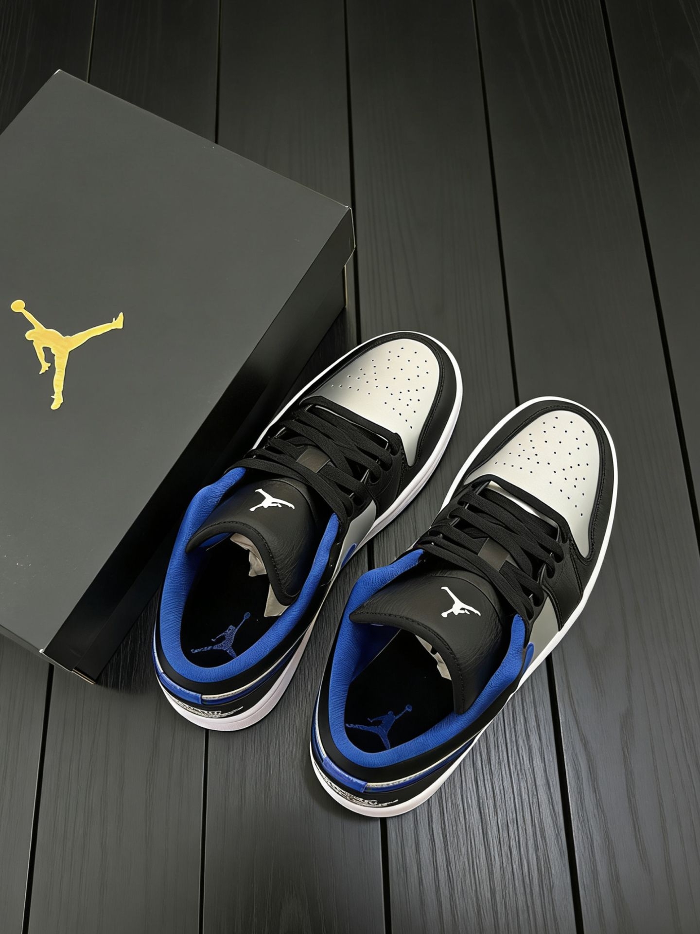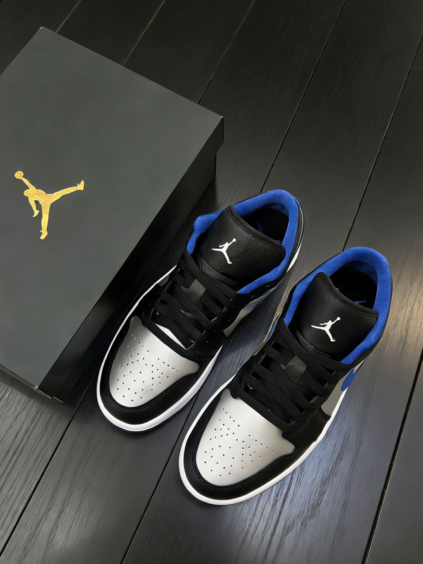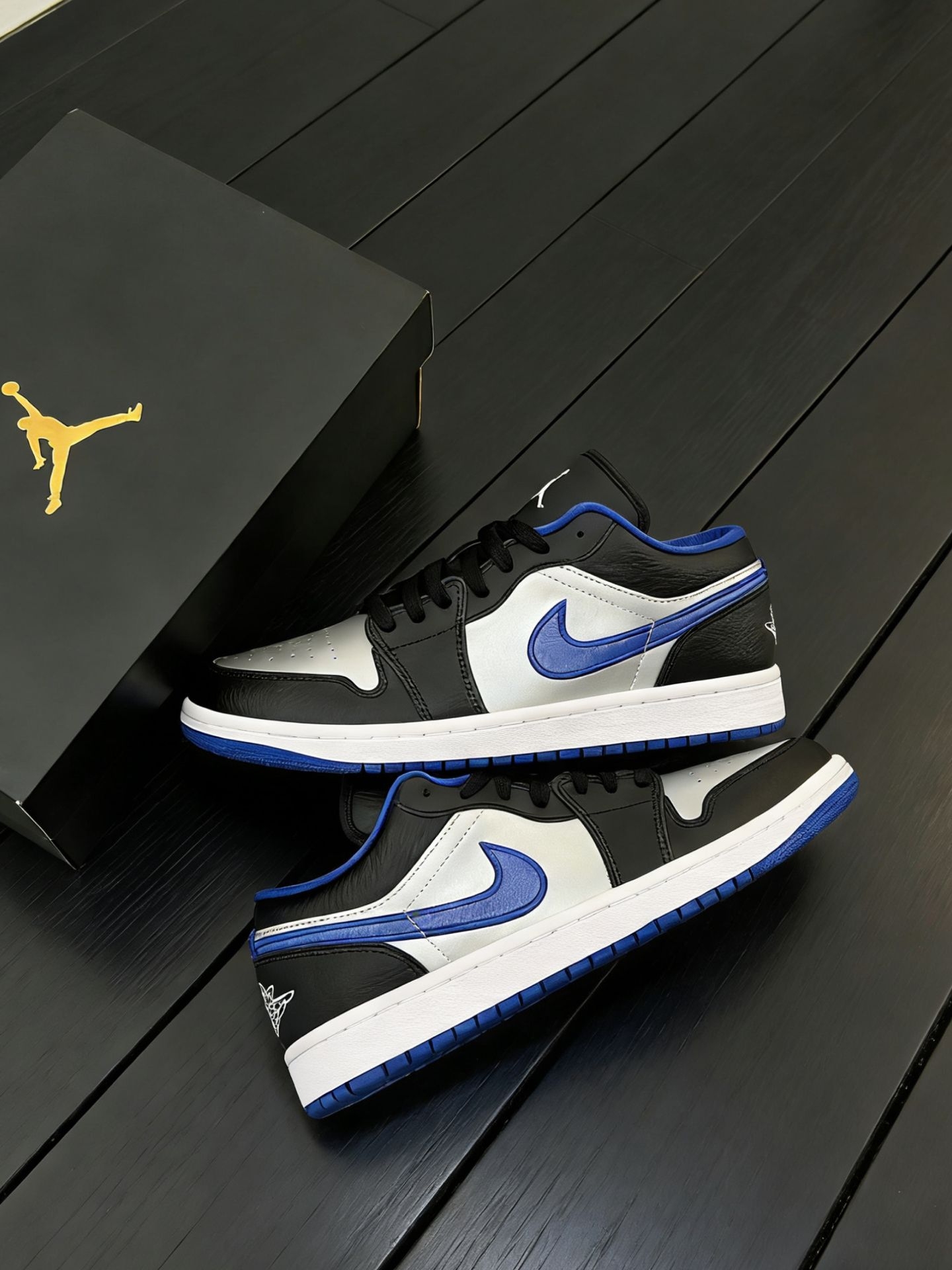 新入的这双AJ1 Low真的太有街头感了✨ 黑、银、蓝的撞色很吸睛,银色鞋头自带反光质感,蓝色勾子和鞋口的点缀让整体不会太沉闷。 低帮版型走路灵活不闷脚,搭牛仔裤、工装裤或者运动裤都很和谐,日常通勤、出门和朋友小聚都合适。皮面材质也好打理,脏了擦一擦就干净,属于越看越耐看的类型,最近出门都想穿着它