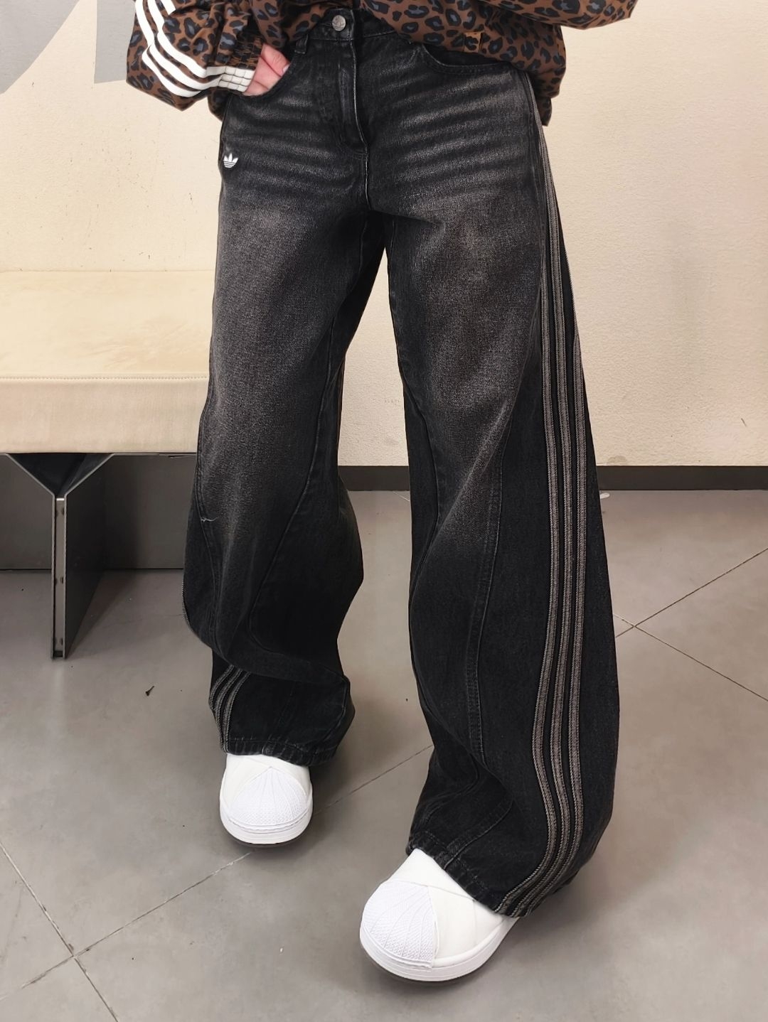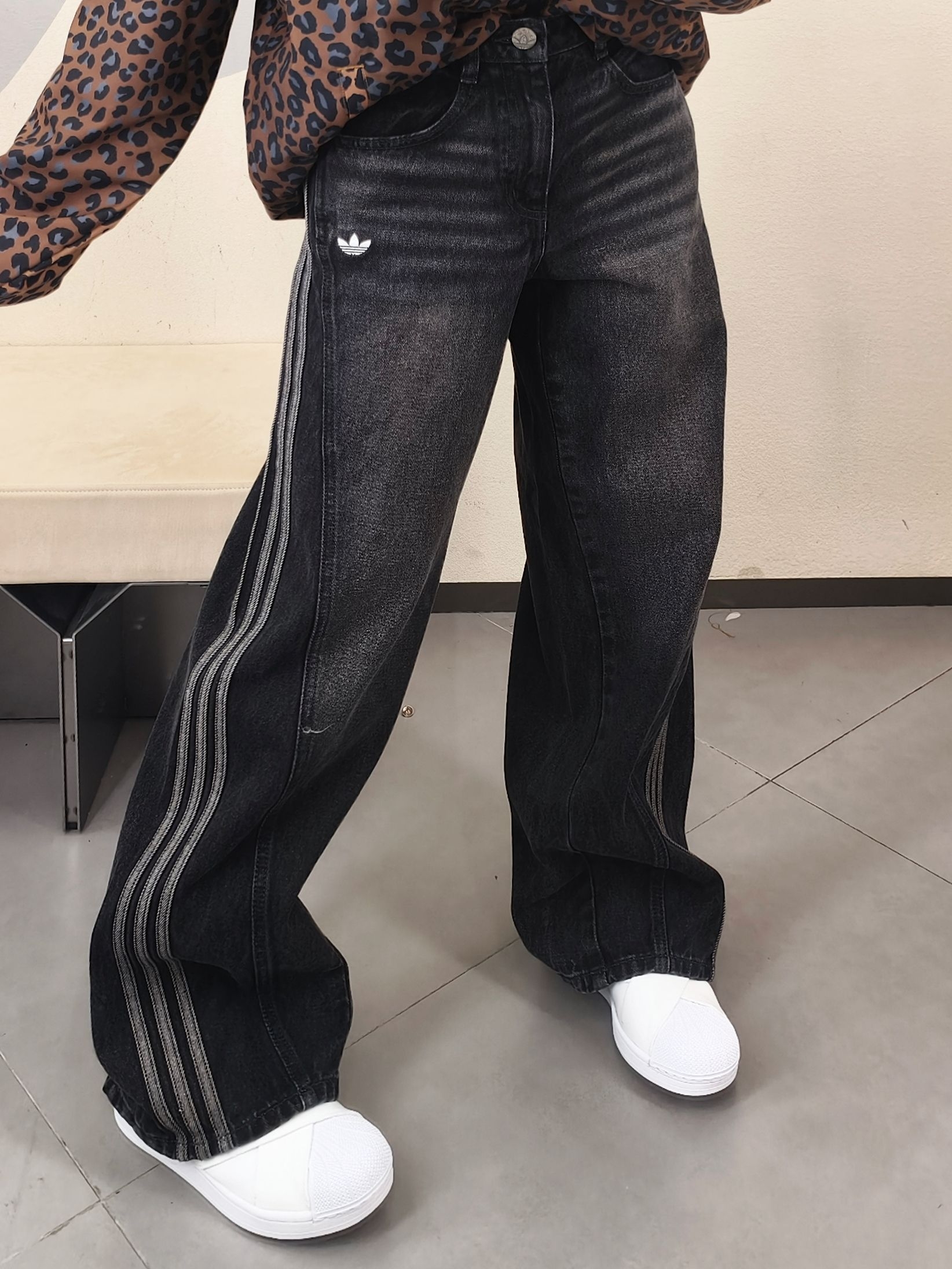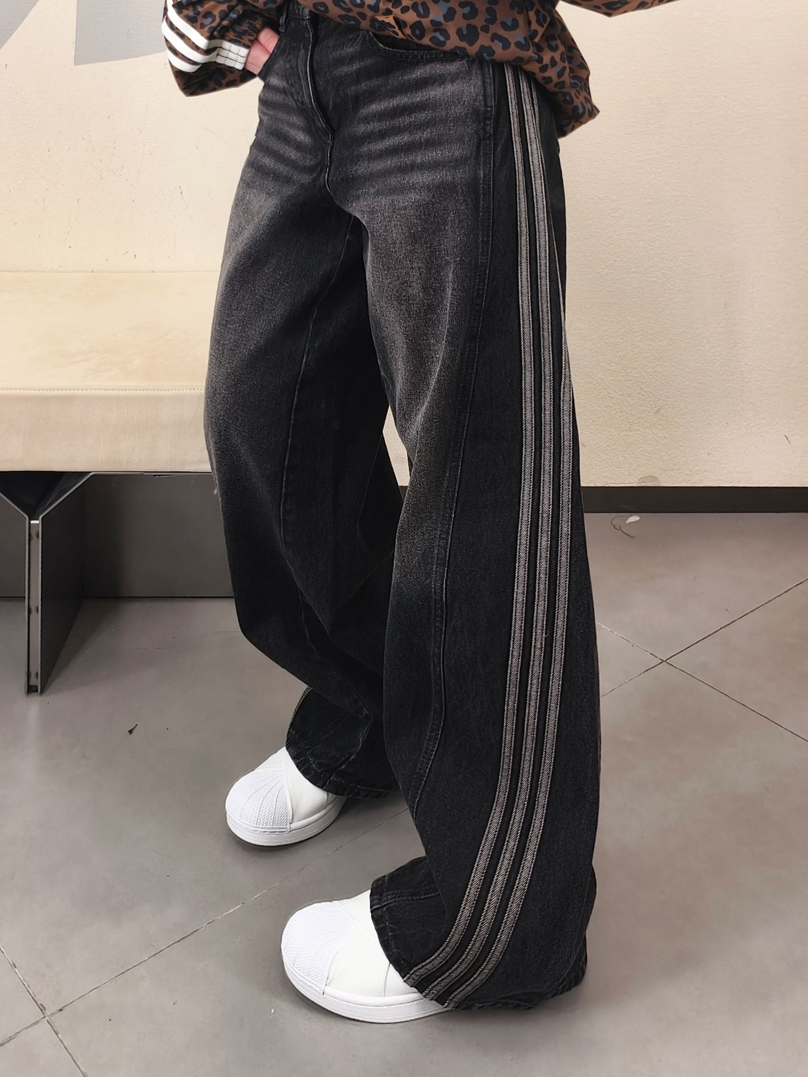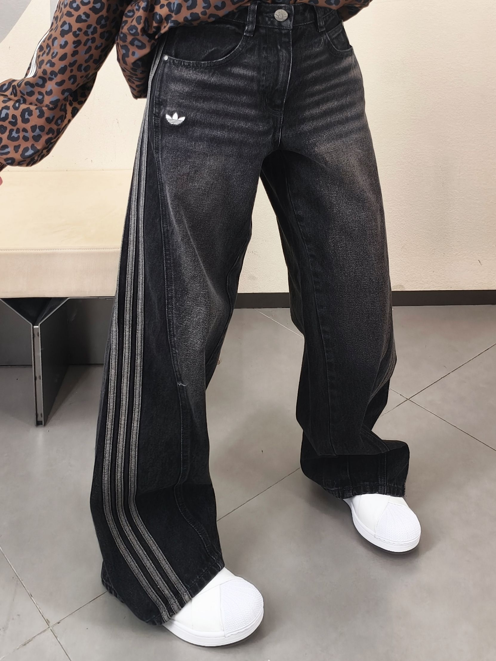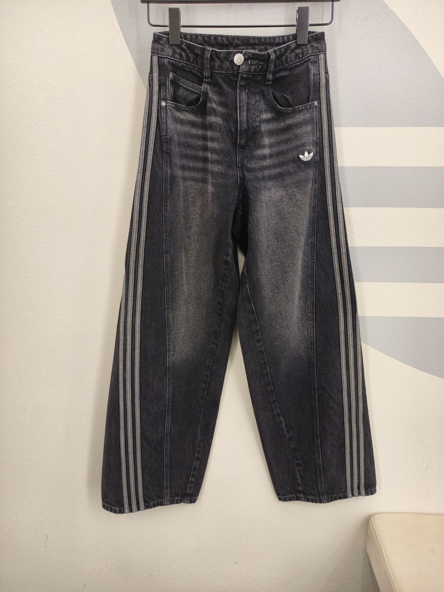 👖 纯棉丹宁材质,水洗做旧黑灰色调,复古氛围感直接拉满~ 📏 宽松直筒版型+侧边三条杠,修饰腿型超友好,梨形身材轻松驾驭! ✨ 三叶草小标点缀,搭配短上衣或卫衣,日常通勤、街头穿搭都很百搭!