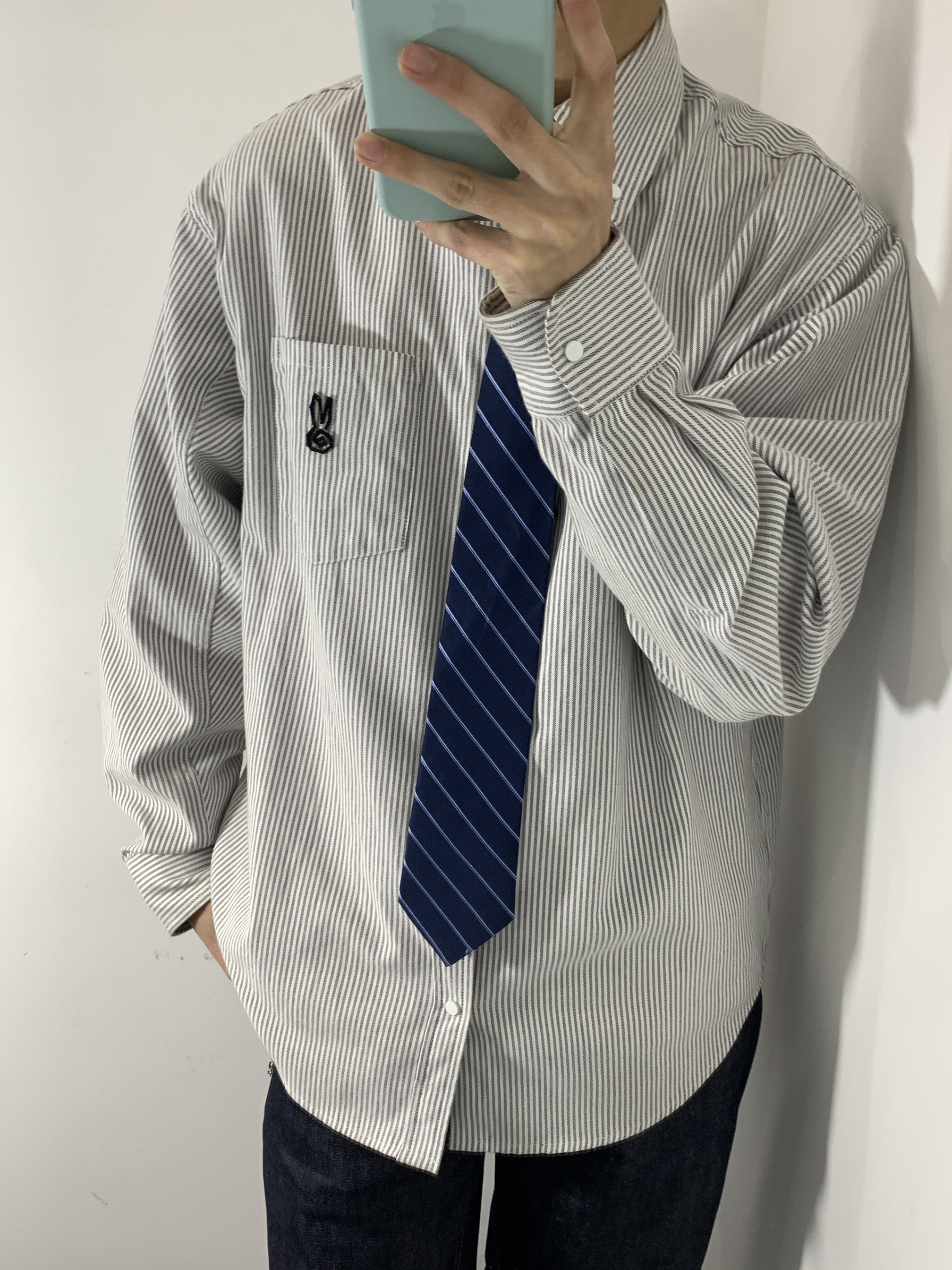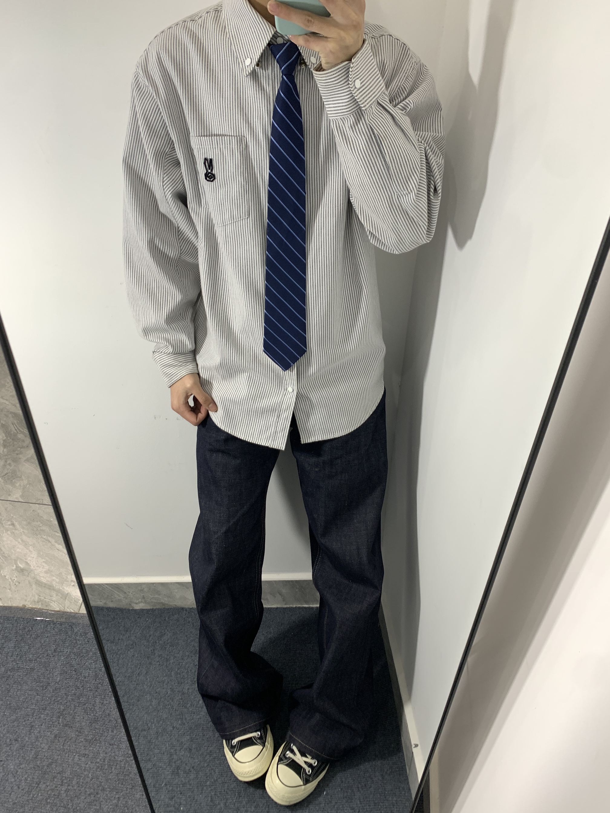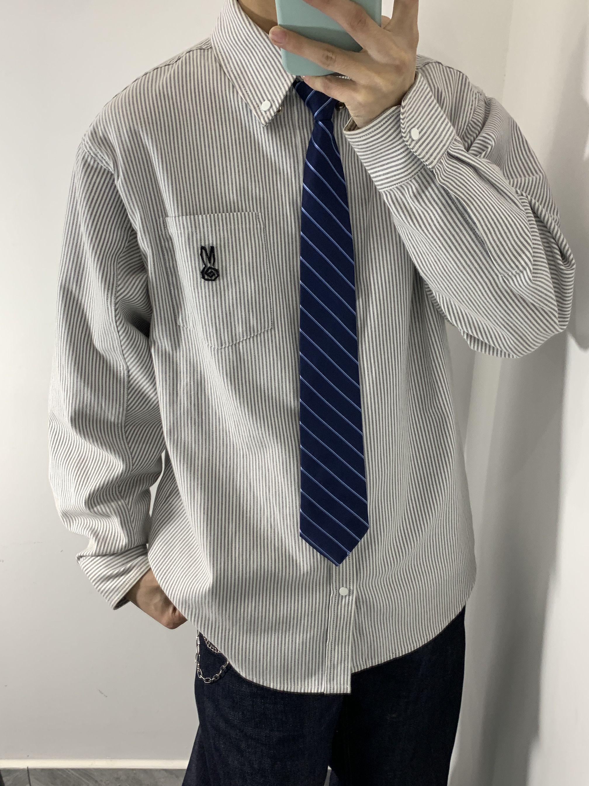 灰白条纹衬衫搭配藏青条纹领带,再配上深色阔腿牛仔和帆布鞋,既有学院风的清爽,又不失日常的松弛感,通勤出街都很合适。