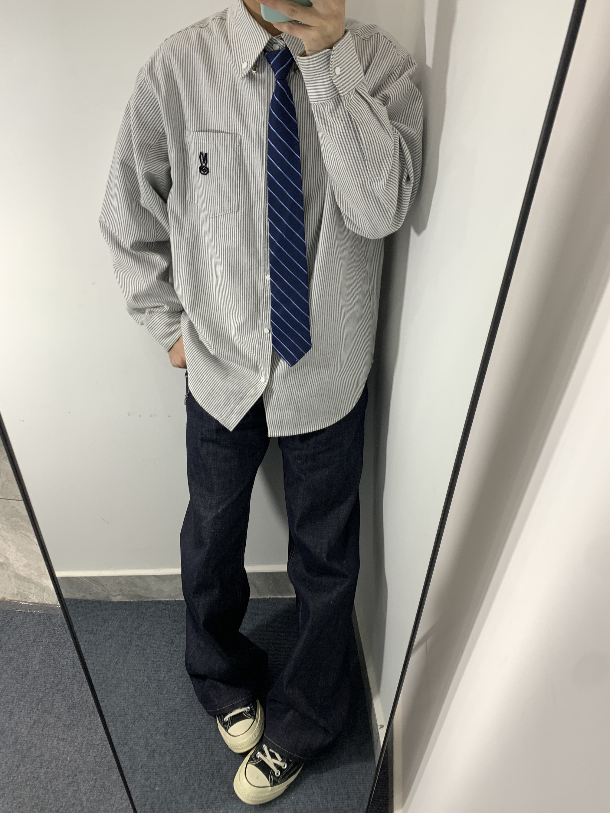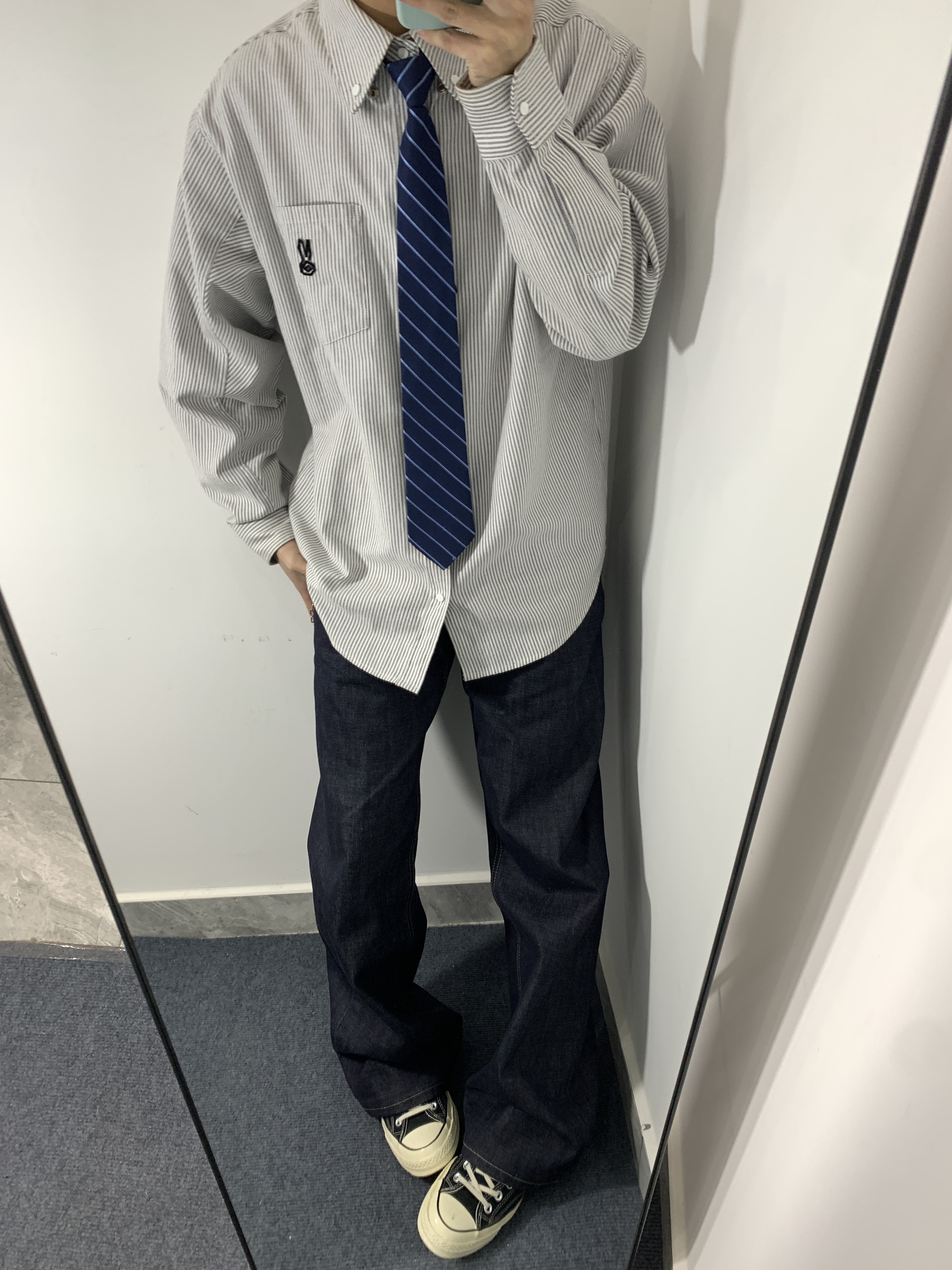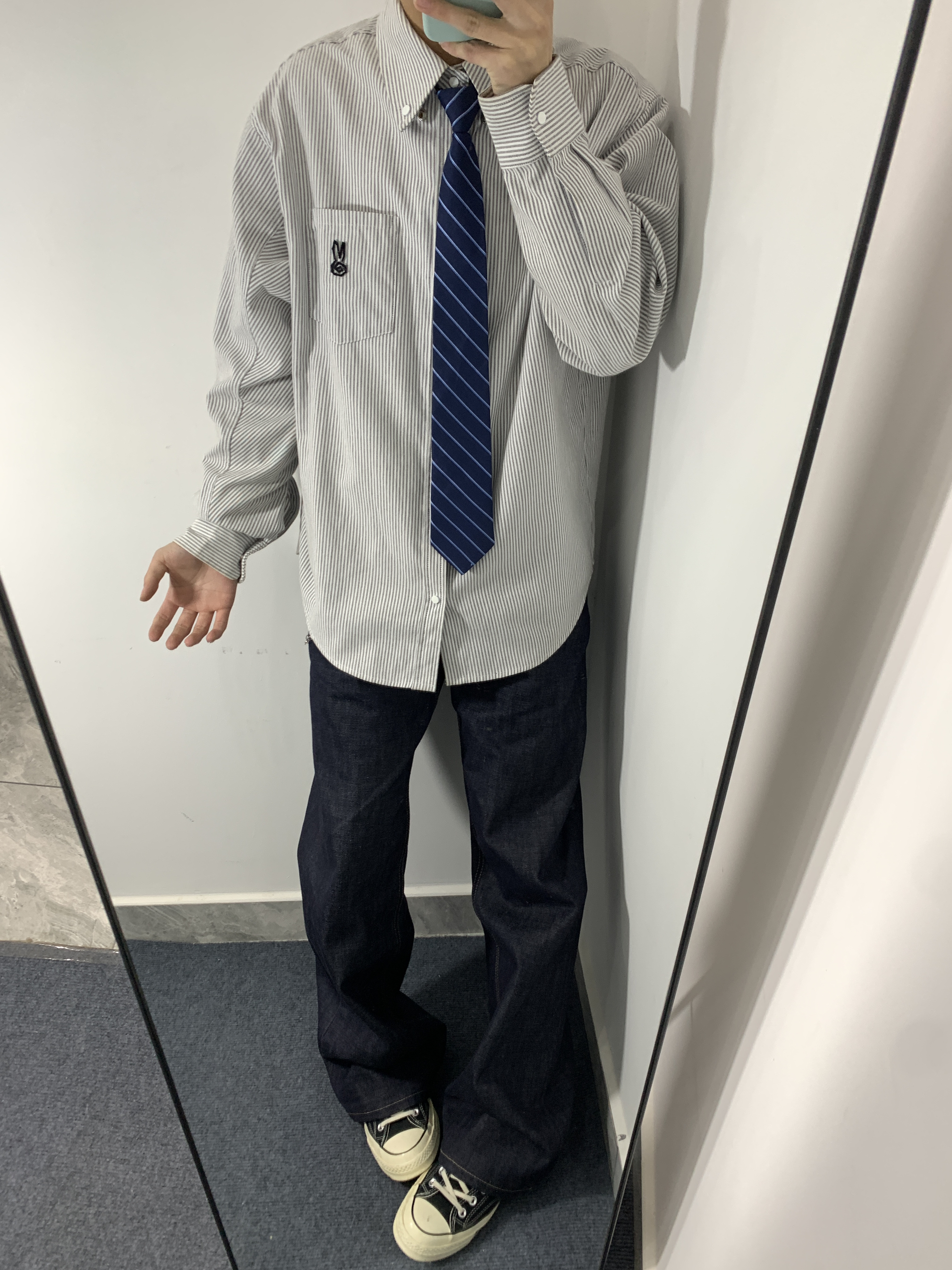 灰白条纹衬衫搭配藏青条纹领带,再配上深色阔腿牛仔和帆布鞋,既有学院风的清爽,又不失日常的松弛感,通勤出街都很合适。