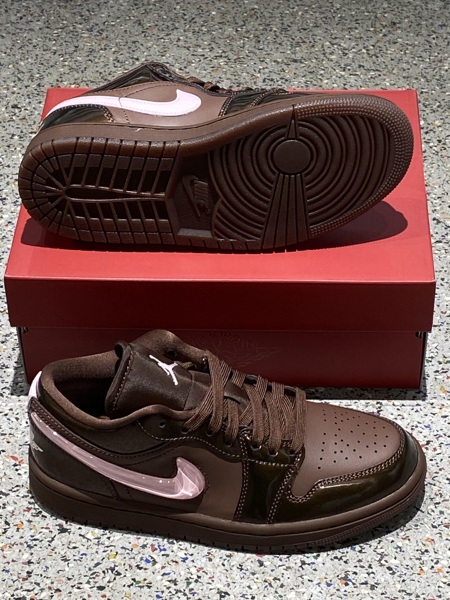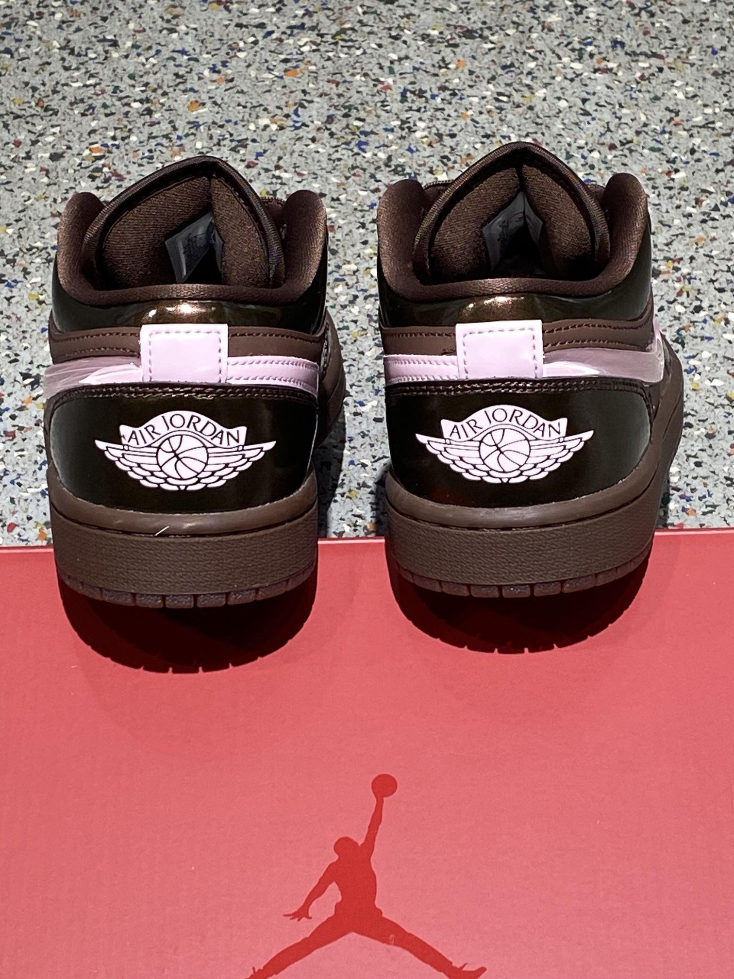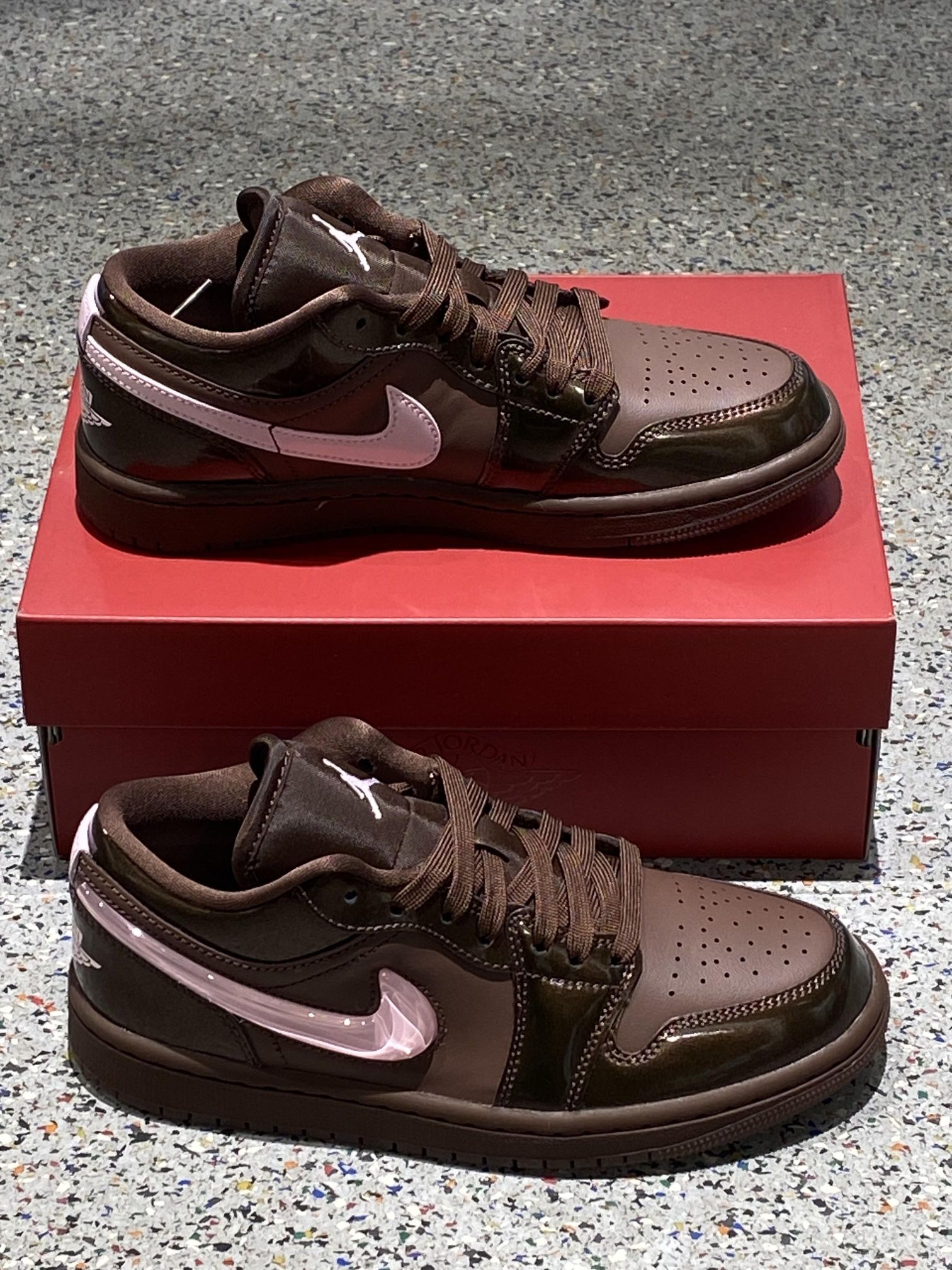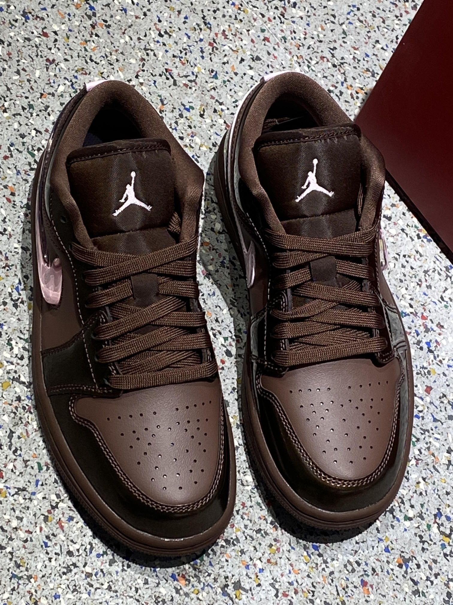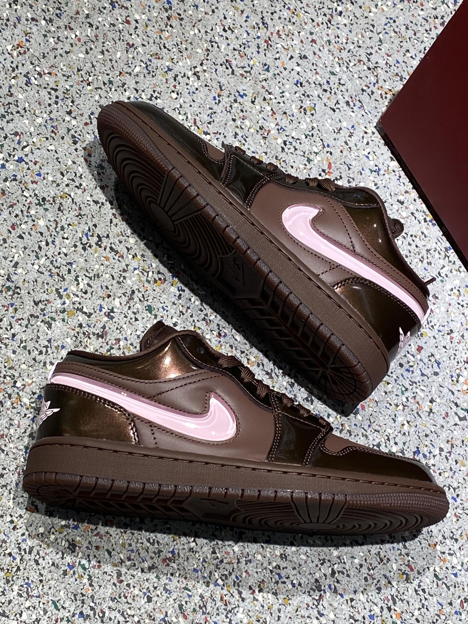 把甜酷穿在脚上:焦糖粉 Jordan 与亮面漆皮拼接,搭配淡粉色 Swoosh 标志,营造出甜酷兼具的视觉效果,契合情人节浪漫氛围。 属于 AJ1 Low 系列,低帮设计兼顾复古造型与日常穿搭的灵活性,适合搭配休闲、甜酷风格的服饰。
