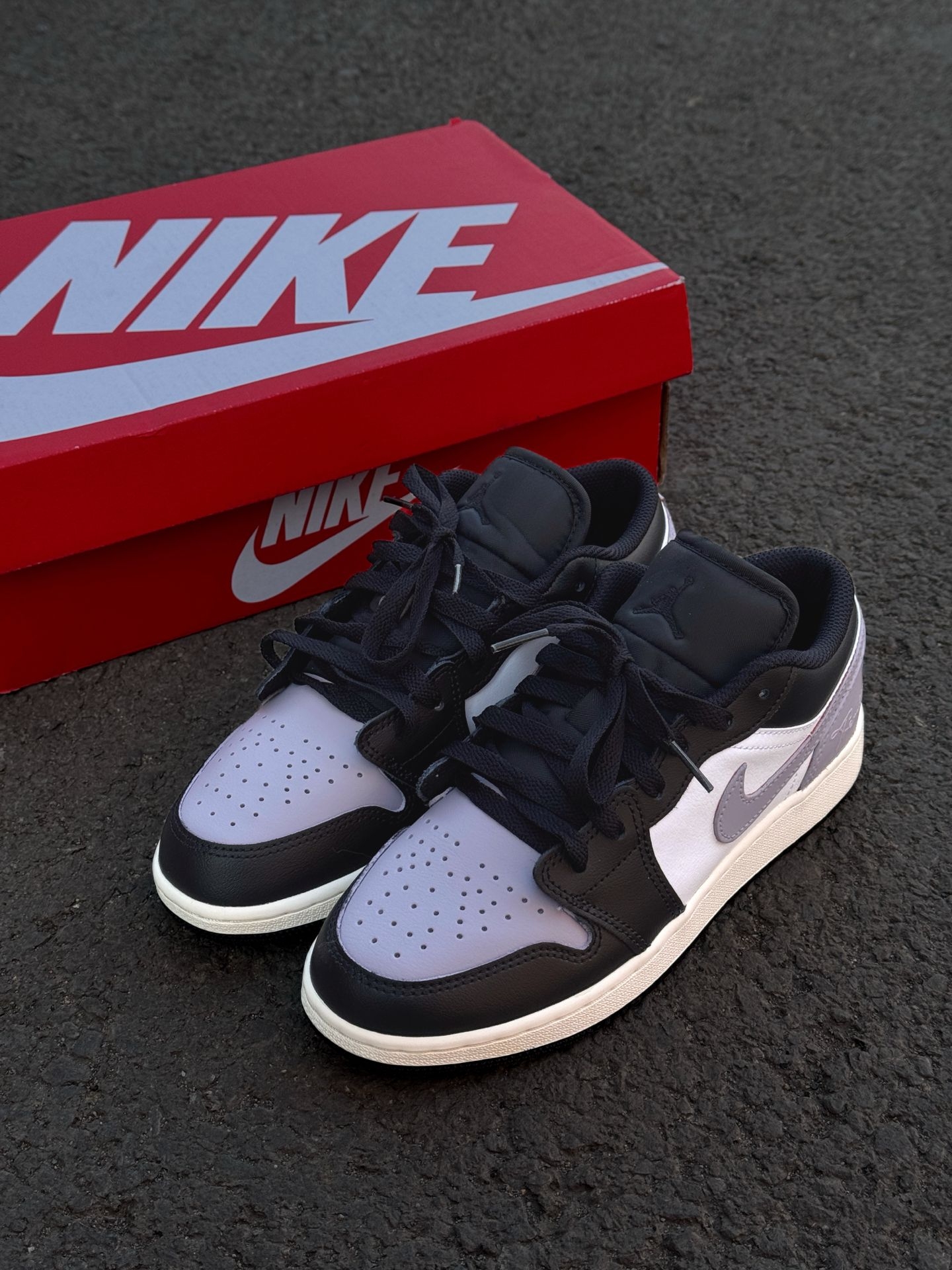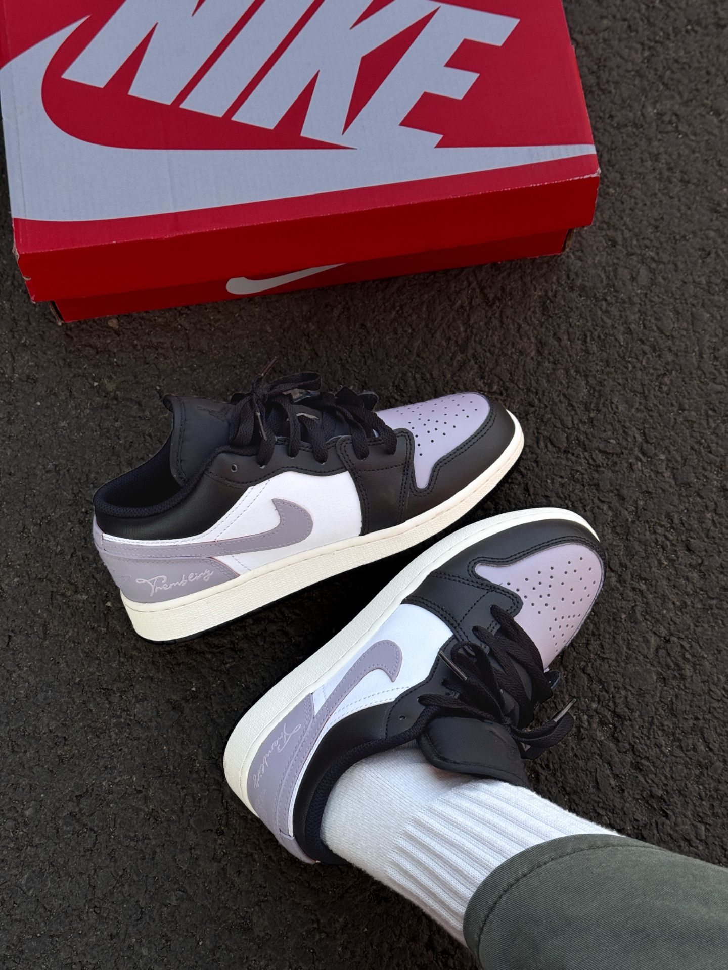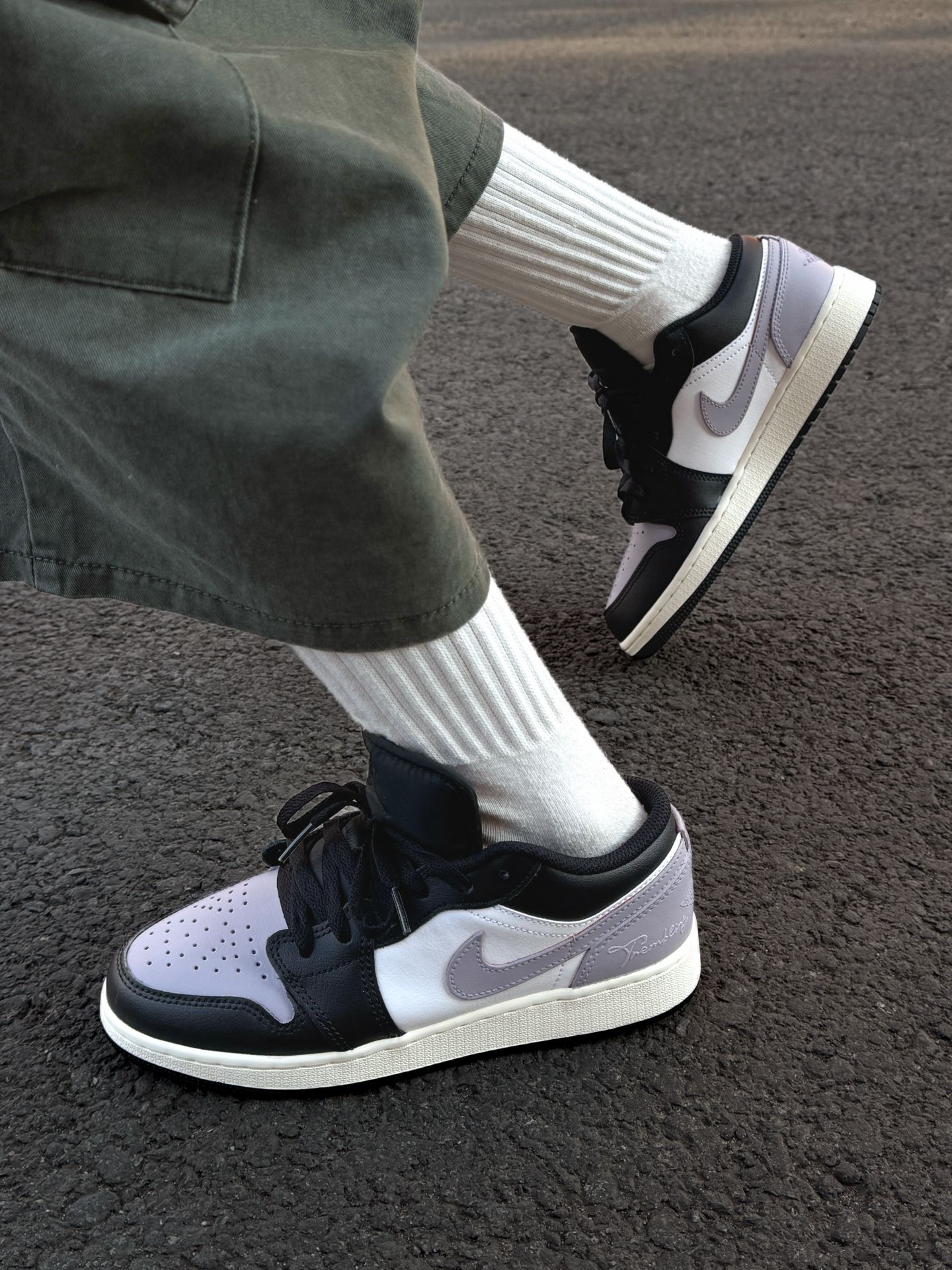 就是这双雾感香芋紫AJ1,整体版型hin正,上脚还挺显脚小的 黑、白、紫三色拼色走极简风,设计干净利落,搭配起来不挑衣服 后跟还有一处小巧的涂鸦点缀,低调又有细节感 介双穿了一下午脚也不累,整体很轻便 鞋面用的是皮革材质,日常好打理,通勤上下班都合适~