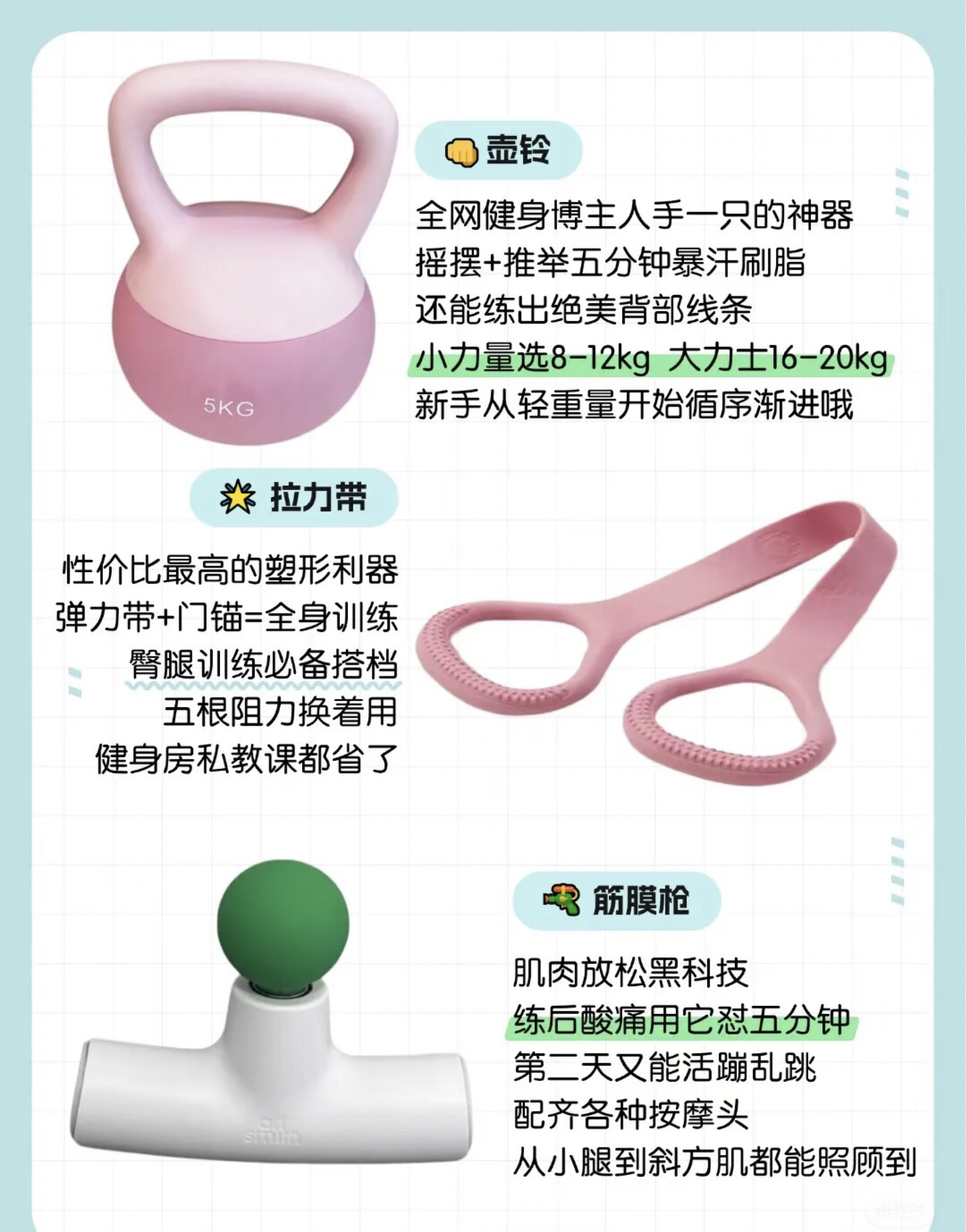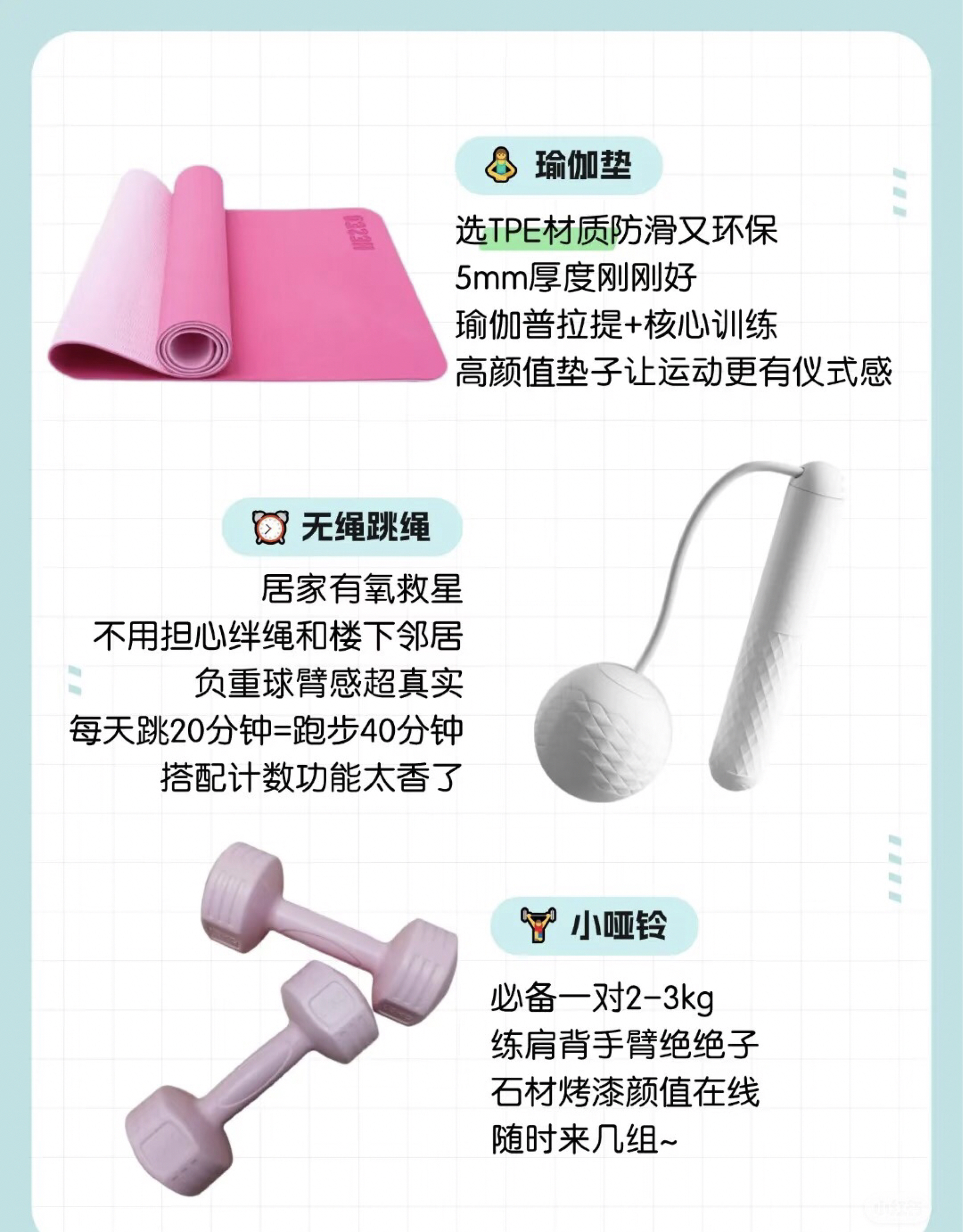 不用凑健身房,角落堆一套就能动起来~ 盘点一波“藏得住”的迷你器材,覆盖力量、有氧、核心,收纳全能塞抽屉 每款都适配1㎡空间,追剧、家务间隙随手练 💡 选购Tips: 不用盲目追求大牌 但一定要选环保材质 新手建议2-3件入手 慢慢添置更理性