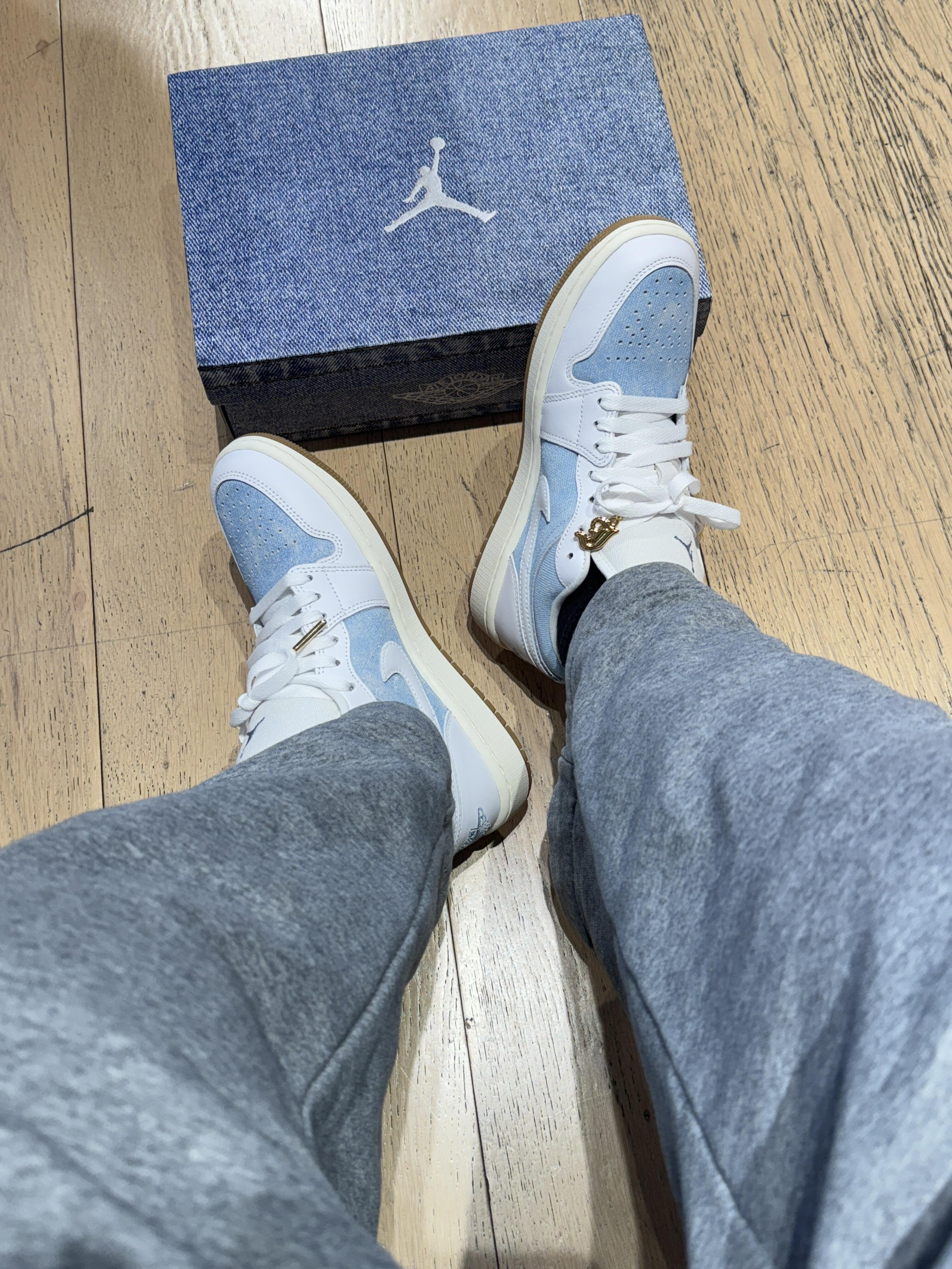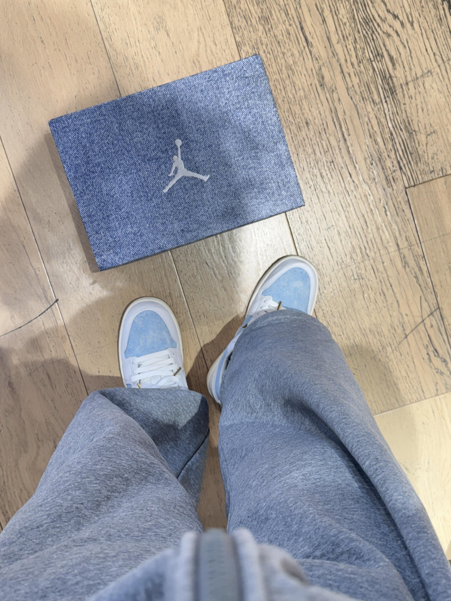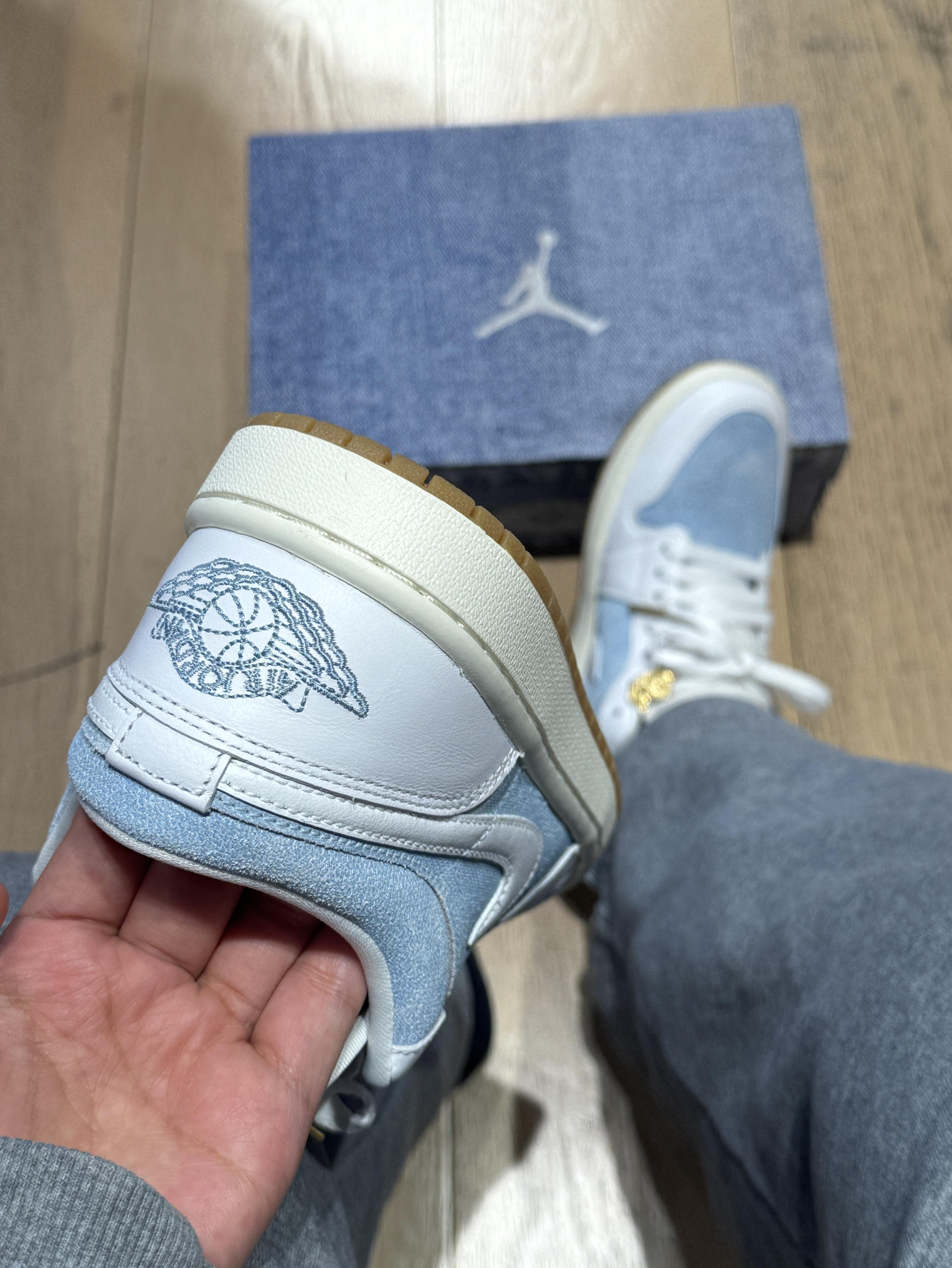 今天是被这双浅蓝牛仔AJ1拿捏的一天~淡蓝牛仔布+奶白皮质的拼接太戳我了像把海盐冰淇淋踩在脚上,清爽感直接拉满! 鞋盒也是同色系牛仔布,细节控狂喜。后跟的篮球刺绣金色鞋扣,低调里藏着小精致,搭配浅灰卫裤就很有松弛感,日常通勤或周末逛gai都适配。