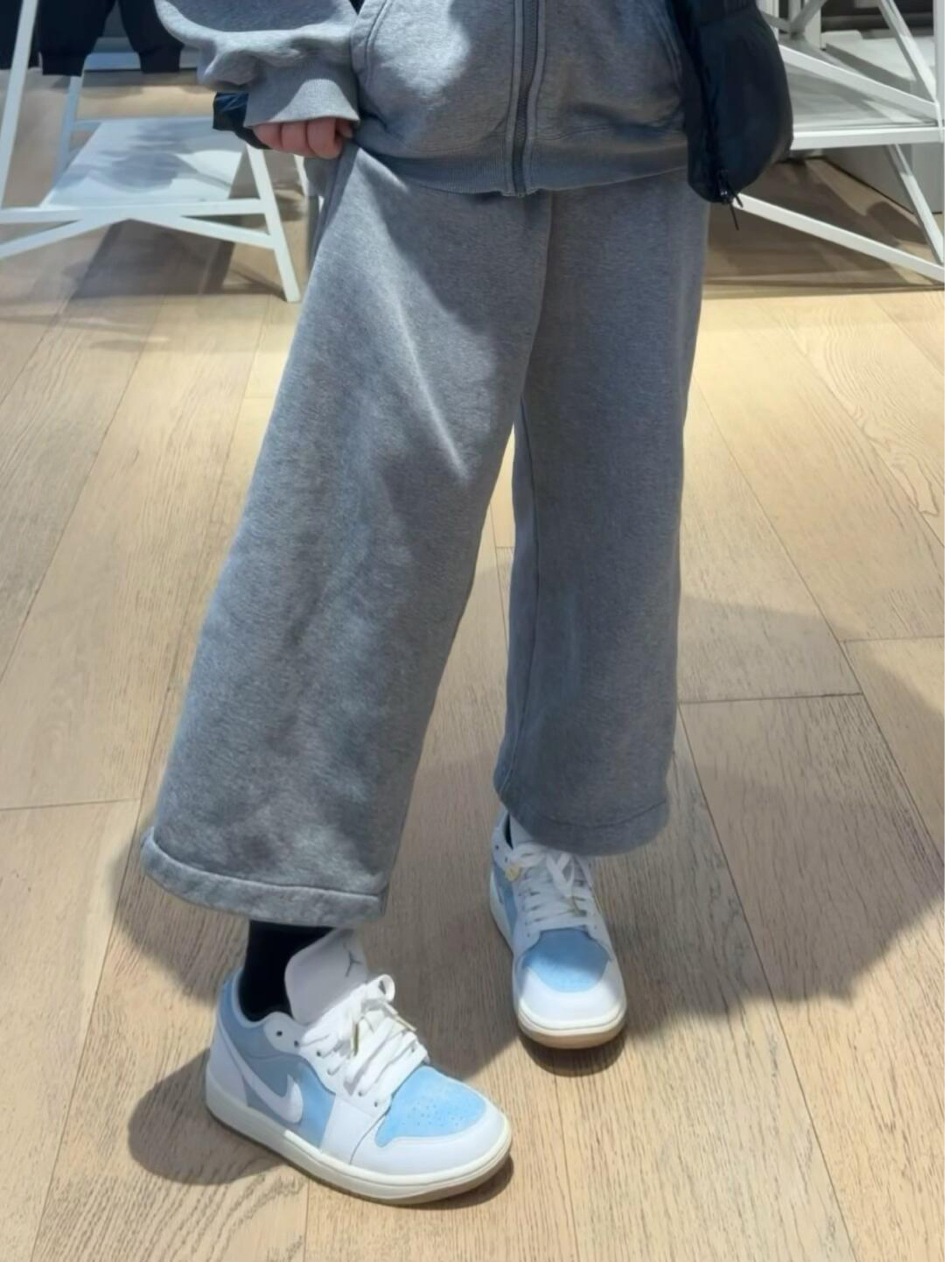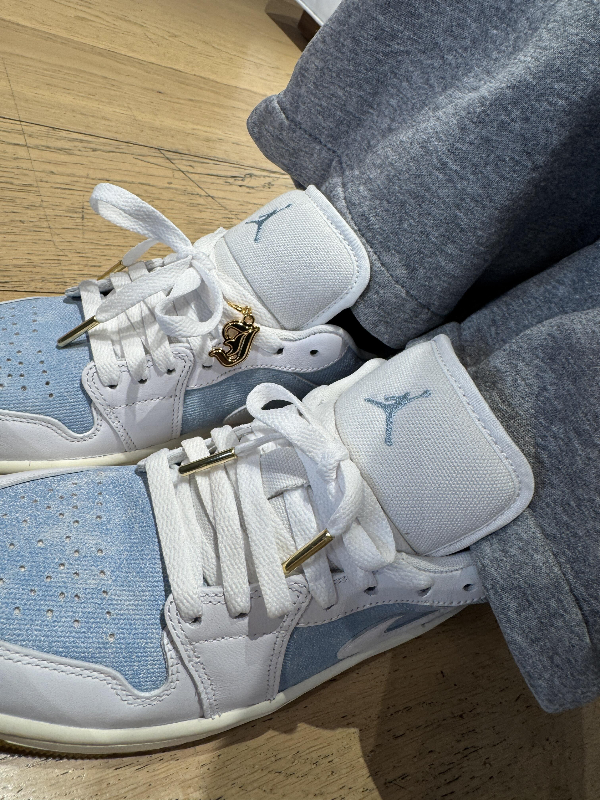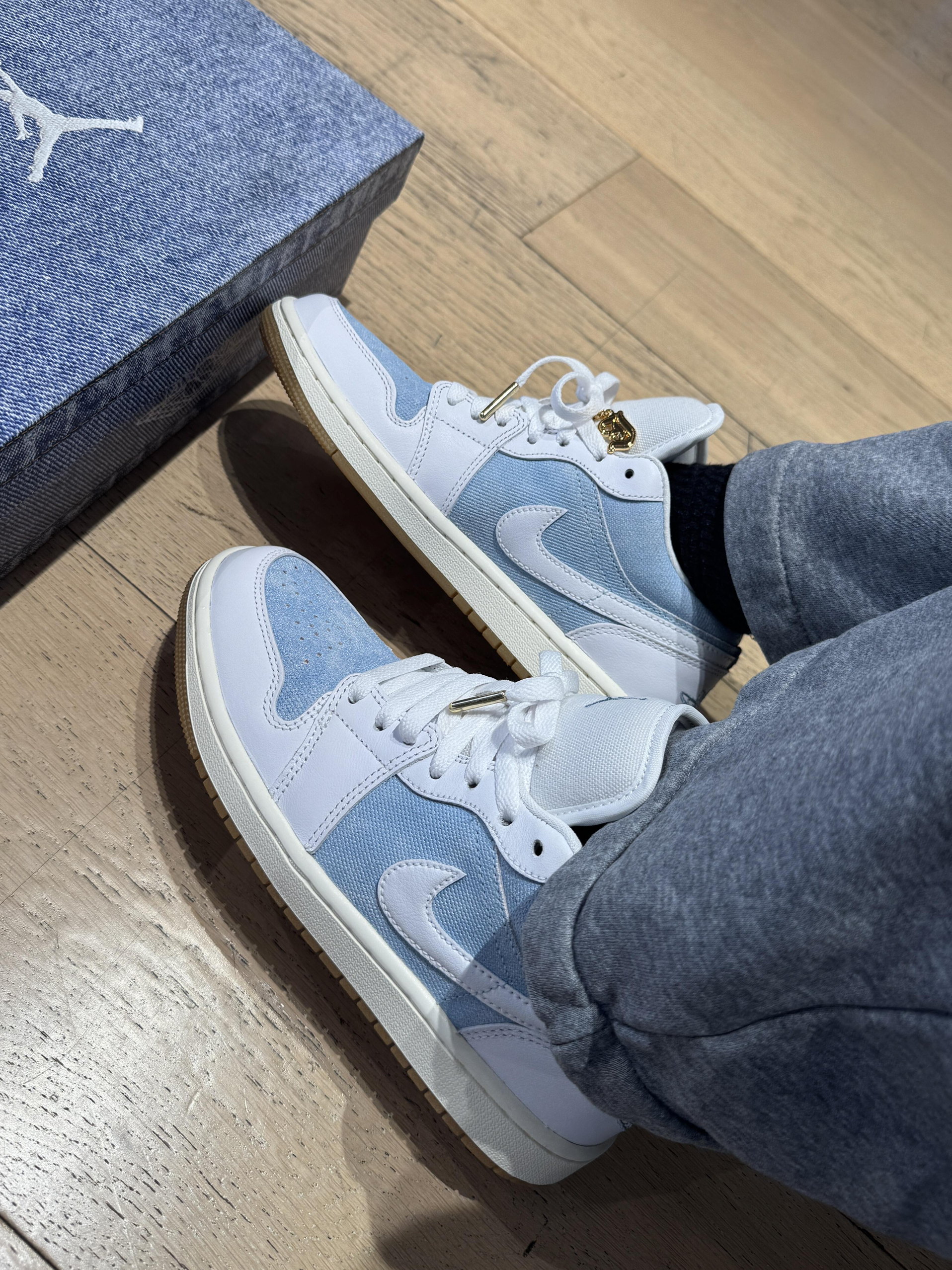 今天是被这双浅蓝牛仔AJ1拿捏的一天~淡蓝牛仔布+奶白皮质的拼接太戳我了像把海盐冰淇淋踩在脚上,清爽感直接拉满! 鞋盒也是同色系牛仔布,细节控狂喜。后跟的篮球刺绣金色鞋扣,低调里藏着小精致,搭配浅灰卫裤就很有松弛感,日常通勤或周末逛gai都适配。