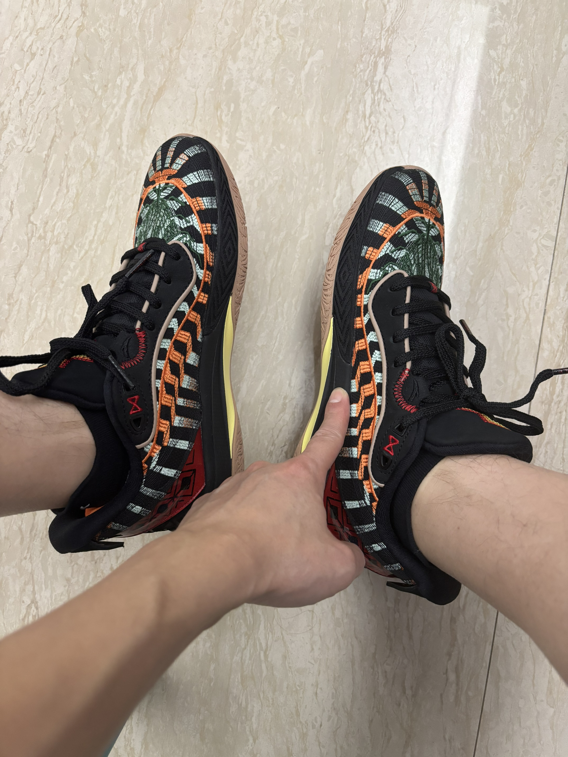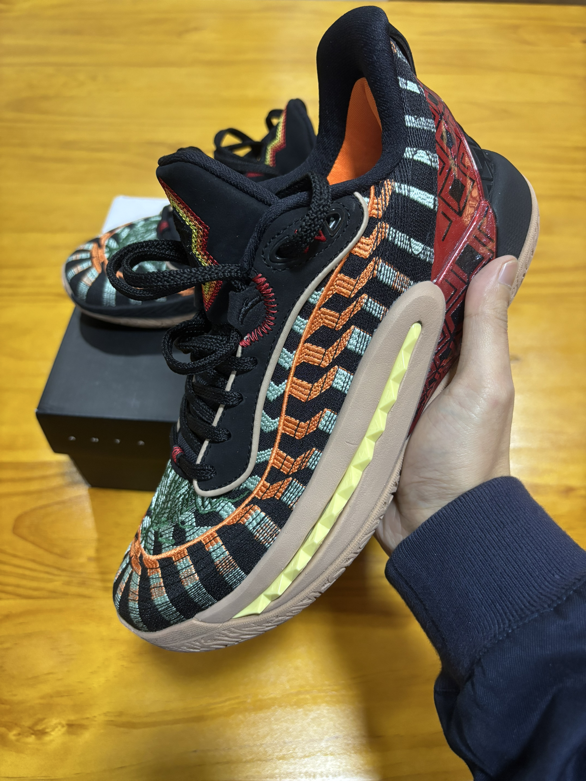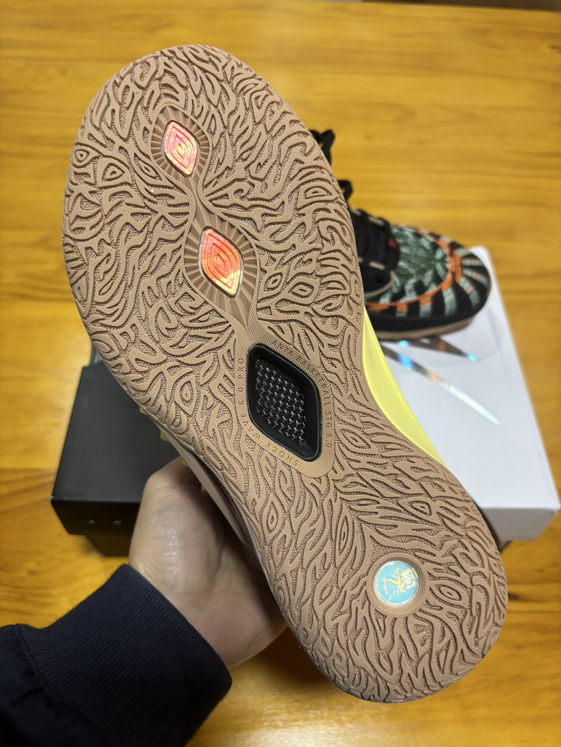 原价1199元,前几天活动识货APP有红包补贴最终2张多拿下,等等党必胜!!设计和用料很有质感和辨识度,这个虎斑配色的踏子logo弱化加上这种印第安部落的民族元素,个人很喜欢!! 实战2次后感受:静态脚感相对板硬,静态力线是正的,跑动过度是非常流畅,但跑动起来会引导动态轻微内扣,前掌的氮气Pro在突破变相蹬地反应极为灵敏!!!不是那种气垫的弹射感,这要比气垫反应来的快,变相过人胜负往往就在那零点...