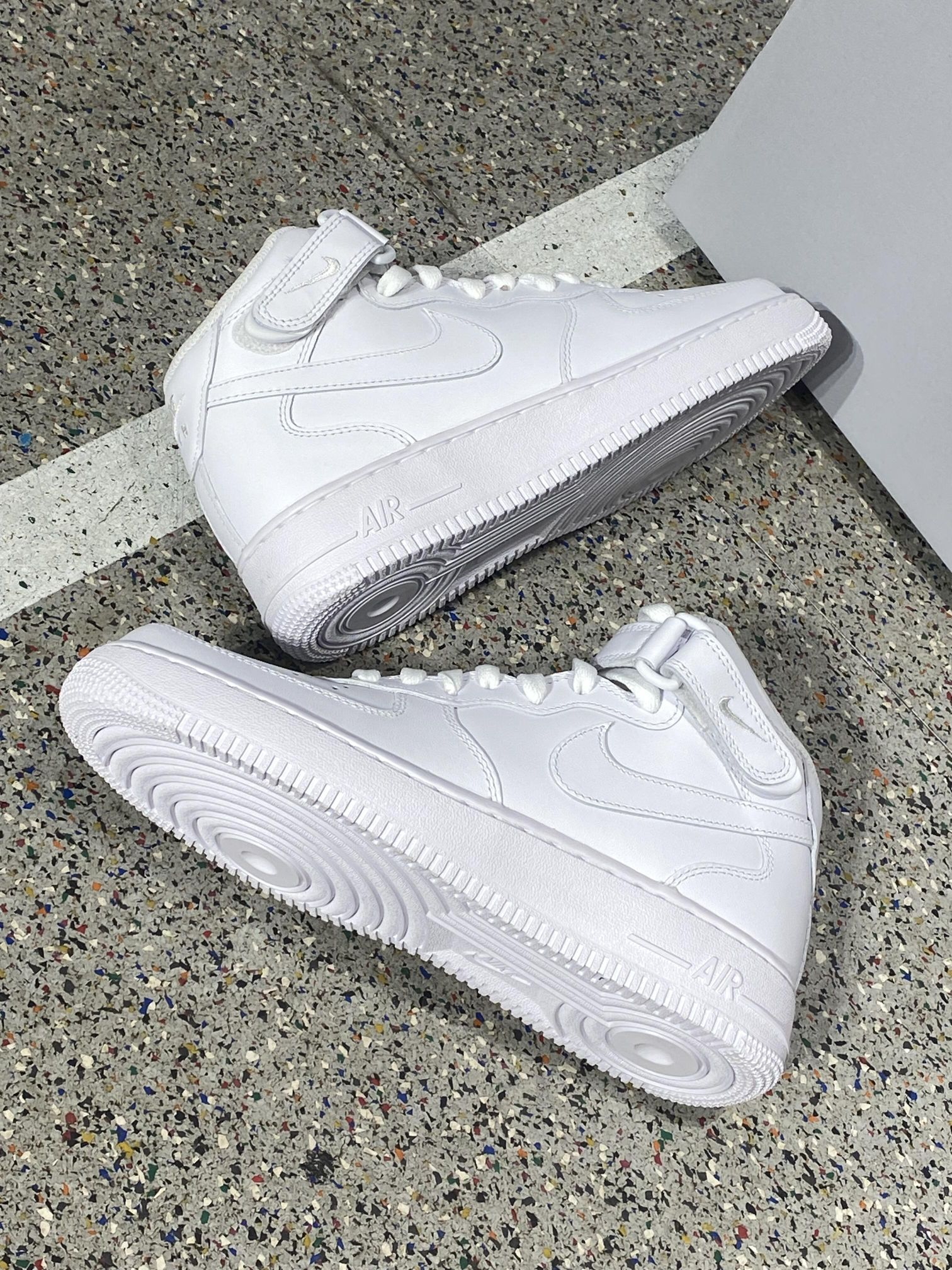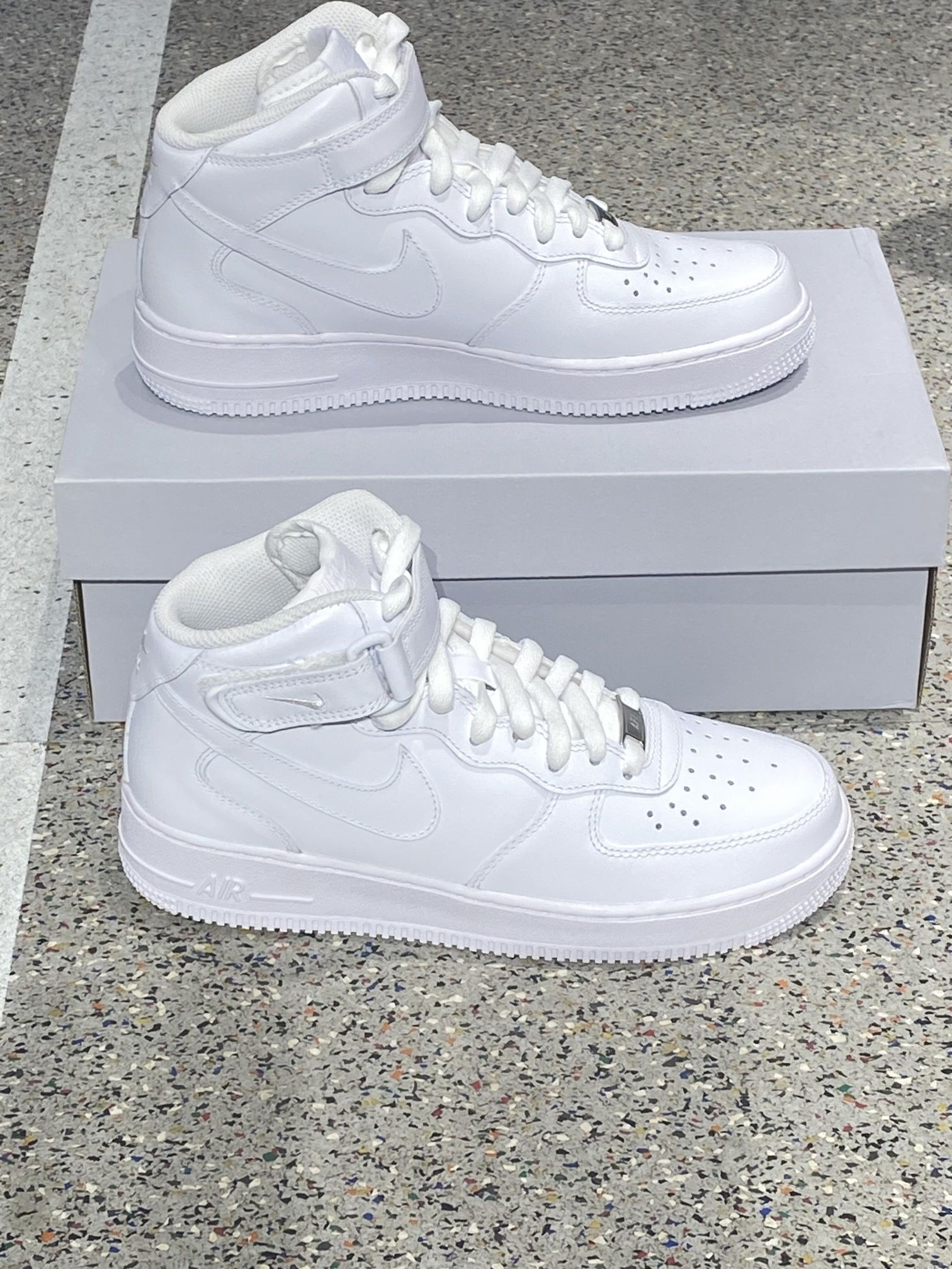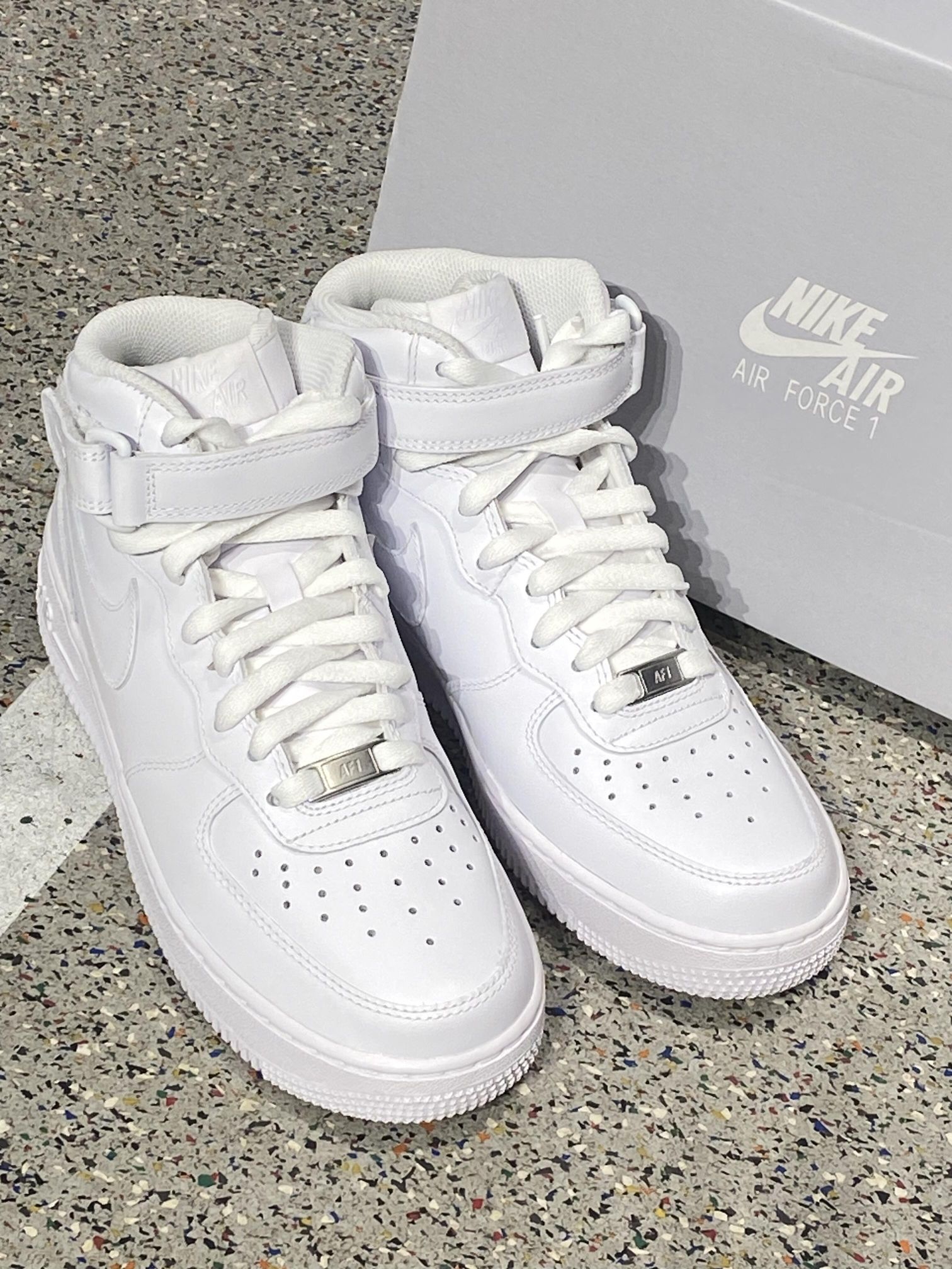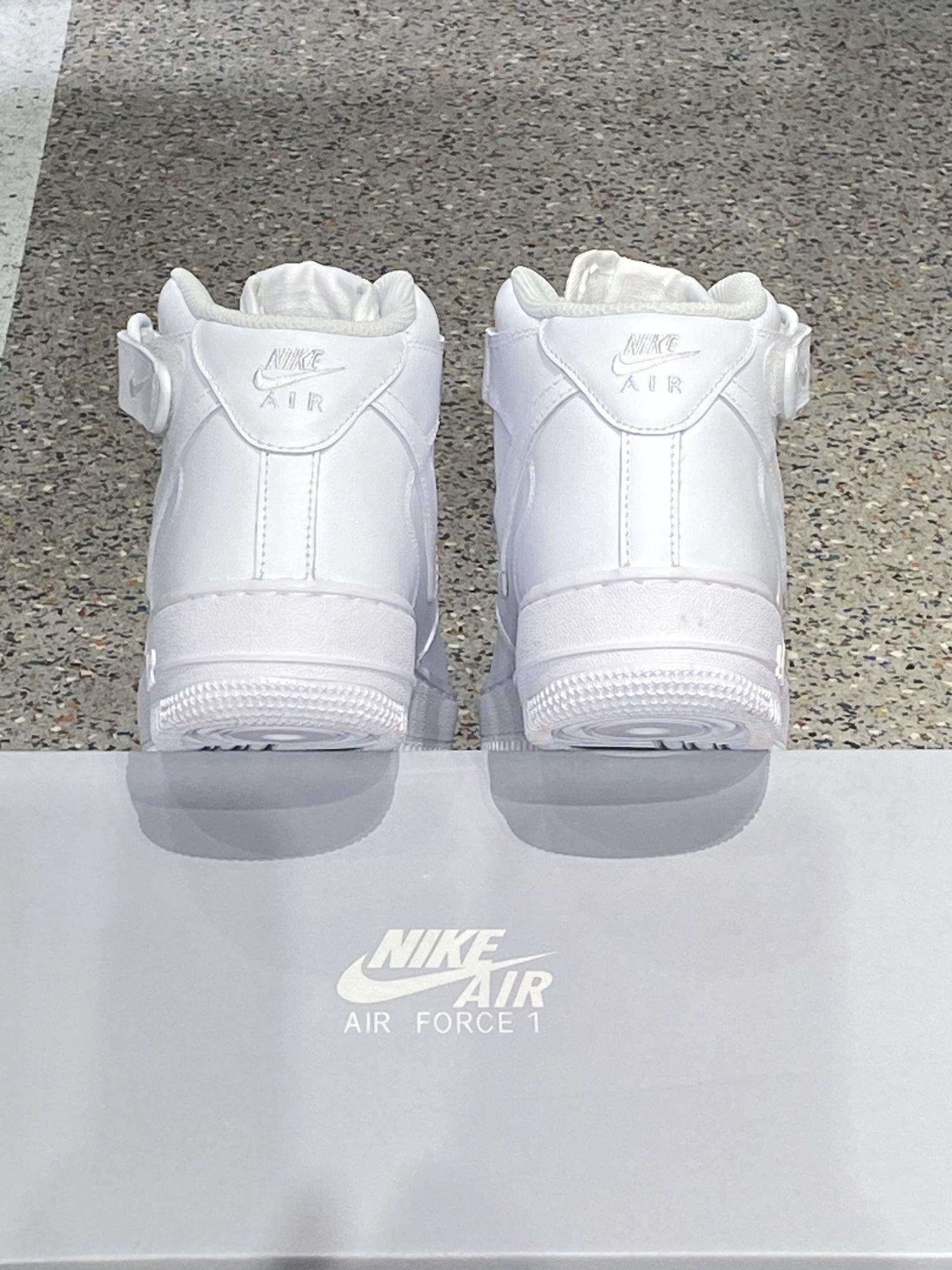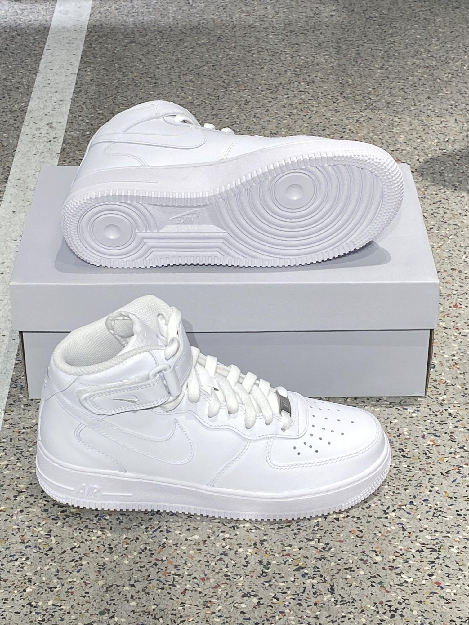 白色太百搭了!白月光! Nike Air Force 1 Mid 街头潮流与日常穿搭的标志性鞋款,覆盖男女款及青少年款 白色皮革鞋面,易清洁且风格简约百搭 鞋头打孔设计提升透气性,中帮鞋口搭配魔术贴绑带,兼顾包裹性与复古风格 搭载Nike Air缓震中底,兼具舒适性与支撑性,橡胶外底提供防滑耐磨性能