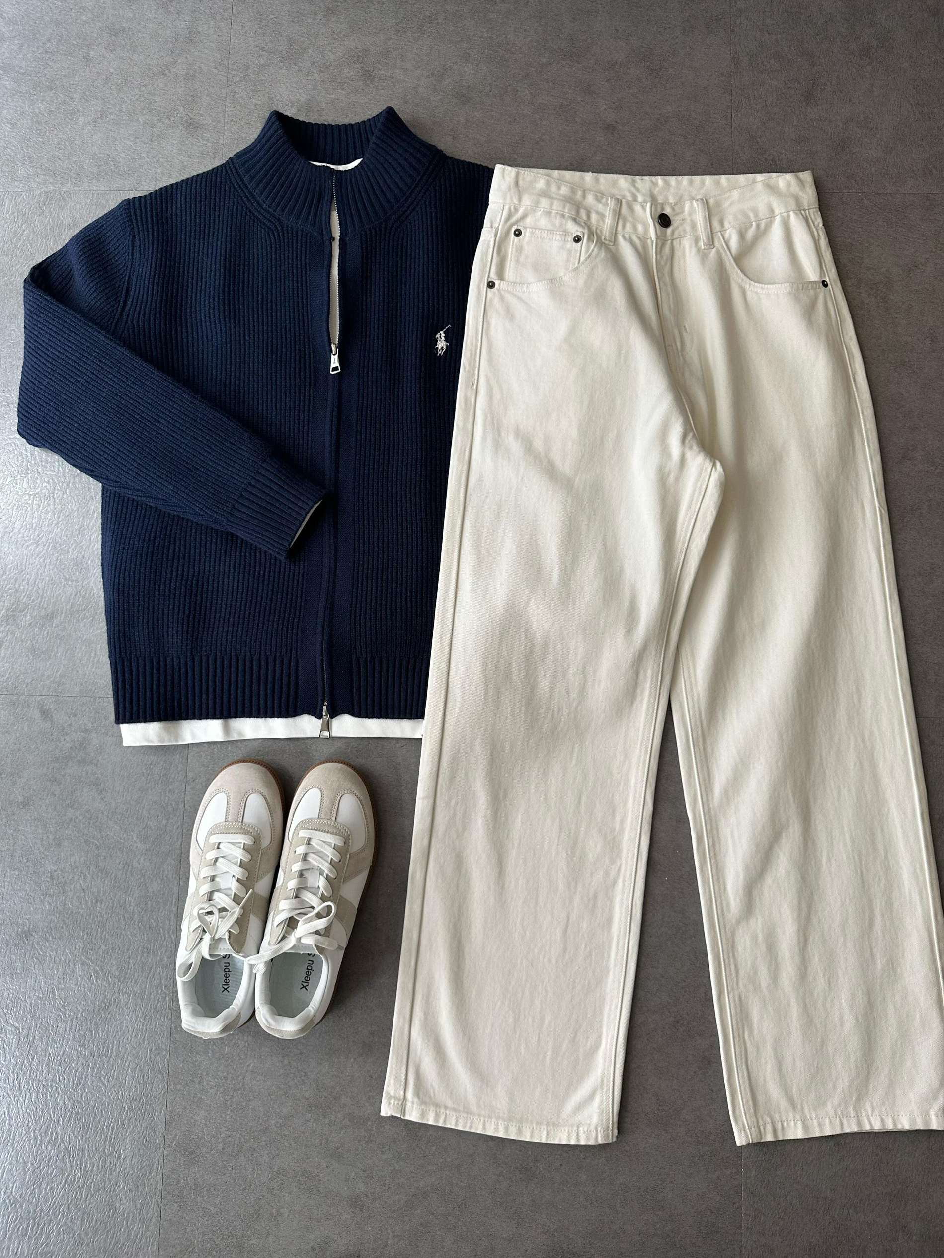 藏青针织开衫+米白阔腿裤,配色干净温柔。简约不费力,日常出街氛围感拉满。