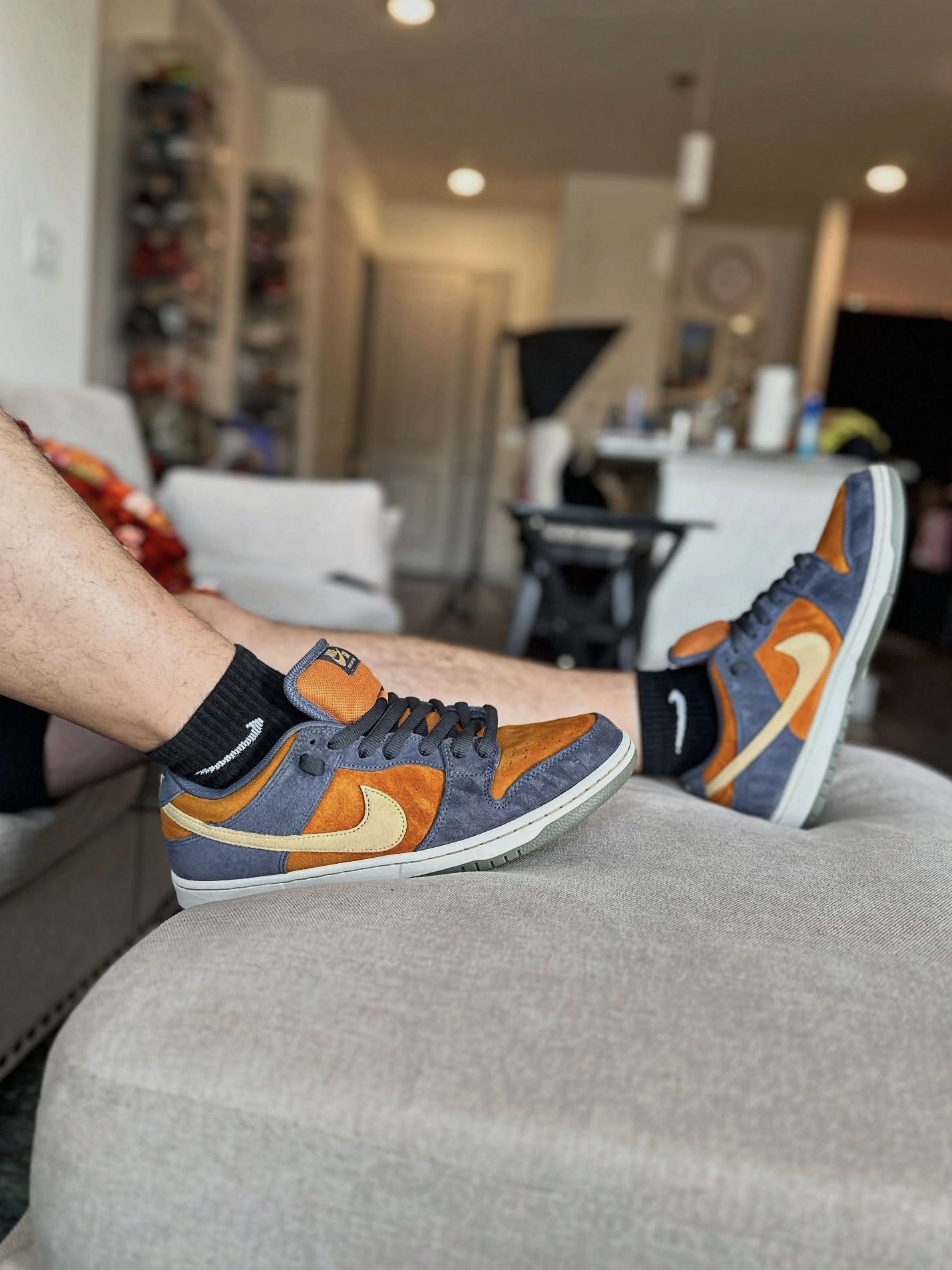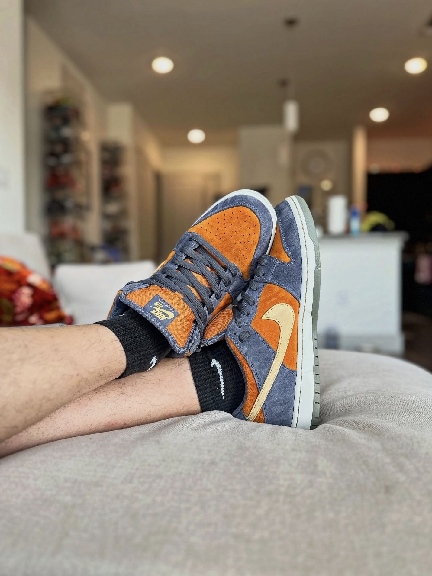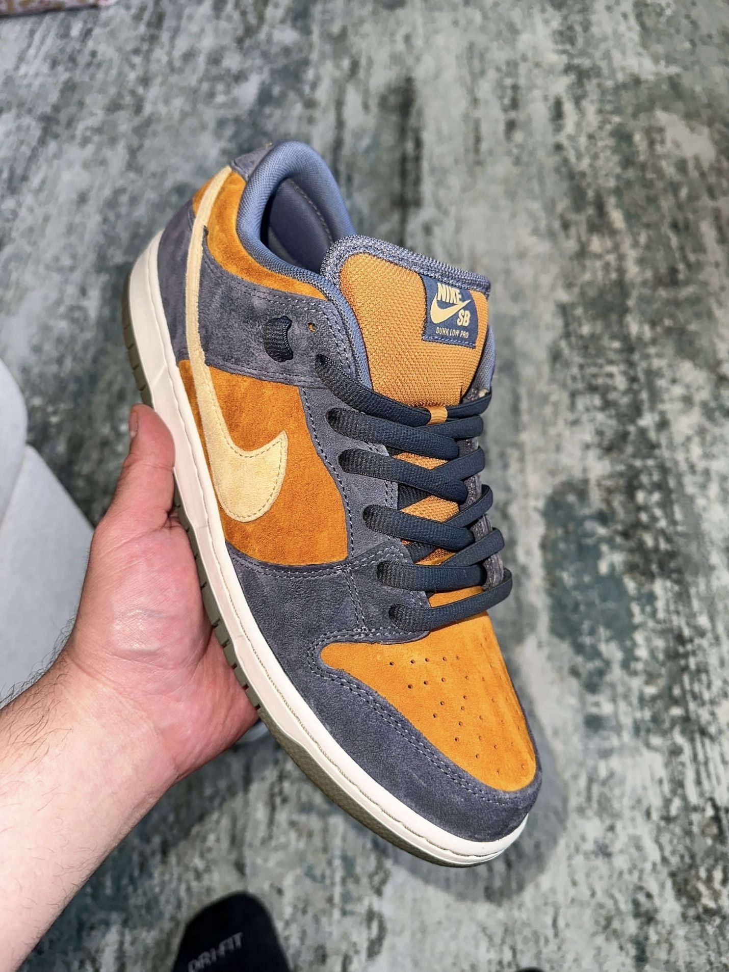 我觉得这双Nike Dunk SB Low "Light Carbon"还挺耐看的,灰蓝和橙棕的翻毛皮拼接,颜色不扎眼,日常穿挺合适。 这阵子通勤、逛店都穿它,翻毛皮的质感还行,走久了脚也不会太酸,中底的缓震对我来说够用了。辨别的话,我一般会先摸翻毛皮,正品的绒毛比较均匀,不会一摸就掉毛;再看鞋舌的标签,正品的印刷和走线都比较规整。 整体来说,这双鞋属于那种不挑搭配、穿久了也不会腻的类型,...