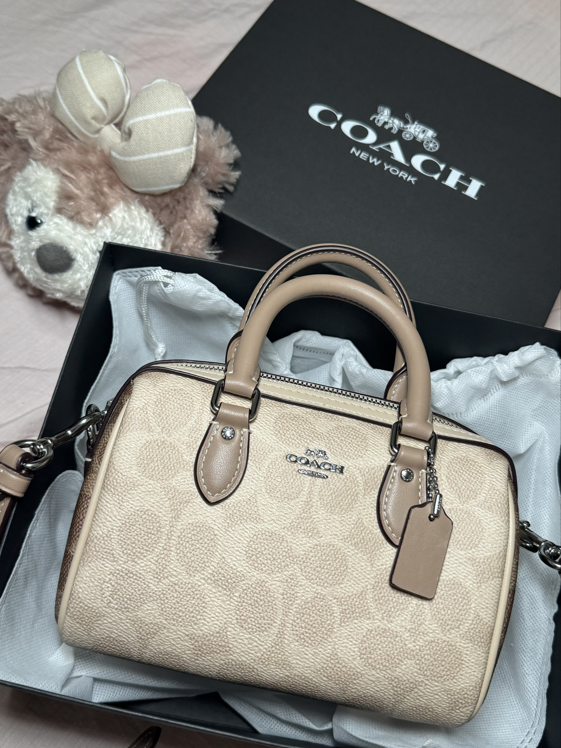 COACH Rowan18奶茶色波士顿包,小号尺寸很精致,PVC材质耐磨好打理,日常用不娇气。奶茶配色温柔耐看,经典老花不挑穿搭,四季都合适。可拆卸肩带,手提、单肩、斜挎三种背法切换很方便。包型挺括不软塌,容量够用,手机、口红、钥匙、粉饼都能装下。拉链开合安全,自重轻,背久不累。日常通勤、约会、逛街都适配,低调耐看,实用性与颜值都在线。