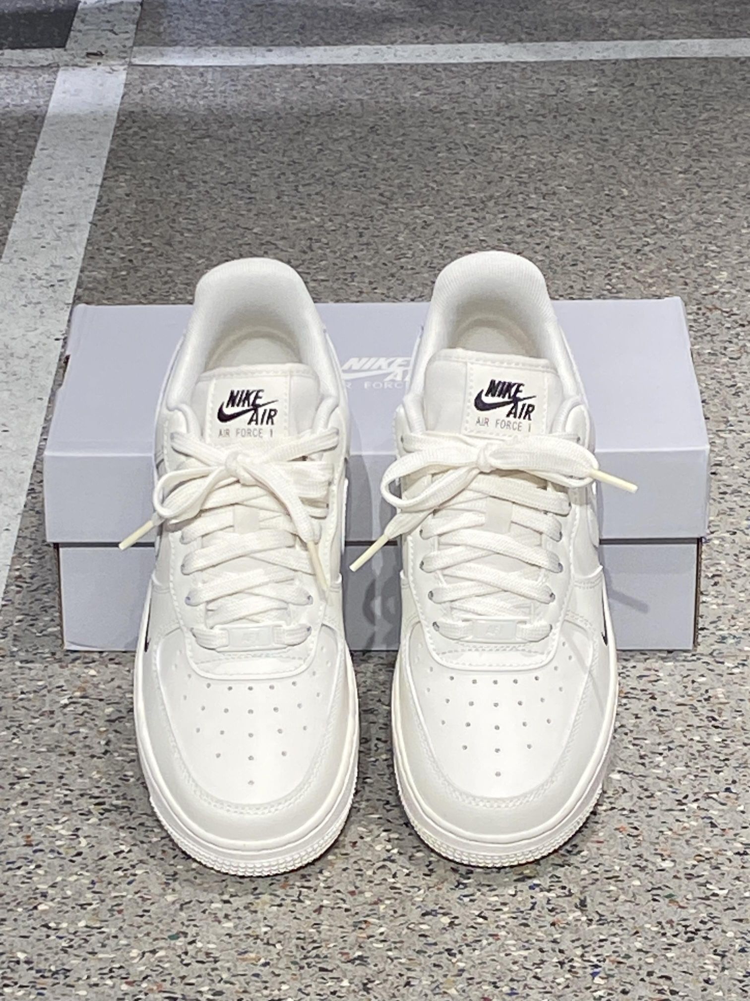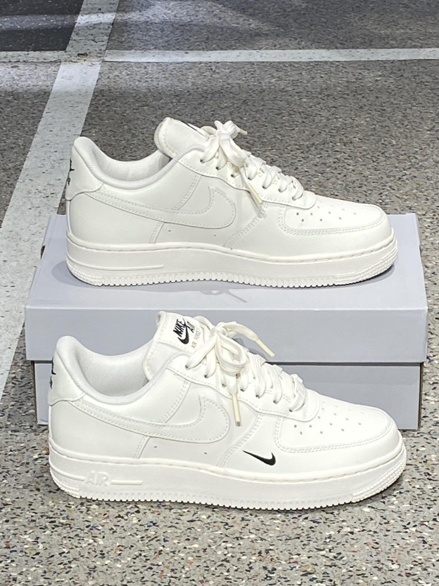 谁还没个小白鞋呢 Nike Air Force 1 米白小钩款运动鞋 米白色调,鞋身有大小不同的Swoosh钩形标志设计,其中小钩为黑色,形成视觉对比;皮质鞋面质感细腻,经典的Air Sole气垫大底保障穿着舒适,整体风格简约又不失细节感 可适配休闲、复古、街头等多种风格
