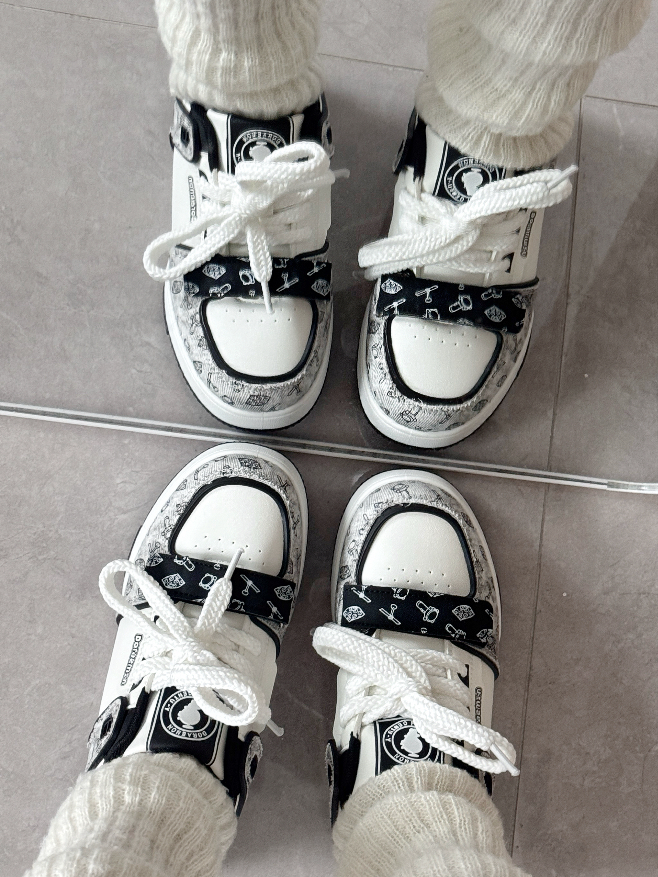 黑白配色板鞋尊滴好经典百搭~ 哆啦A梦涂鸦好复古童趣呀😊 鞋底很软 上脚软乎乎的好舒服哦 搭配阿迪外套一套松弛又帅气😎