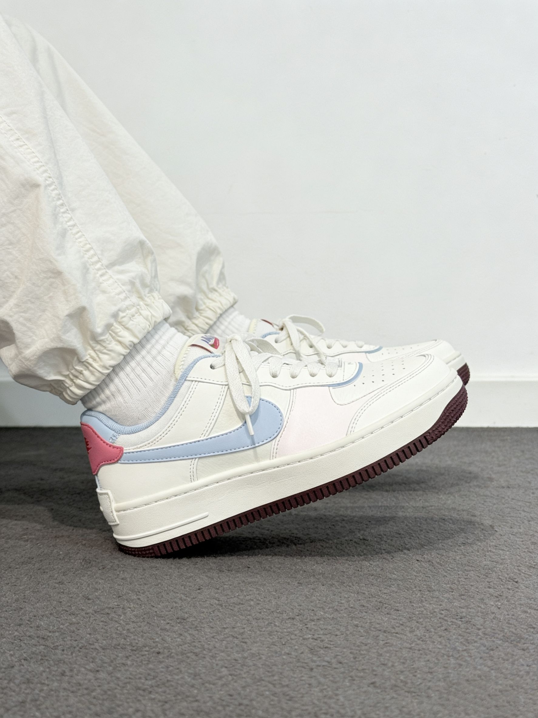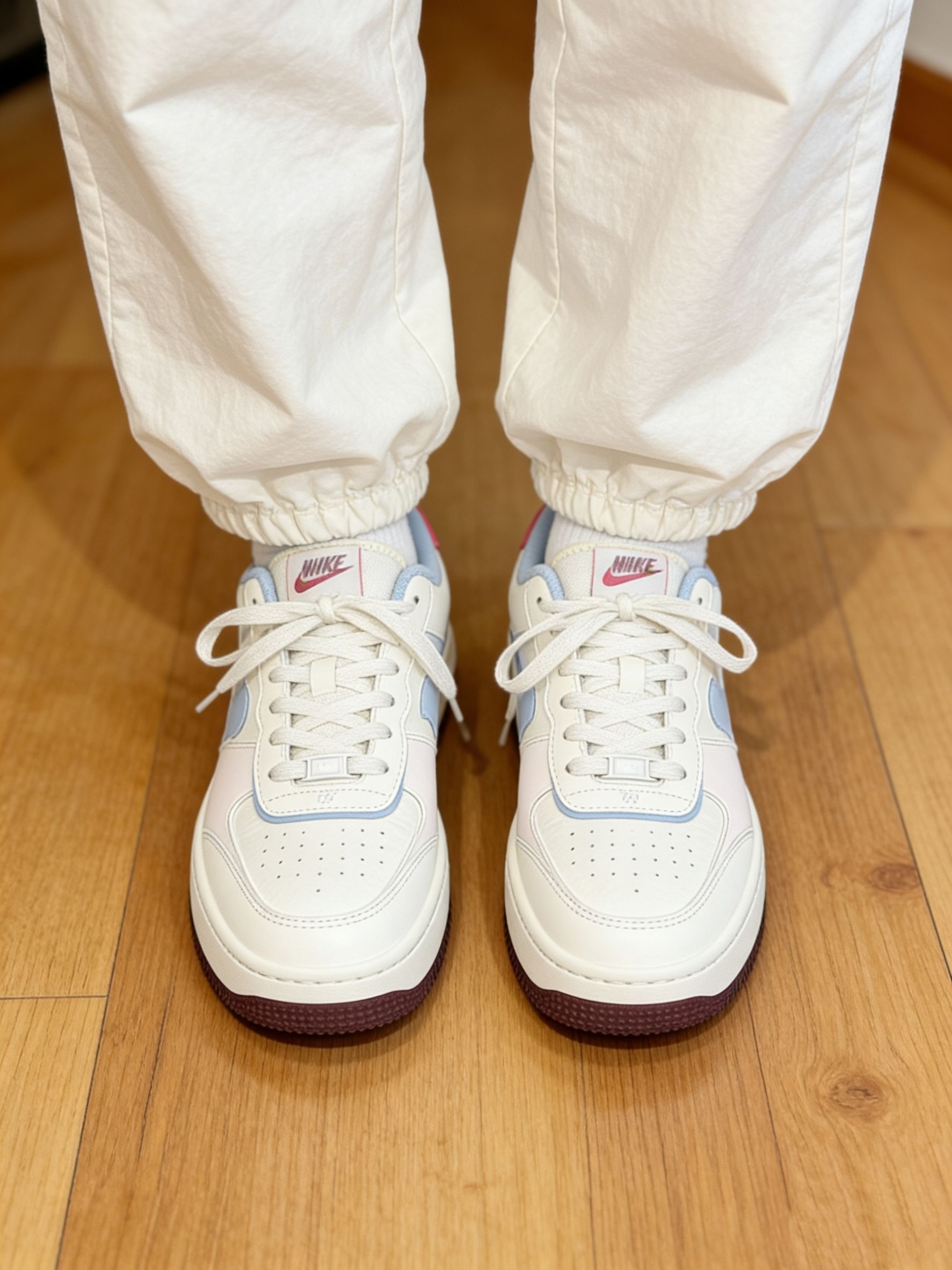 这双Nike AF1 Shadow 情人节限定款,第一眼就戳中了我的审美——奶白打底,搭配浅蓝勾与粉红点缀,像一杯刚拉花的马卡龙拿铁,温柔又高级。上脚后最惊喜的是它的“软弹感”,中底缓震像踩在云朵上,逛街两小时脚底也不累,鞋型偏宽但不臃肿,脚瘦的朋友建议垫个鞋垫。它的缺点也很真实:白色部分真的太容易脏了!稍微蹭点灰就很明显,得勤打理。 它最适合的场地是城市街头、咖啡馆、商场—— basicall...