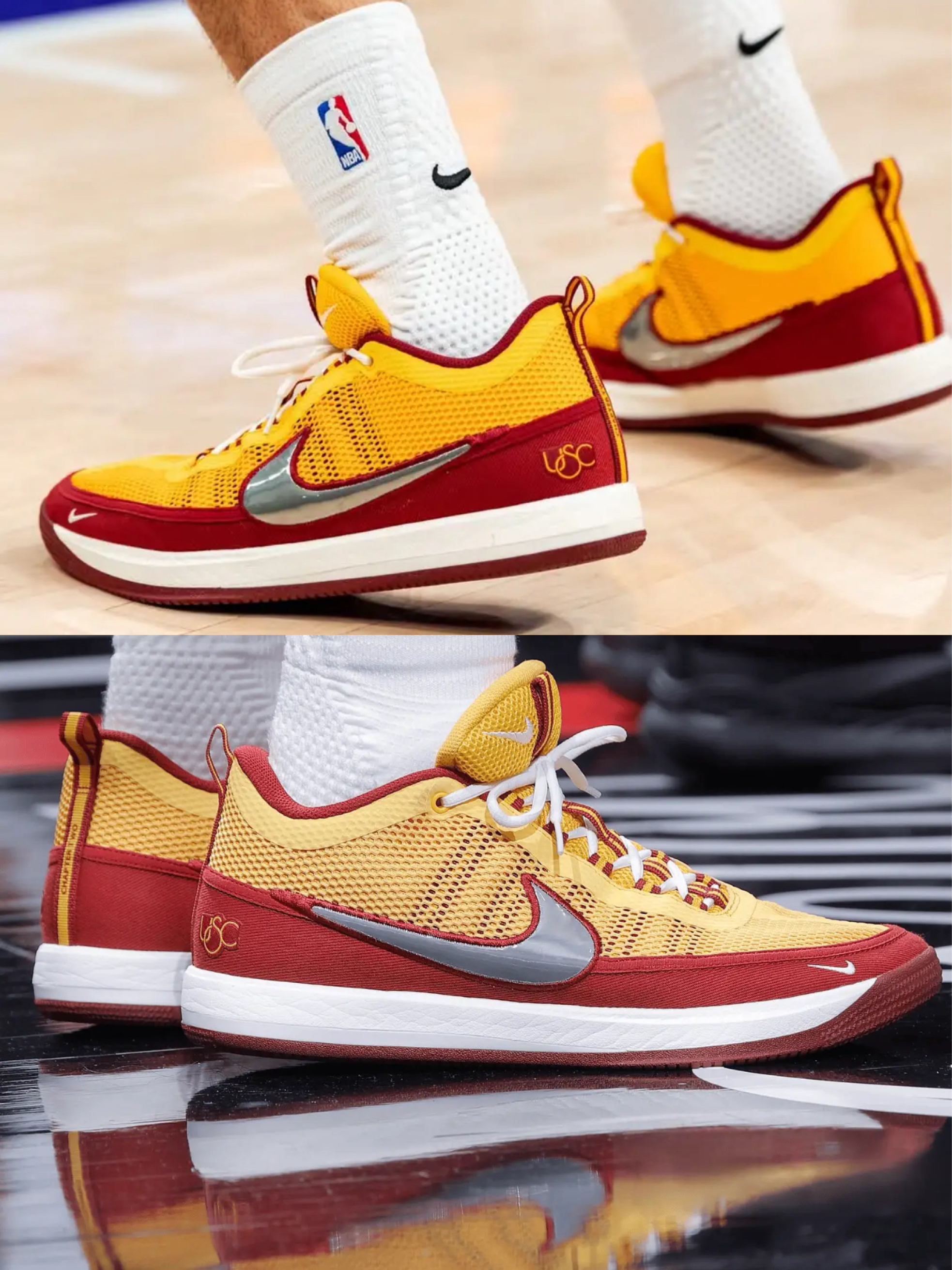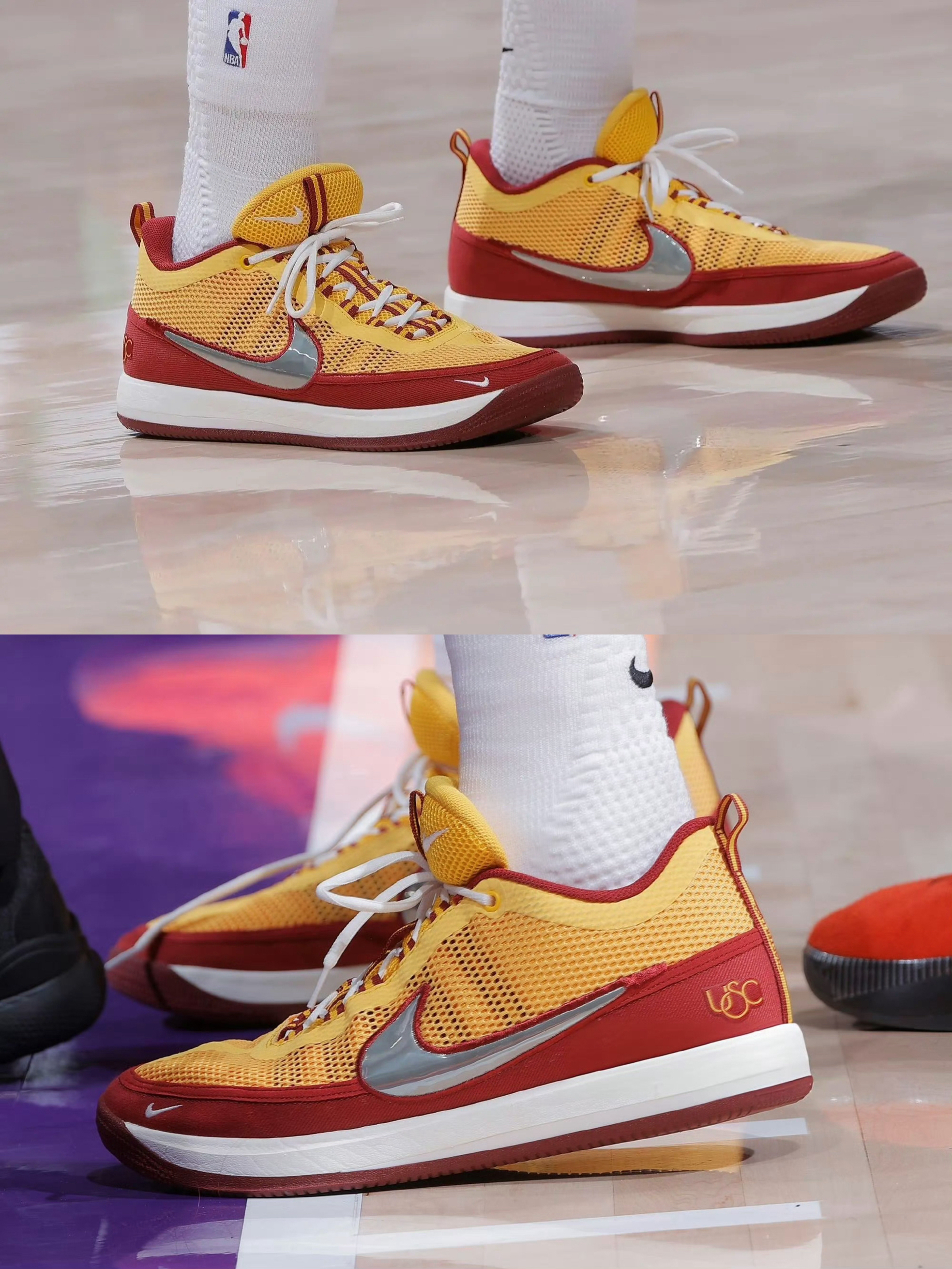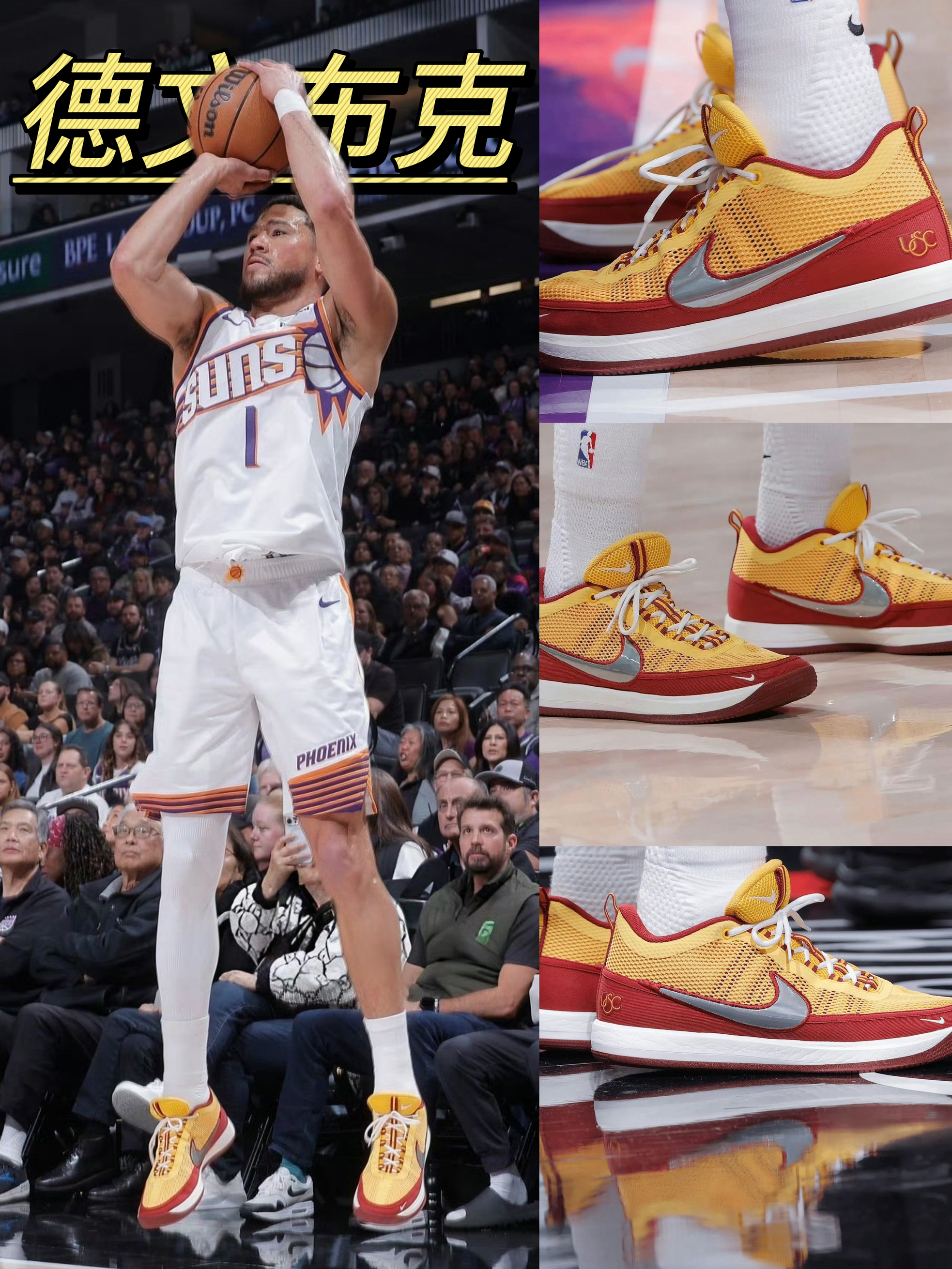 本场比赛,太阳队球员德文-布克出战31分钟,投篮19中6,三分球9中4,罚球1中1,得到17分4篮板6助攻。 这场比赛布克上脚南加利福尼亚大学特洛伊人配色Nike BOOK2“USC Trojans”PE