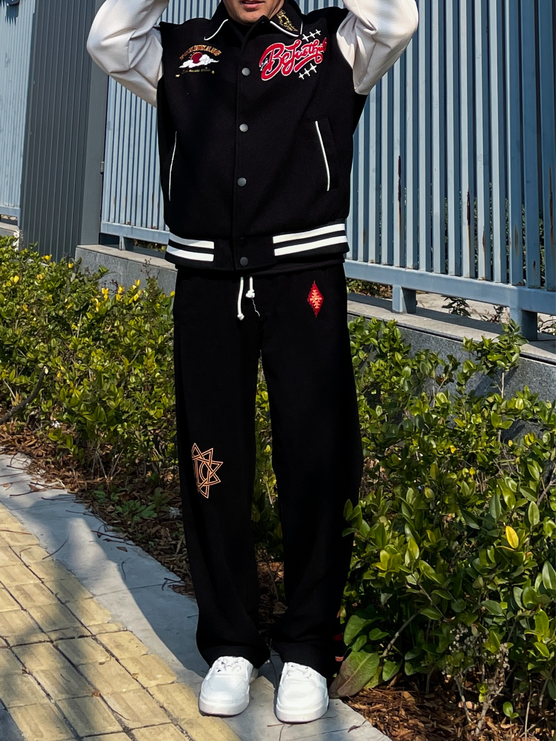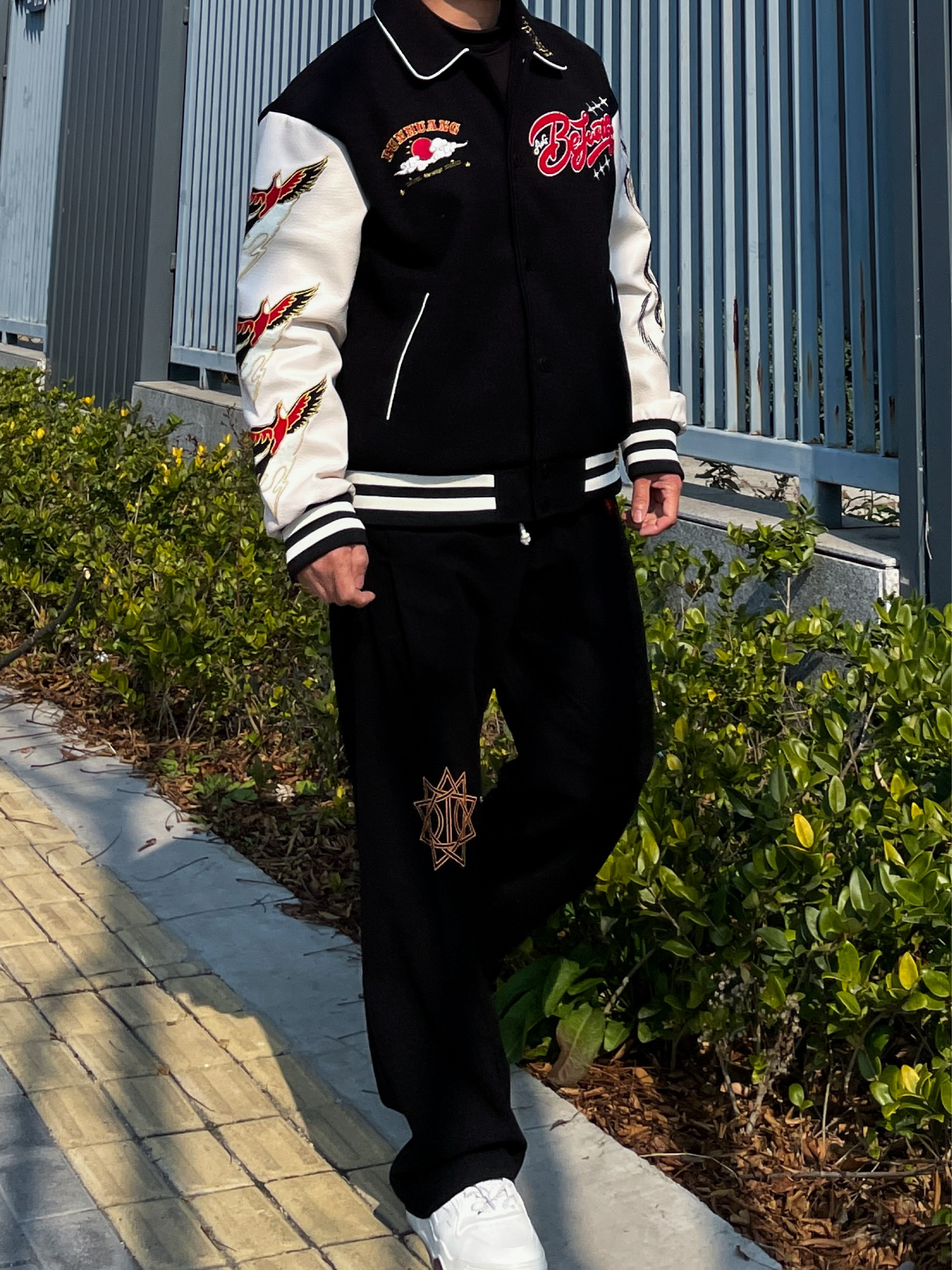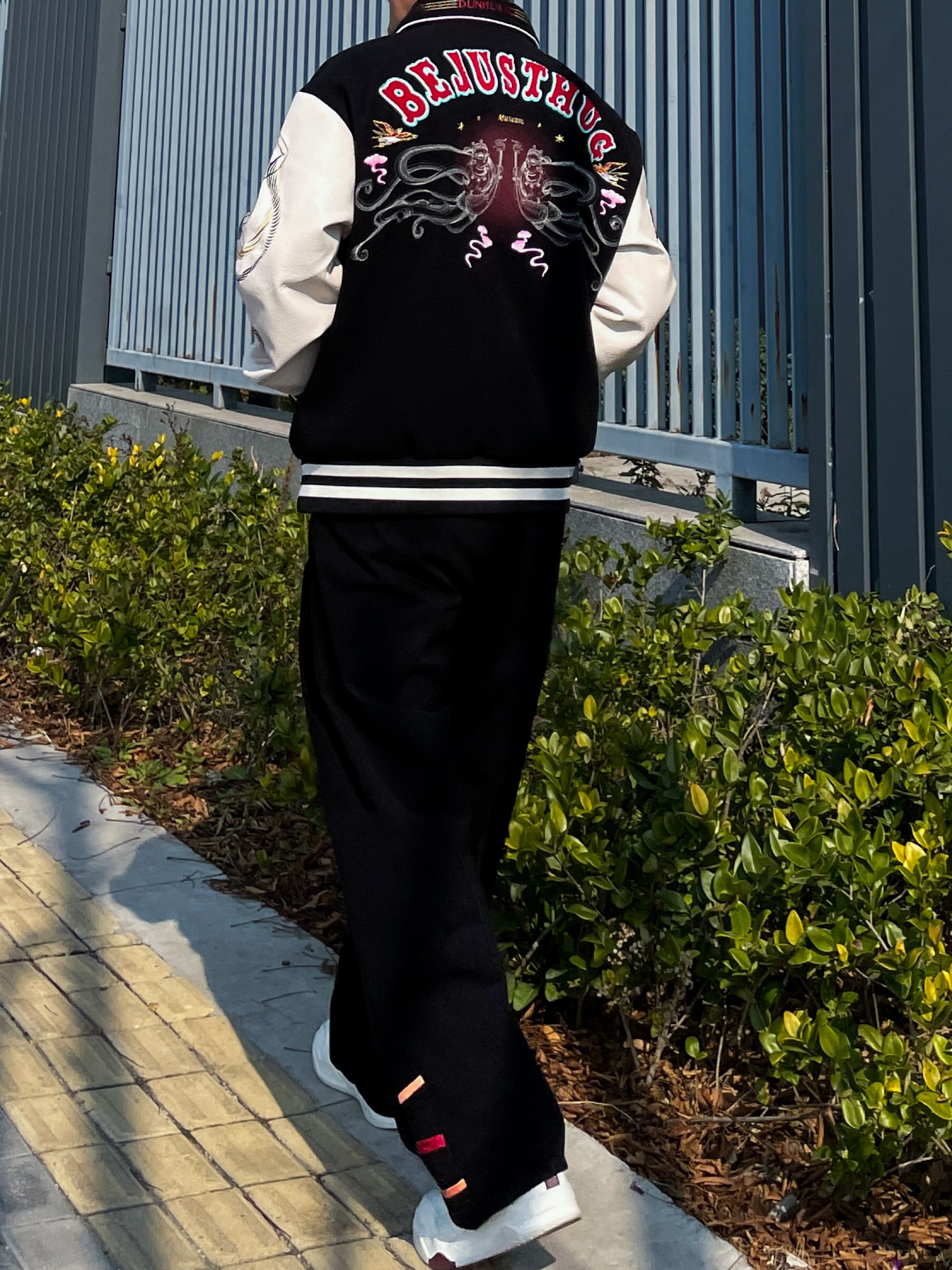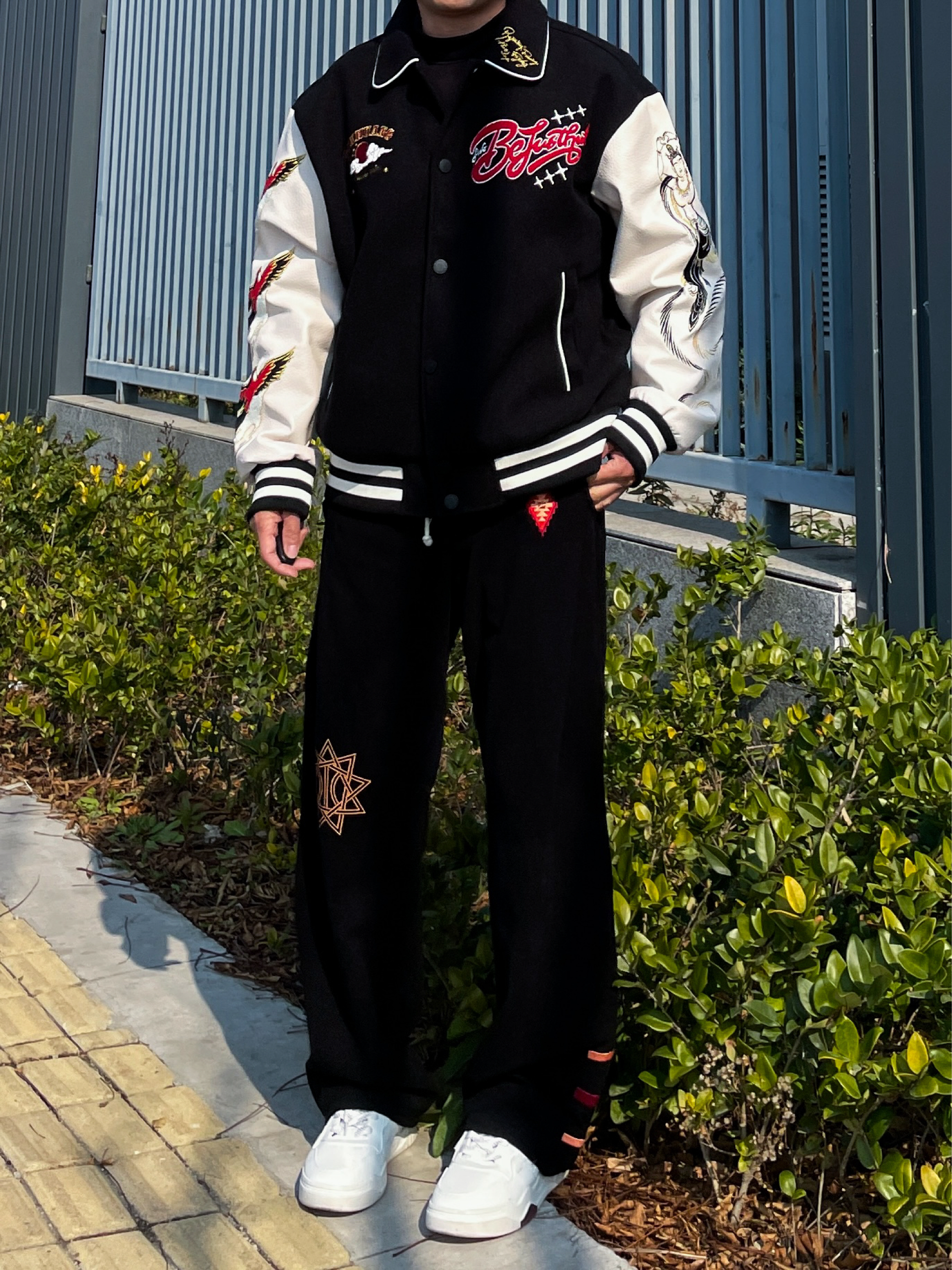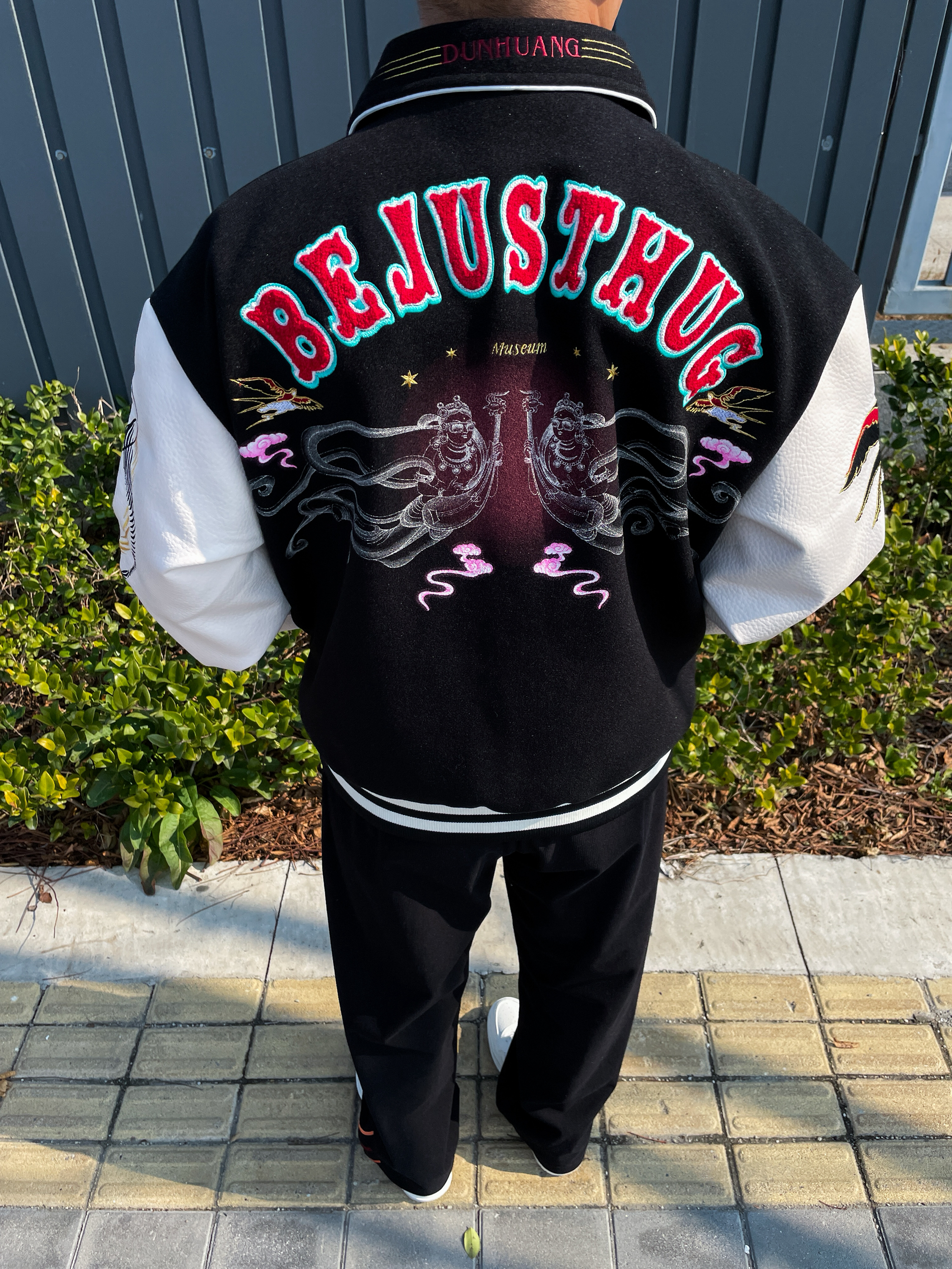 ❤️hi 宝子们好!🤌今日分享: 秋冬美式复古和国潮的碰撞,才是真的帅! 今天上身一件BEJUSTHUG敦煌联名棒球服,黑白撞色经典又吸睛 后背的飞天刺绣+彩色植绒字母,把敦煌壁画的氛围感直接拉满 袖子的仙鹤刺绣细节感爆棚,皮质拼接的面料挺括又有质感 内搭基础黑色打底,下身搭配同系列黑色刺绣卫裤 宽松垂坠的版型对各种身材都很友好,脚踩小白鞋整体造型利落不拖沓 这套兼具文化感与街头感的穿搭,日常出街...