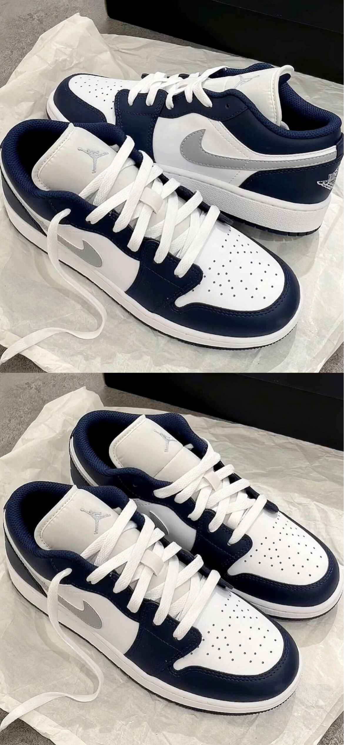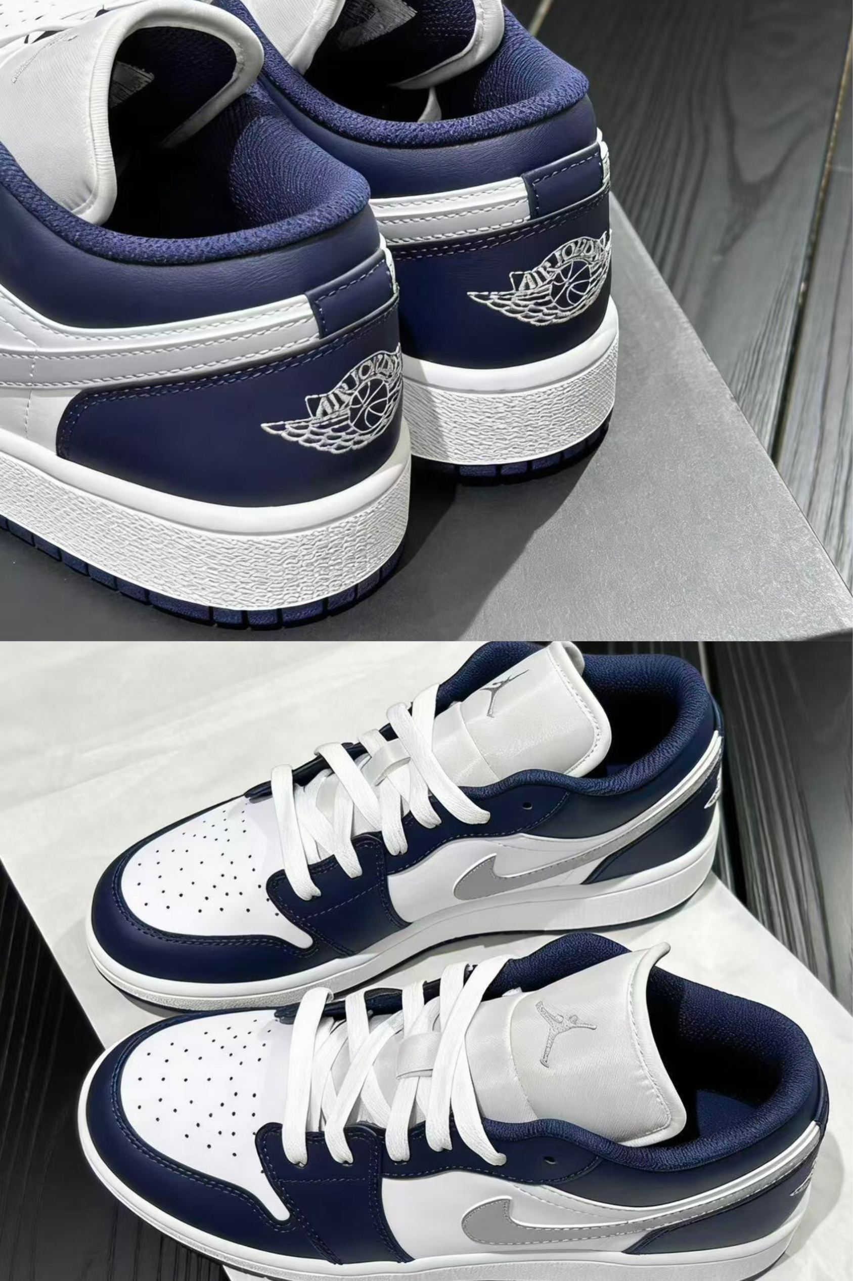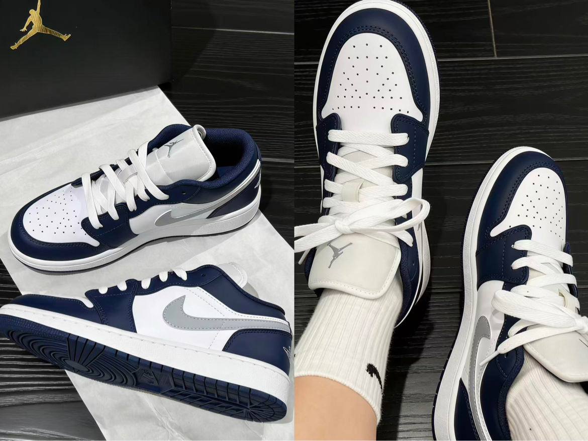 这双AJ1 Low藏青+白+银钩的配色很耐看,皮质细腻,走线工整,鞋型不臃肿。上脚包裹感不错,鞋底有一定支撑力,日常通勤、逛展走一天也不会太累。藏青和白色的撞色很适配牛仔裤、运动裤,银钩又添了点细节感,不挑风格。