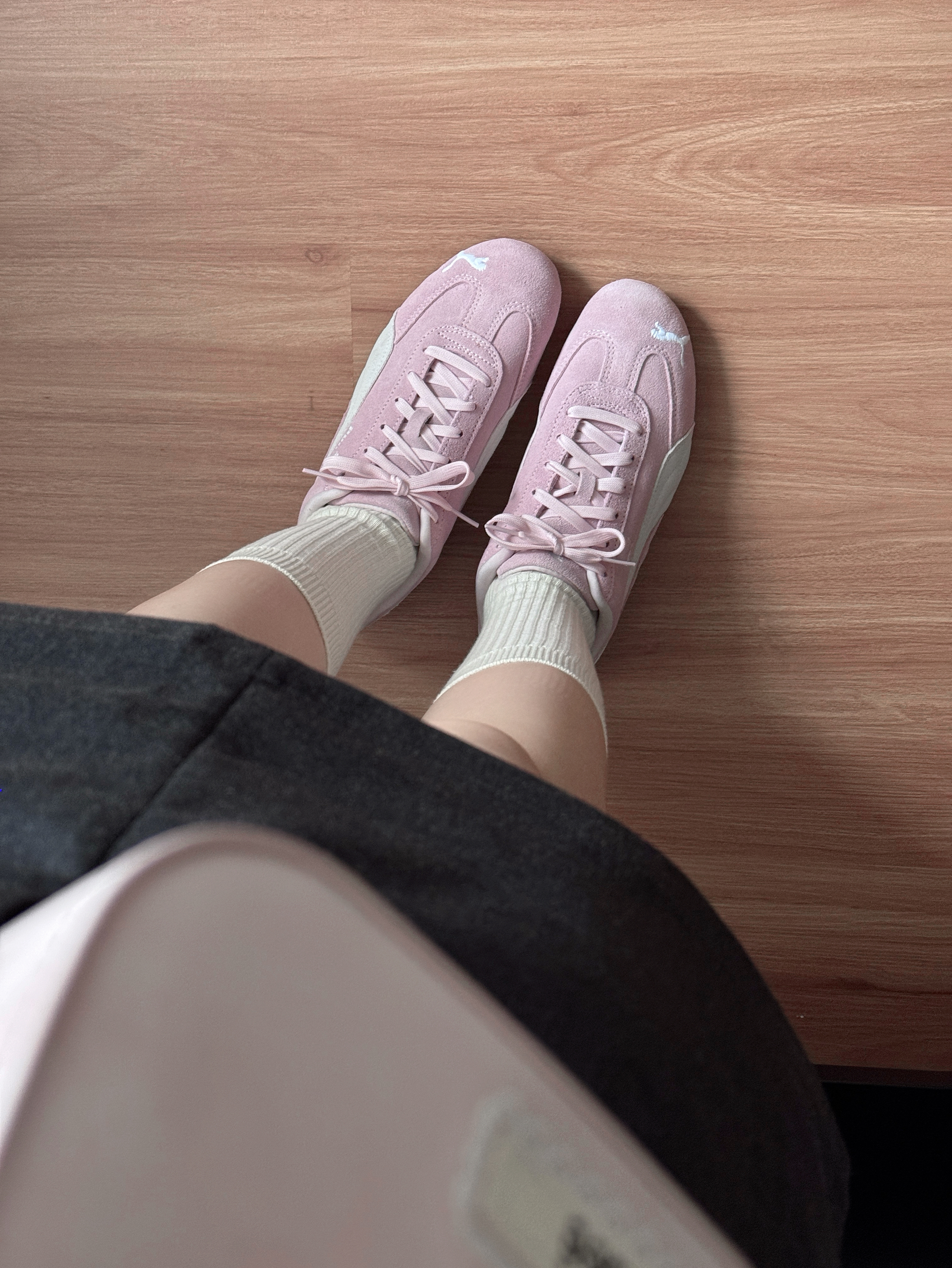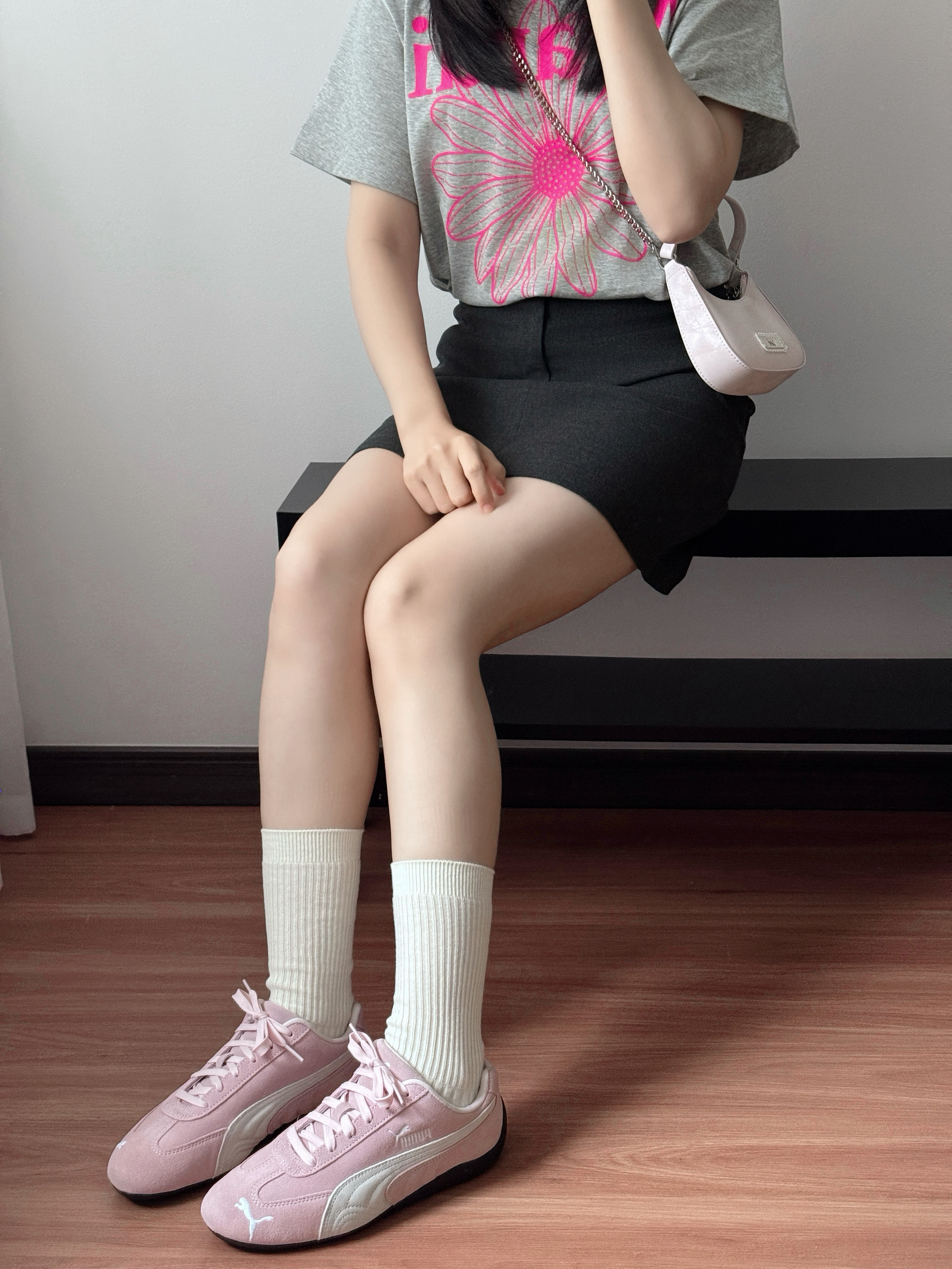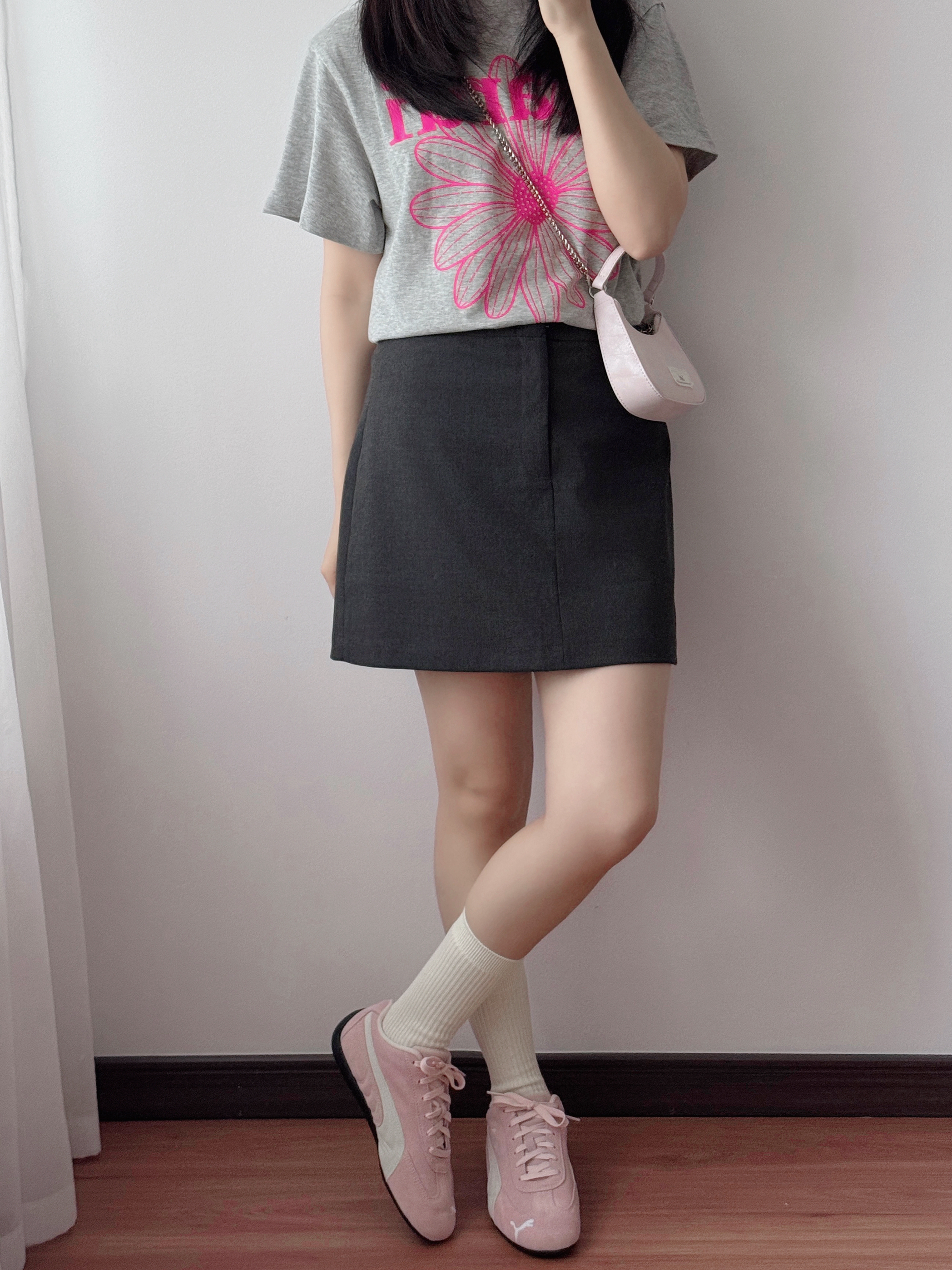 今日份粉粉嫩嫩早春穿搭~ 上jio贼显脚小,粉嫩嫩的颜色也太春天了吧💓 搭配奶油白中筒袜袜和灰色a字裙 早春氛围感满满💖 日常通勤或者约会穿都OK✨