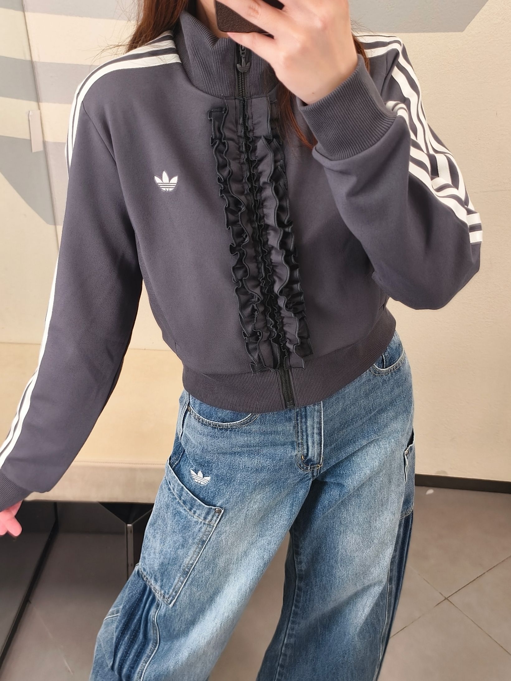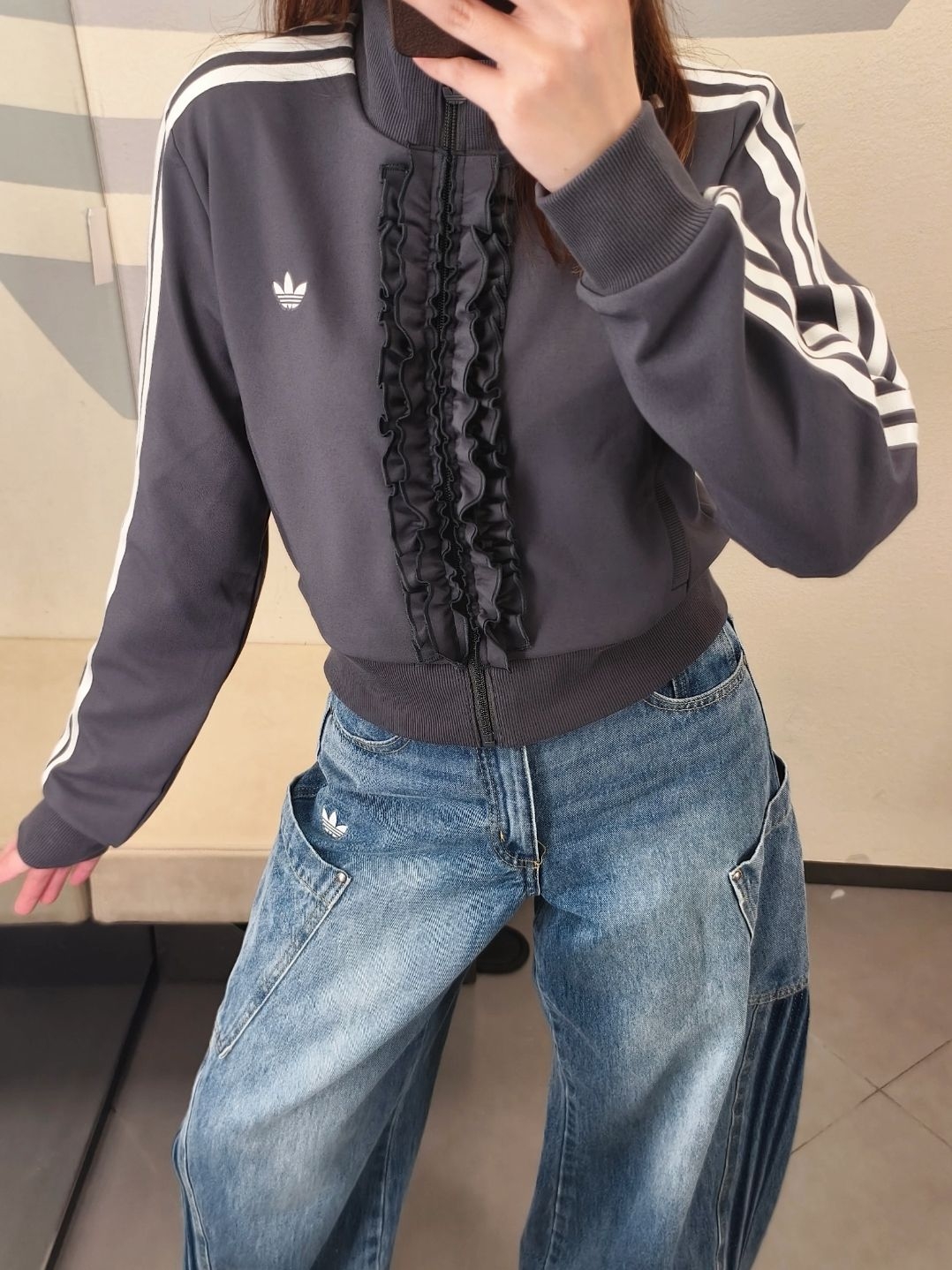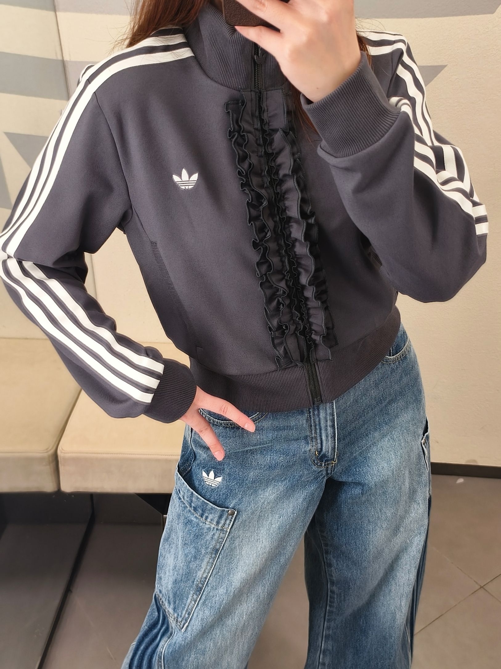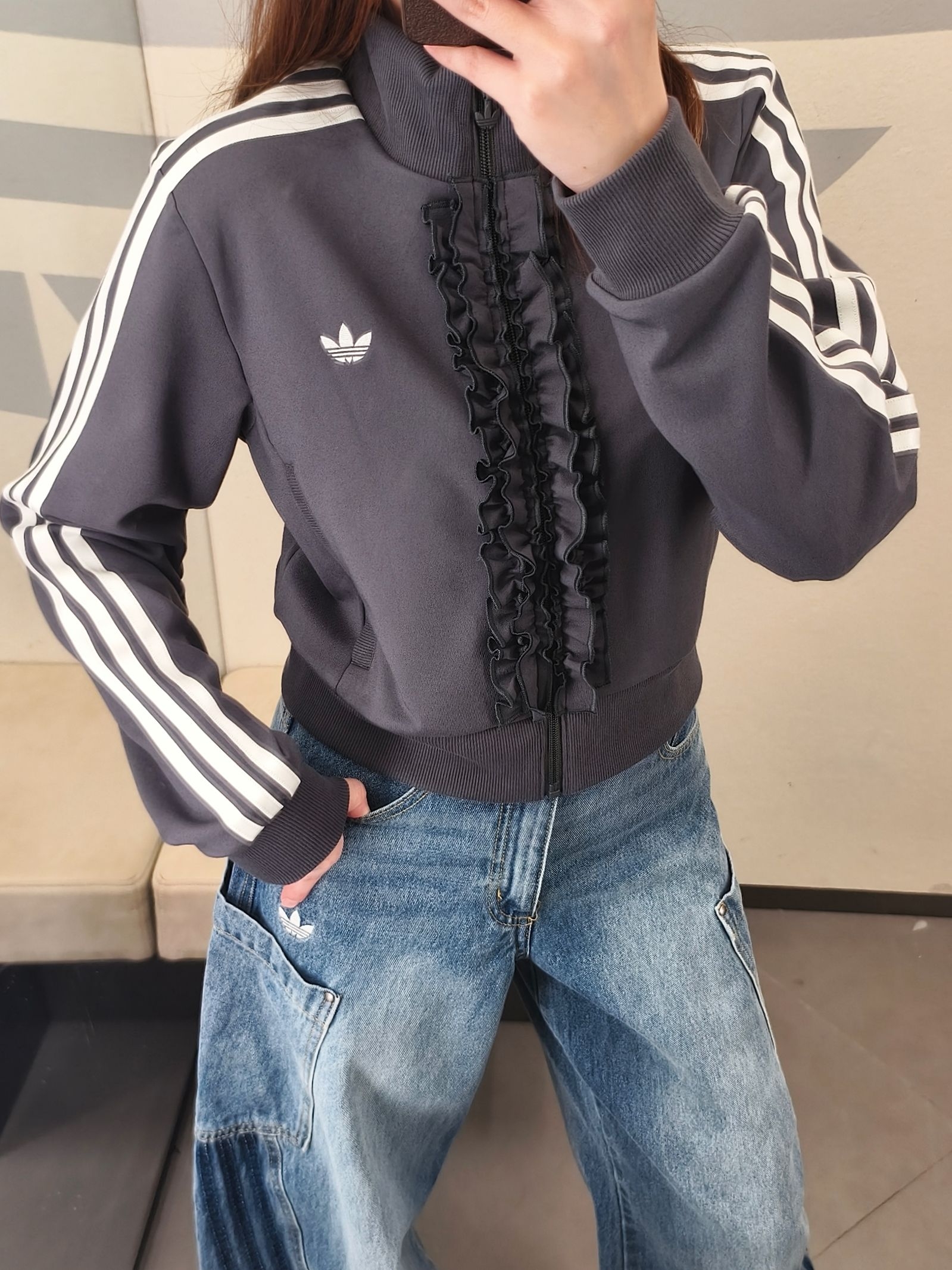 烟灰色针织面料软乎乎的☁️ 拉链荷叶边设计中和了运动感超甜🌸 短款立领版型,秒变三七分比例超显腿长📏 宋雨琦同款果然不踩雷✅ 三道杠辨识度拉满,出街回头率超高💯 搭工装牛仔裤,甜酷复古感直接拿捏🕰️