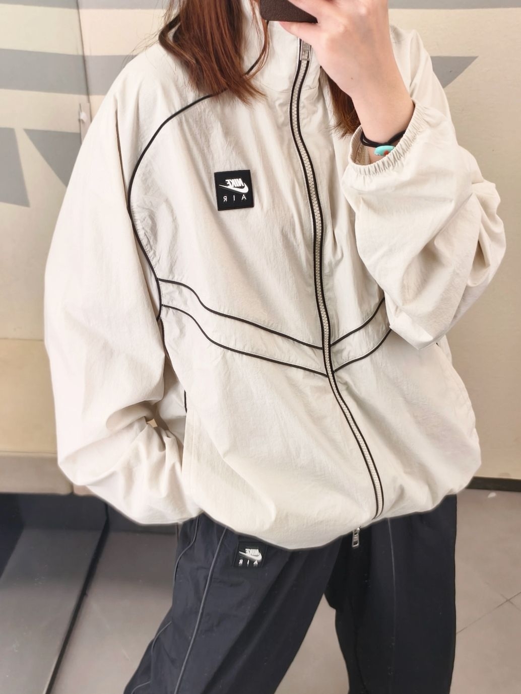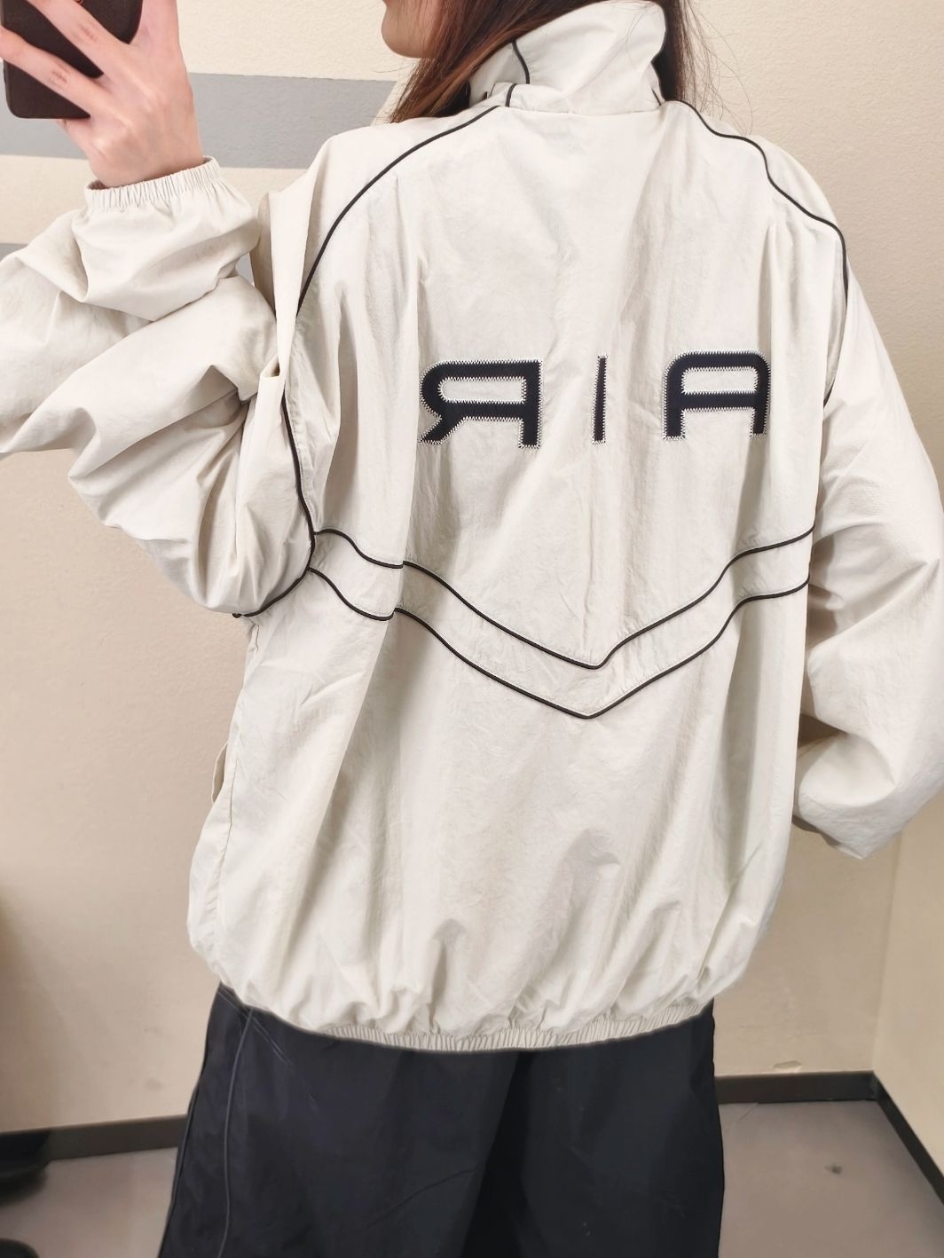 浅骨色上身好温柔呀🤍面料轻薄透气还能防风🌬️立领设计安全感直接拉满✨ 宽松剪裁对微胖超友好💛黑色明线勾勒超有层次感📐单穿叠搭都很出片📸 背后AIR大标太吸睛了😎梭织面料耐磨又好打理🧼通勤运动一套就搞定👌