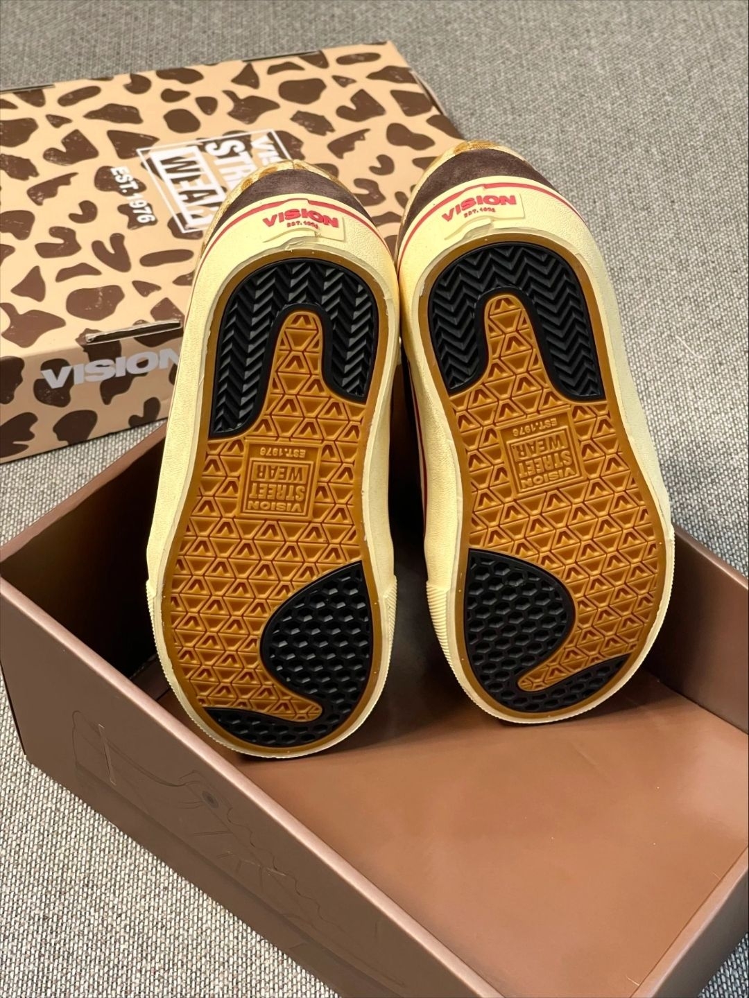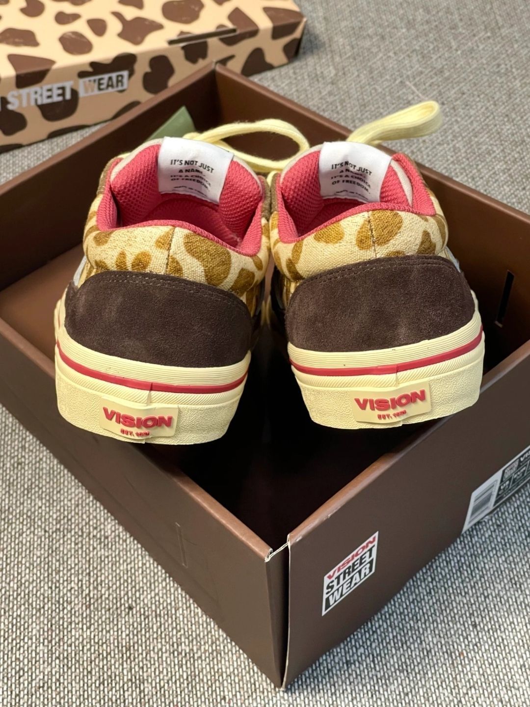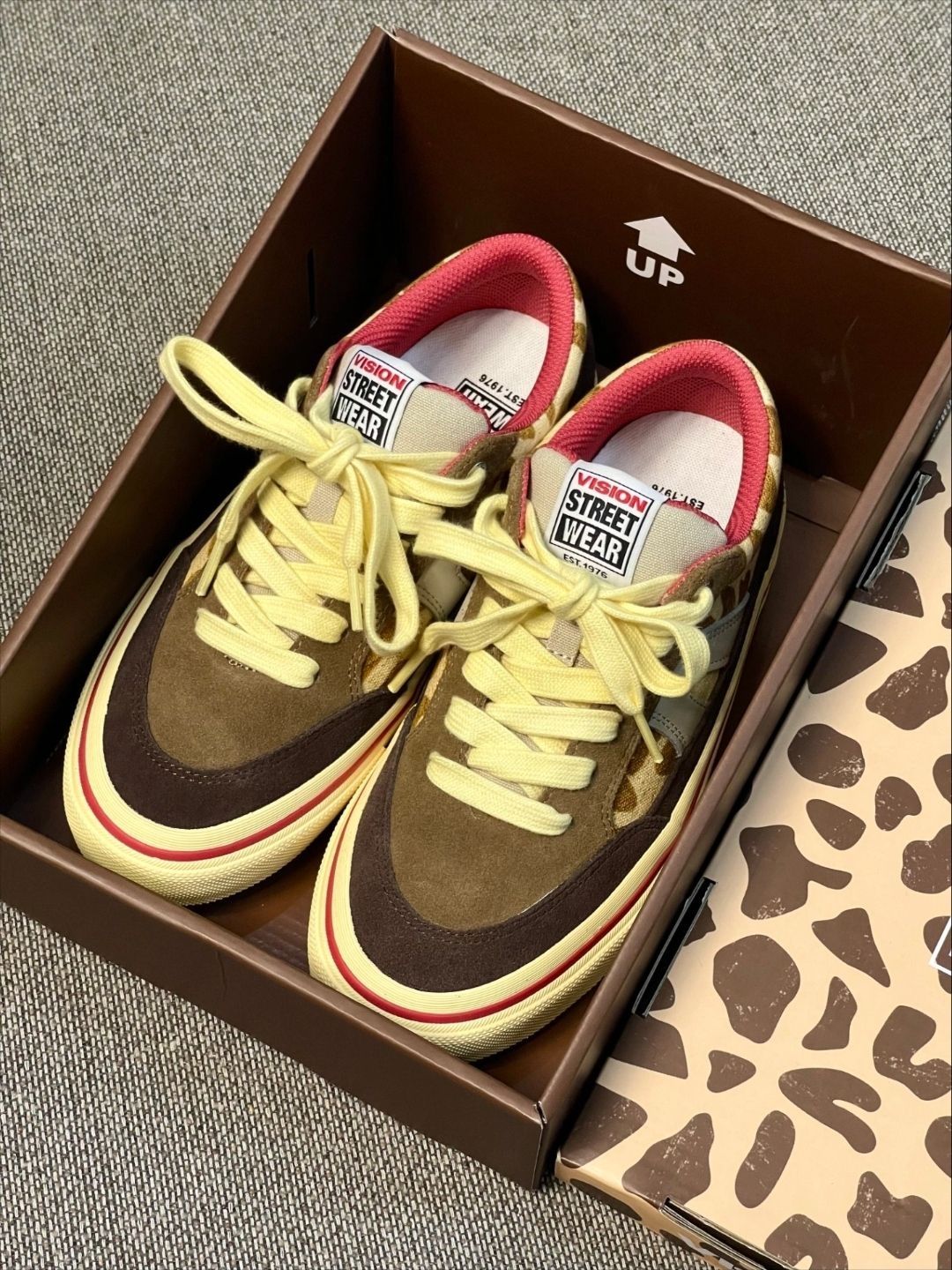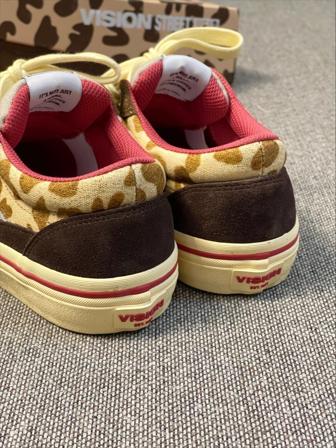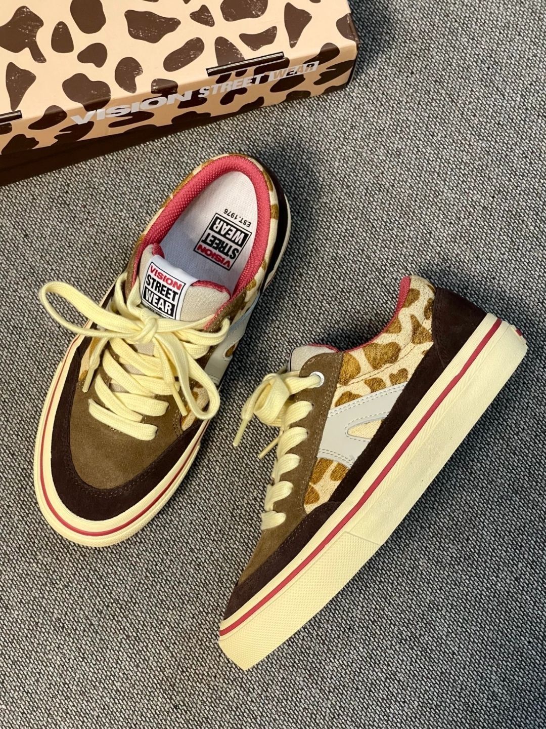 这双VISION的长颈鹿配色太对味了!翻毛皮+豹纹拼接,鞋舌和内衬都是正红色,撞色很有复古街头感。搭工装裤、牛仔裙都很出片,滑板、逛潮展、citywalk都能穿,脚感软弹,走久了也不磨脚,是我近期出门的首选鞋款👟🔥