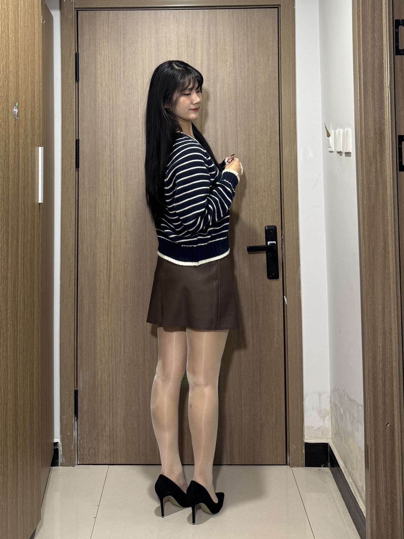 经典蓝白条纹针织衫,慵懒V领勾勒线条,搭配咖色皮裙,利落又显质感。踩上黑色细跟高跟鞋,温柔中带着干练气场,日常通勤或小聚都适配。取悦自己的穿搭,从来都最动人。
