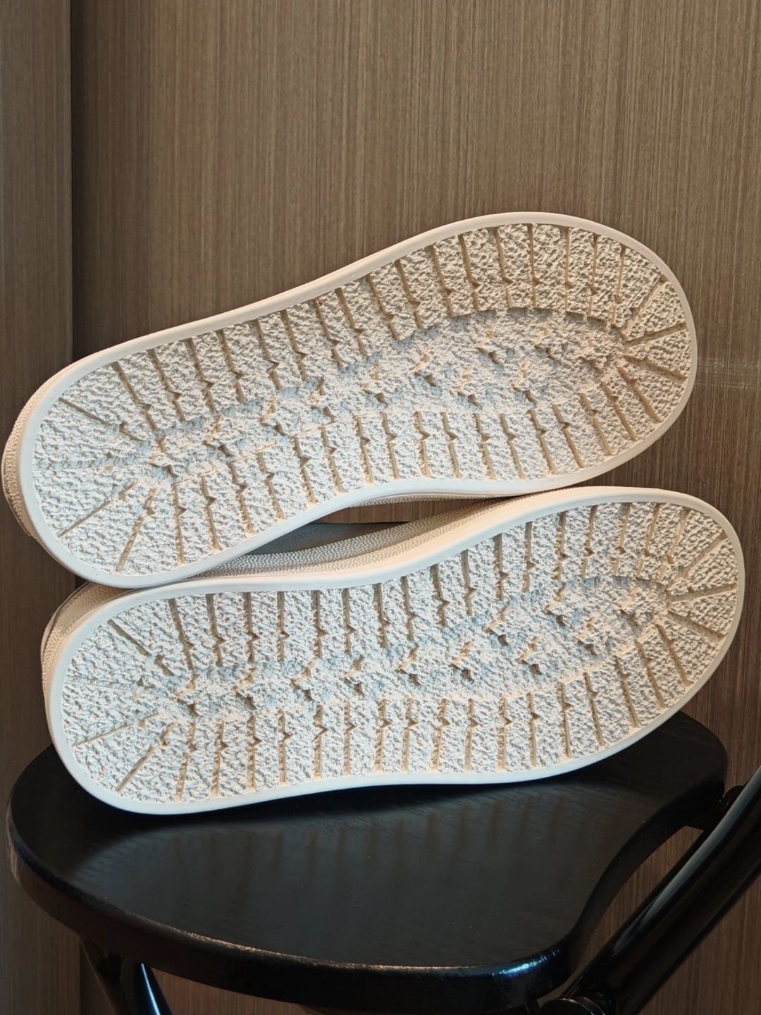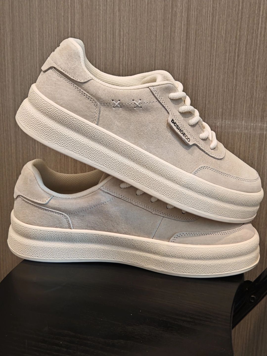 这双浅咖板鞋麂皮质感很软,冬日搭大衣、牛仔裤都不违和。42码正码入,脚感偏软,鞋垫有回弹,走久了不累脚,得勤打理,整体性价比还不错。