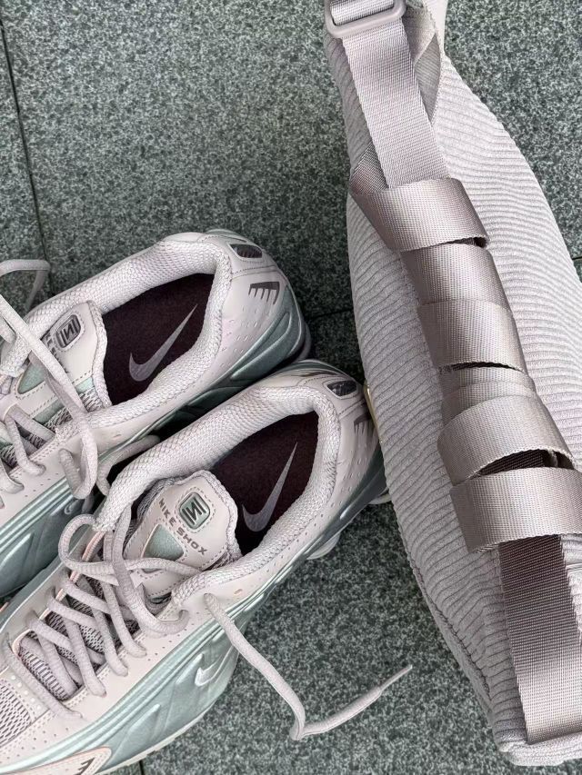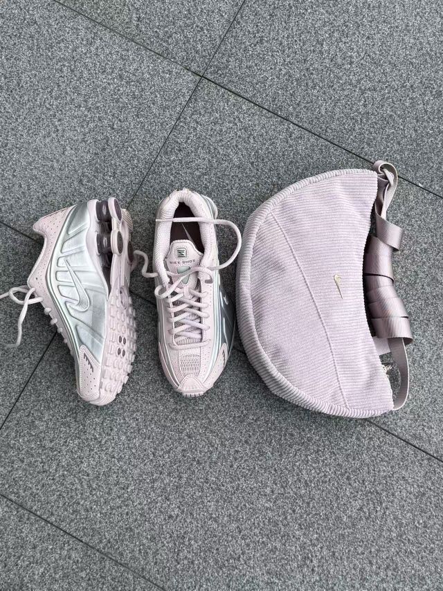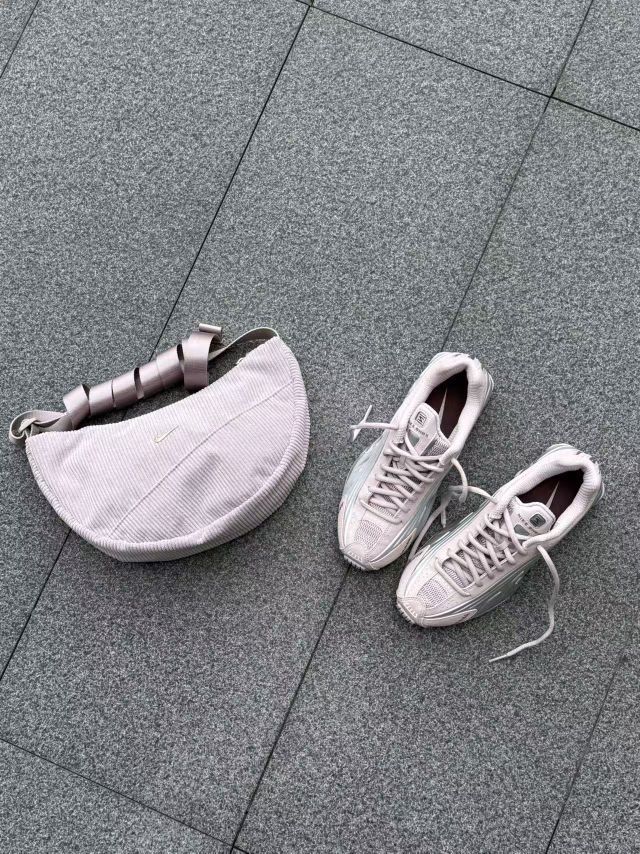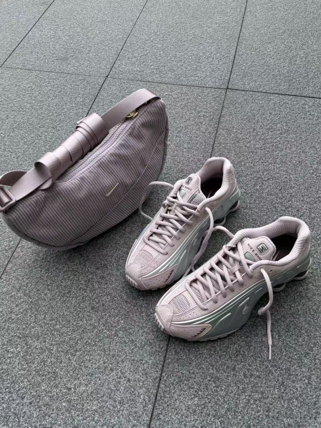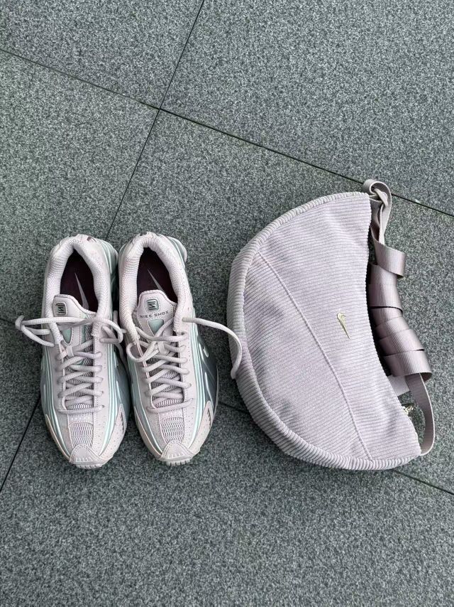 千禧年的科技感回潮真的太香了!这双Nike Shox的淡粉紫渐变,搭配同色系灯芯绒腋下包,甜酷感直接拉满💖