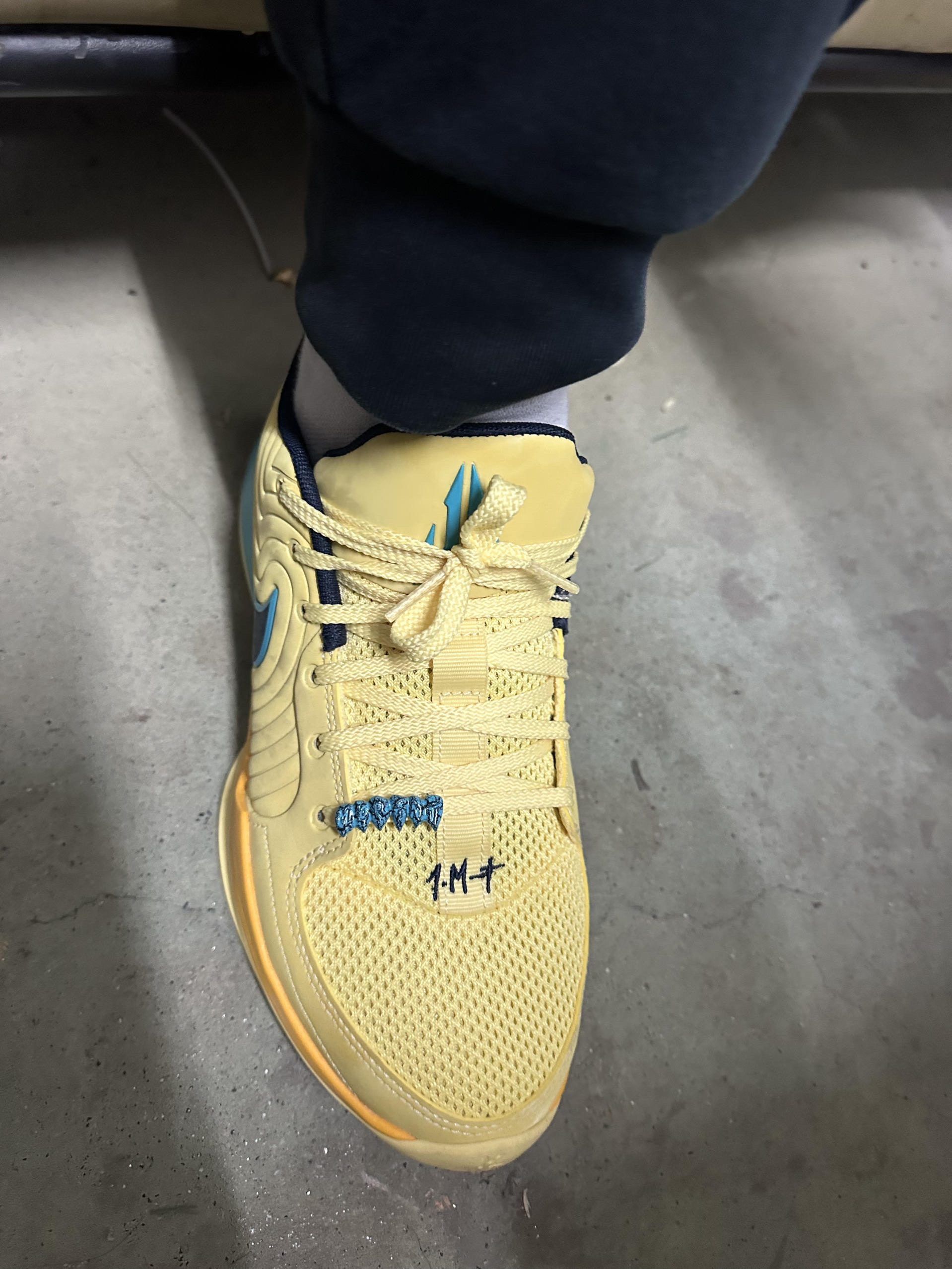 刚拿到莫兰特2代篮球鞋的第一眼,直接被这抹奶油黄戳中了!鞋身的嫩黄主调像剥开的芒果班戟,柔和又不张扬,搭配鞋侧藏青勾标和鞋跟渐变蓝的气垫,撞色高级得不像千元内的球鞋。鞋头的编织网面带着细腻的纹理,光线底下还会泛出淡淡的珠光,系上同色系鞋带后,鞋舌处的“JA”字母刺绣又添了点小细节。上手摸的时候,鞋身的网布软乎乎的,不像其他球鞋那么硬挺,捏一下还能感受到内里的海绵填充。鞋帮处的麂皮拼接触感超细腻,边...