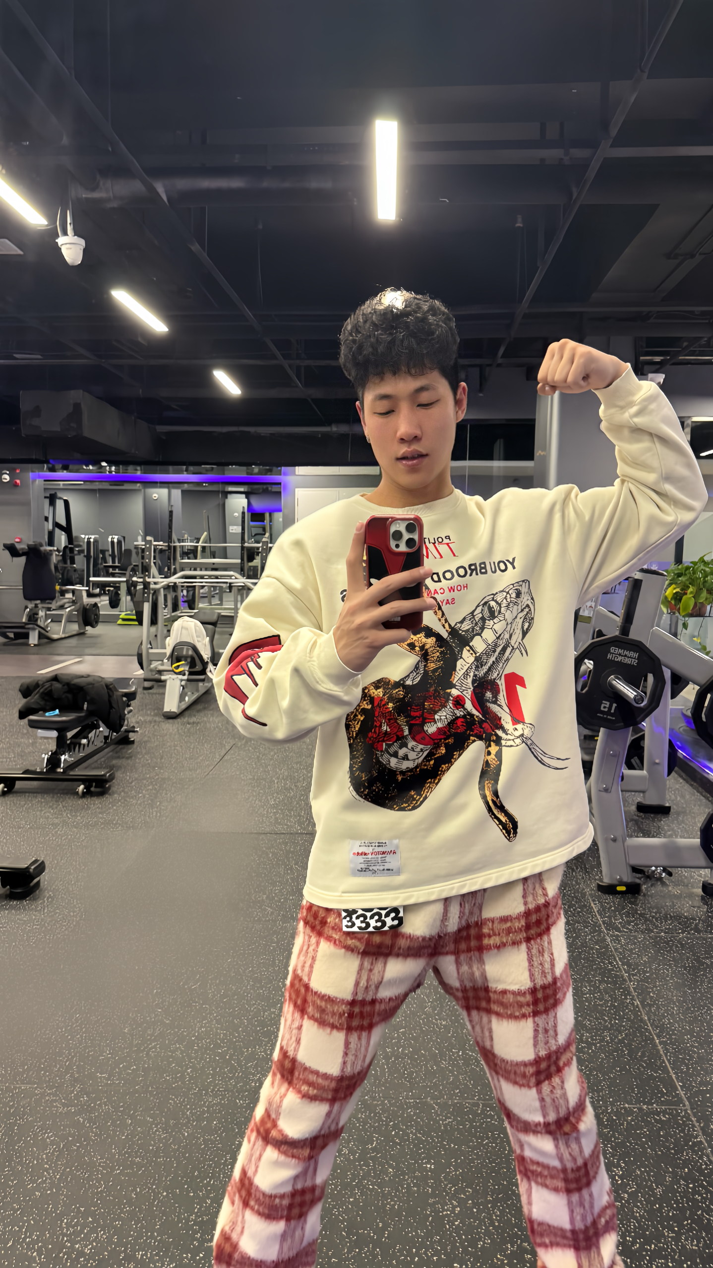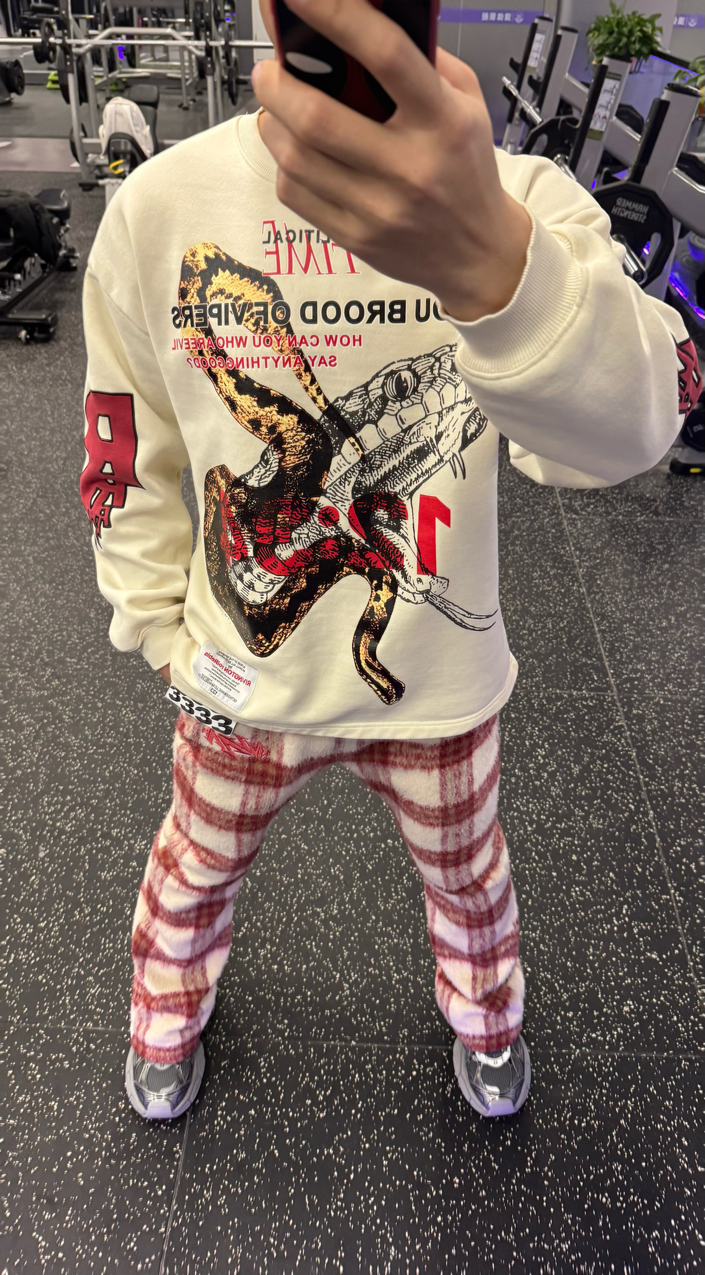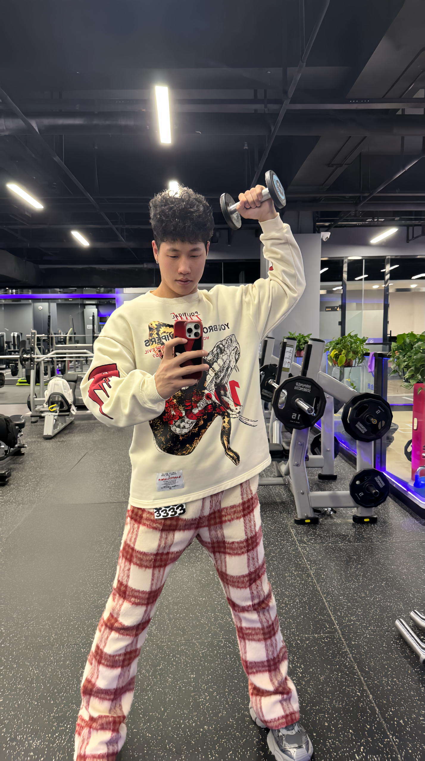 练背日这套穿搭直接封神!VAKA红格纹阔腿裤版型巨顶,软糯有弹性,深蹲硬拉无束缚,毛呢质感高级又吸汗。搭配RRR123蟒蛇发泡印花卫衣,宽松藏肉不挑身材,印花设计辨识度拉满,运动拍照两不误。 脚下踩Balenciaga 3XL做旧老爹鞋,复古厚底自带增高buff,街头感直接拉满。背上STK白蛇断处双肩包,容量够用颜值在线,整套搭配氛围感十足。 健身房不只有速干衣,潮人健身也要穿得有态度!颜值与...