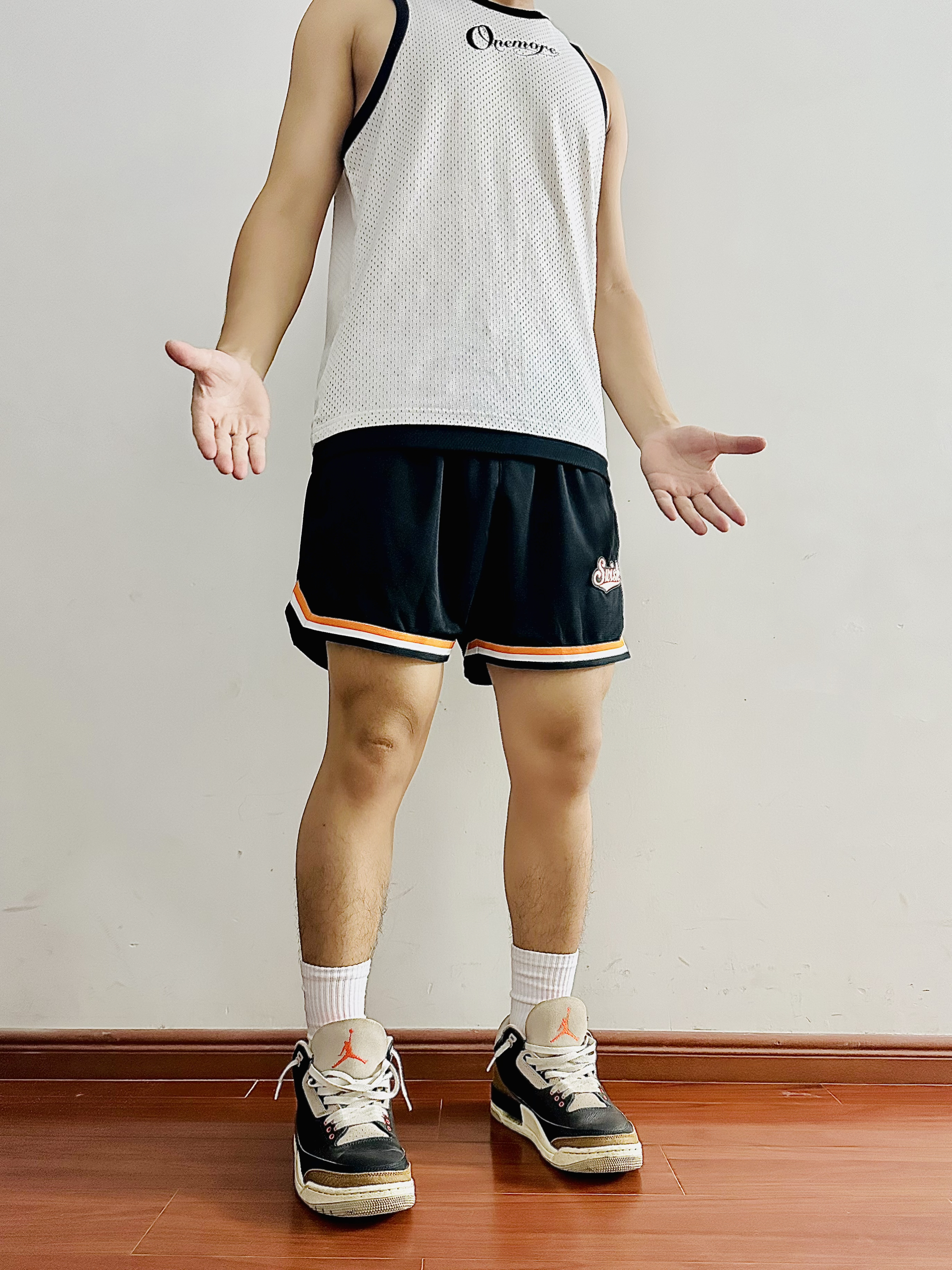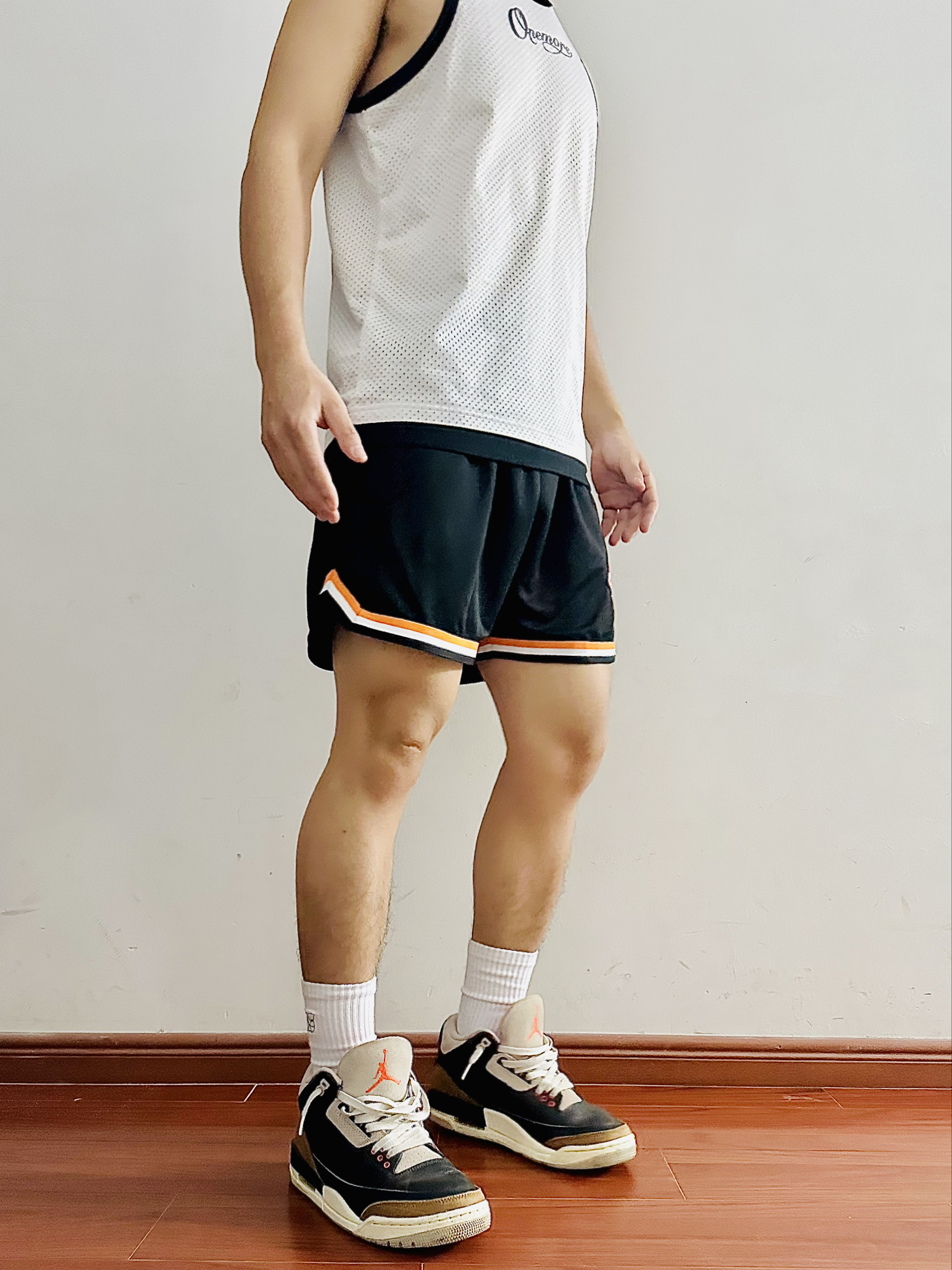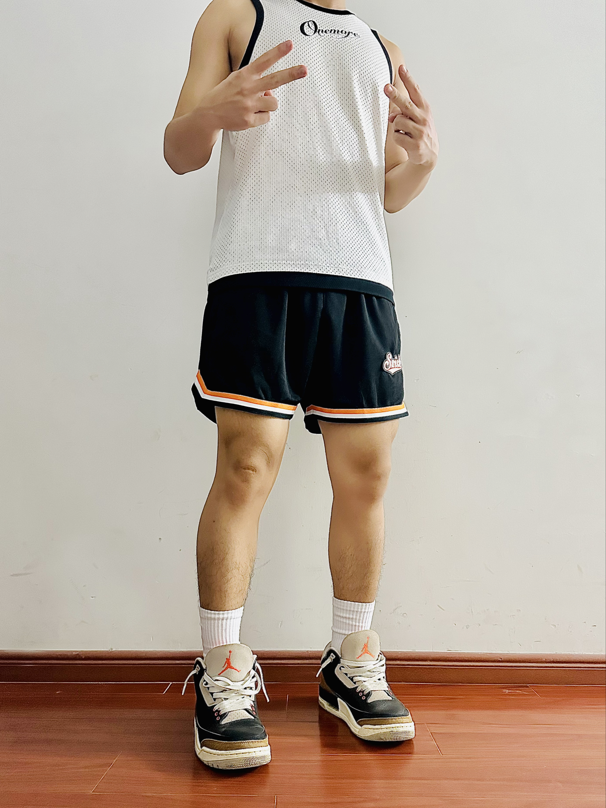 白色背心➕黑色三分短裤➕AJ3篮球鞋 🩳: SWISH THE BALL IN 美式短裤 裤子采用美式三分的版型 长度刚好可以秀出我大腿肌肉🦵🏻 打球做动作的时候也不会感觉有束缚感👍🏽 面料轻薄透气 上身舒适透气 黑色加上橙色条纹点缀 复古感十足💯 尺码推荐:170 65㎏ 选择尺码:M码