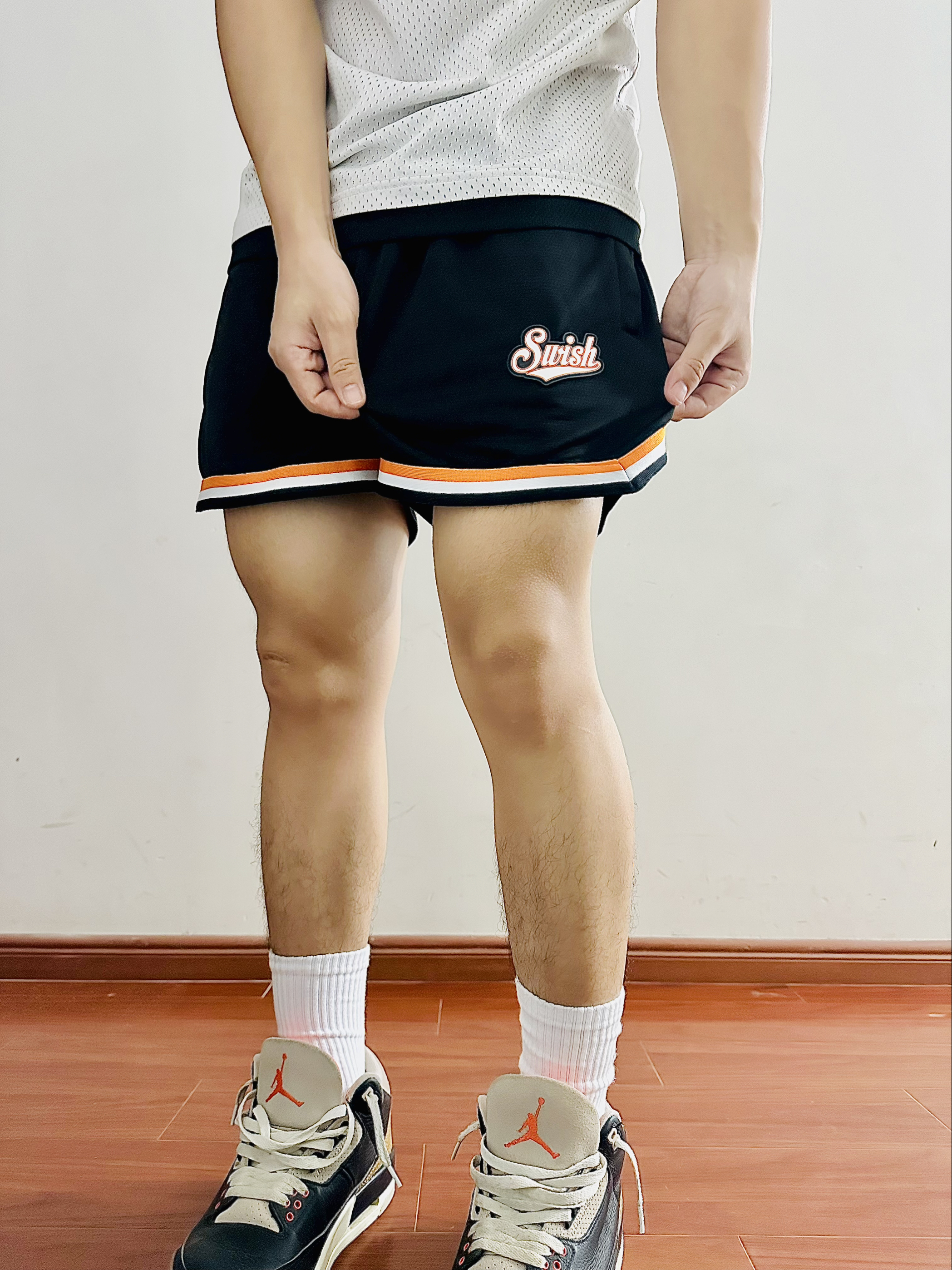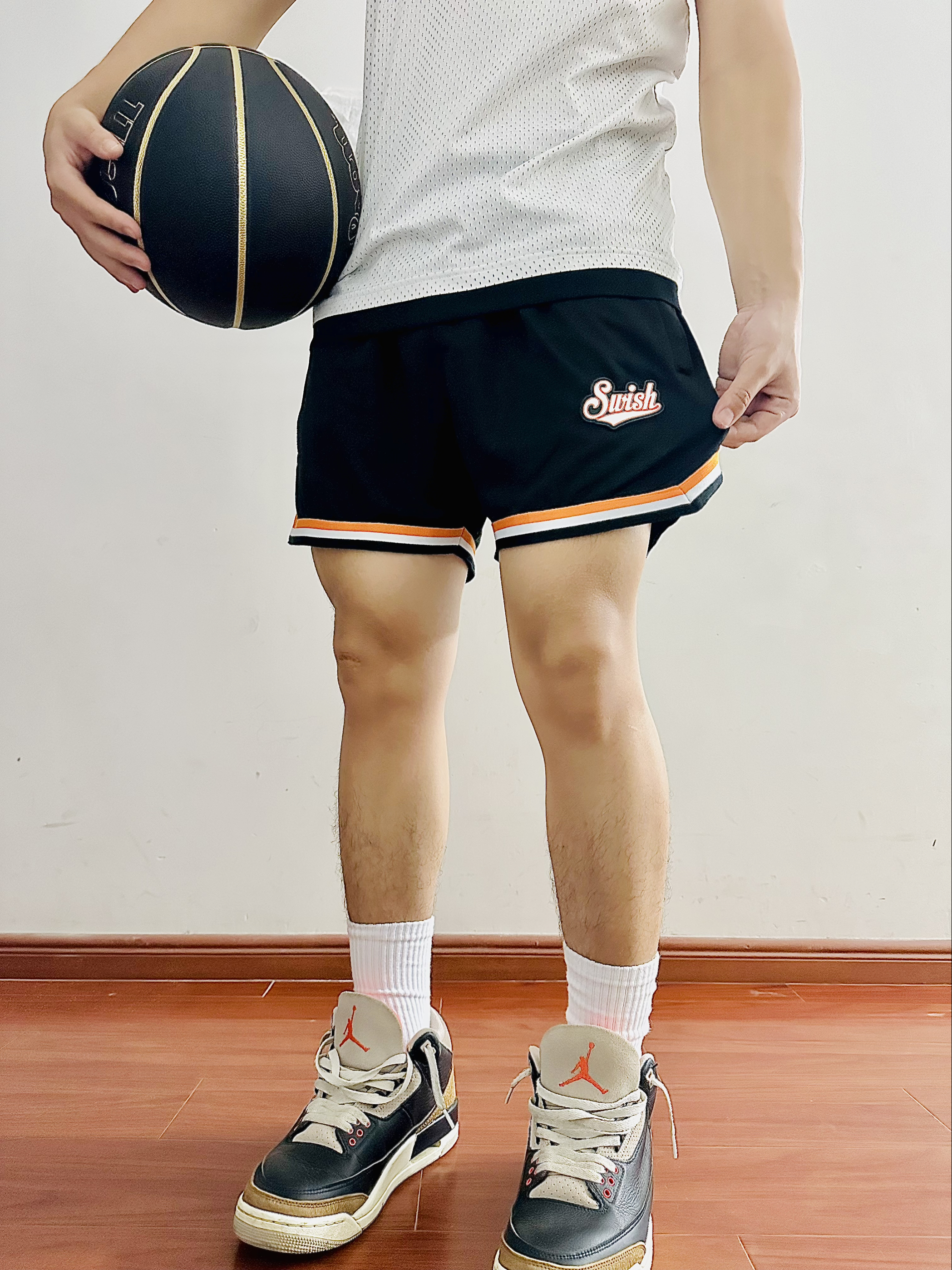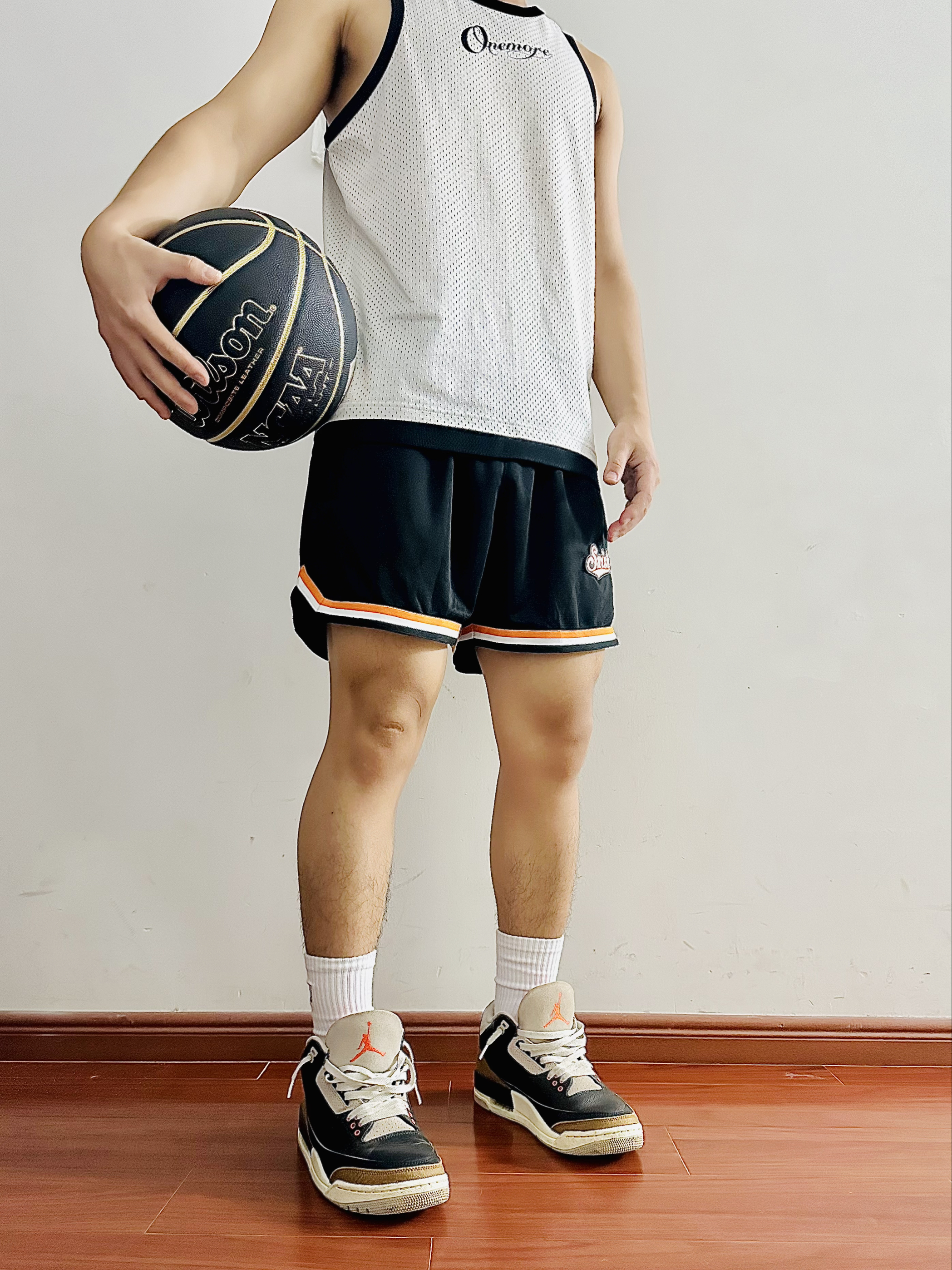 白色背心➕黑色三分短裤➕AJ3篮球鞋 🩳: SWISH THE BALL IN 美式短裤 裤子采用美式三分的版型 长度刚好可以秀出我大腿肌肉🦵🏻 打球做动作的时候也不会感觉有束缚感👍🏽 面料轻薄透气 上身舒适透气 黑色加上橙色条纹点缀 复古感十足💯 尺码推荐:170 65㎏ 选择尺码:M码